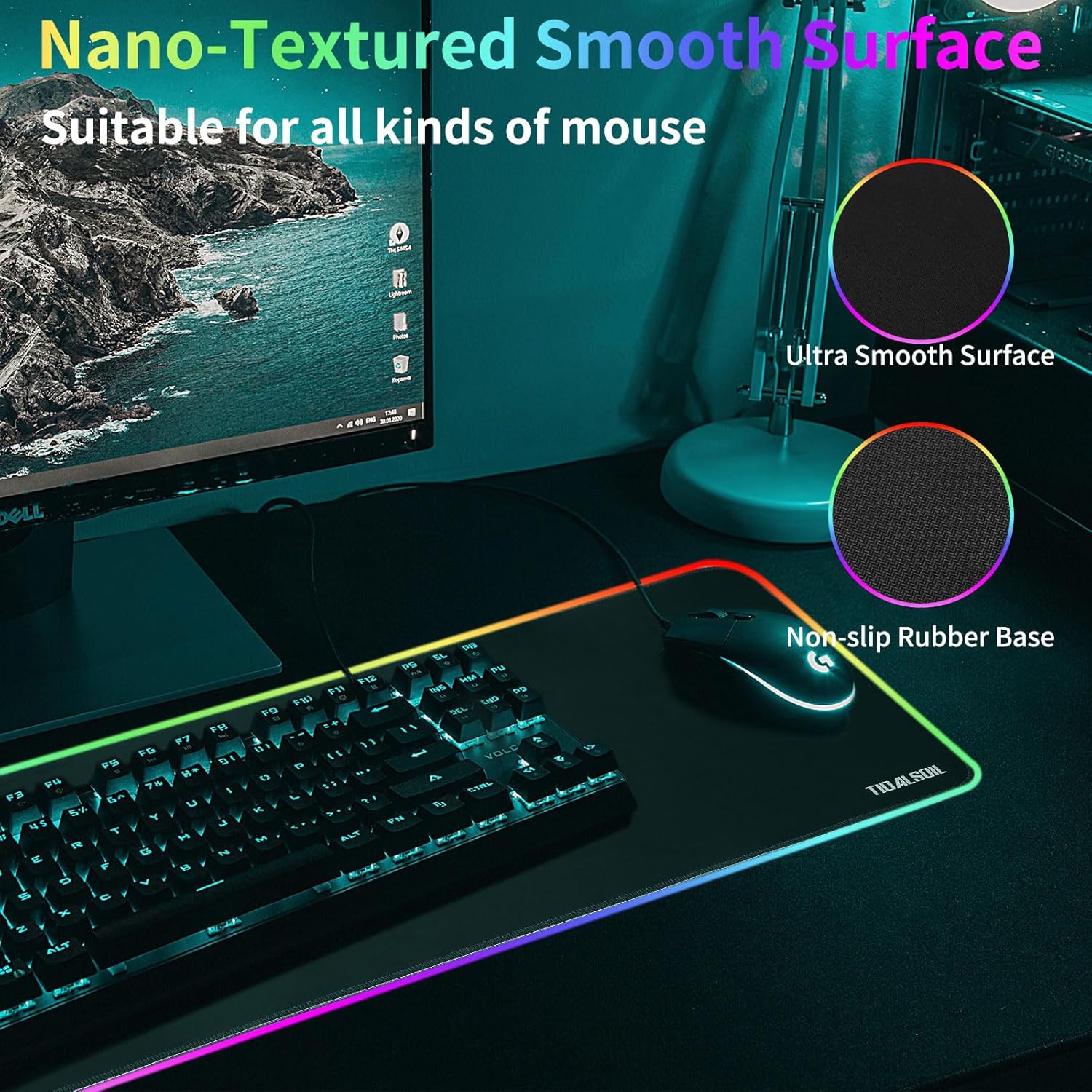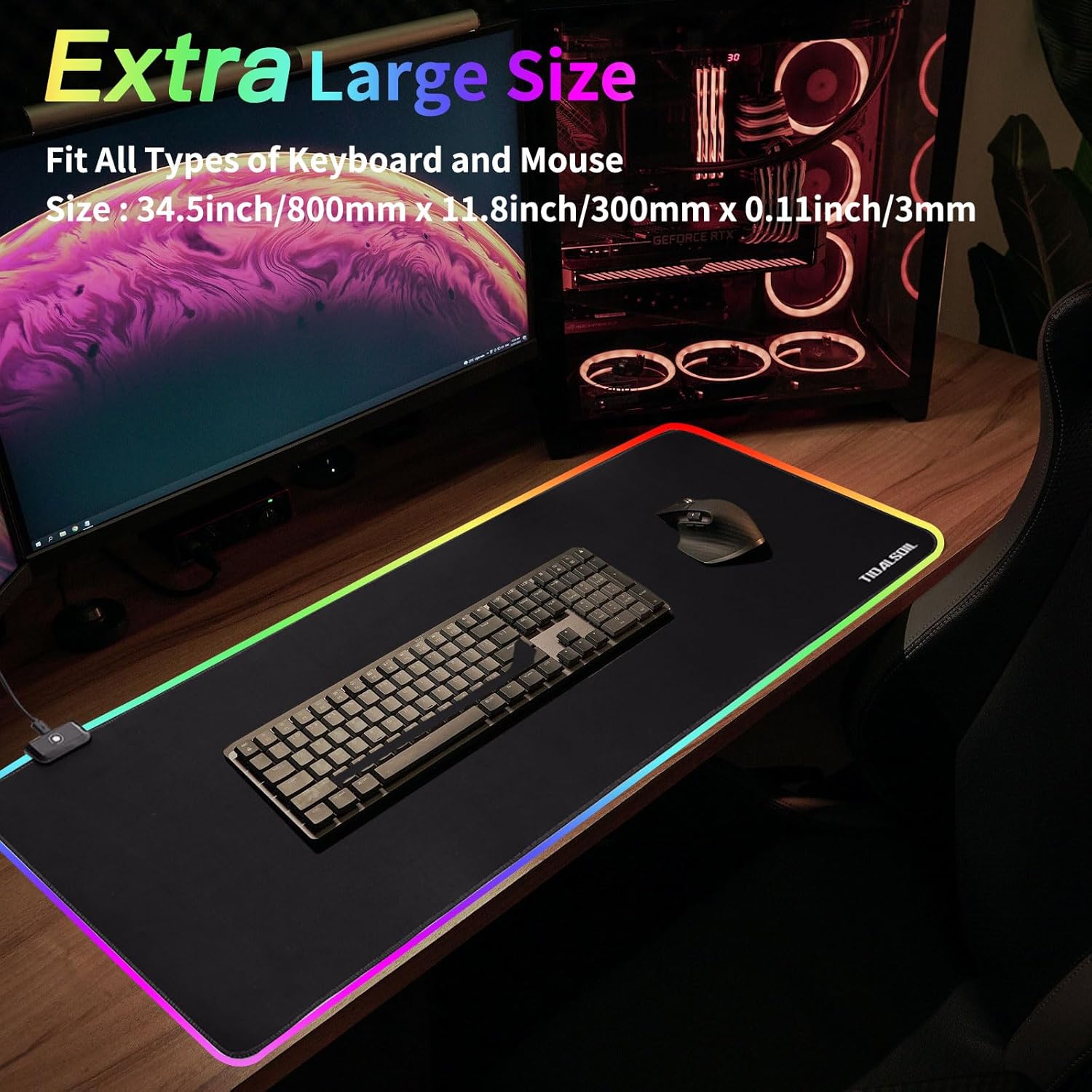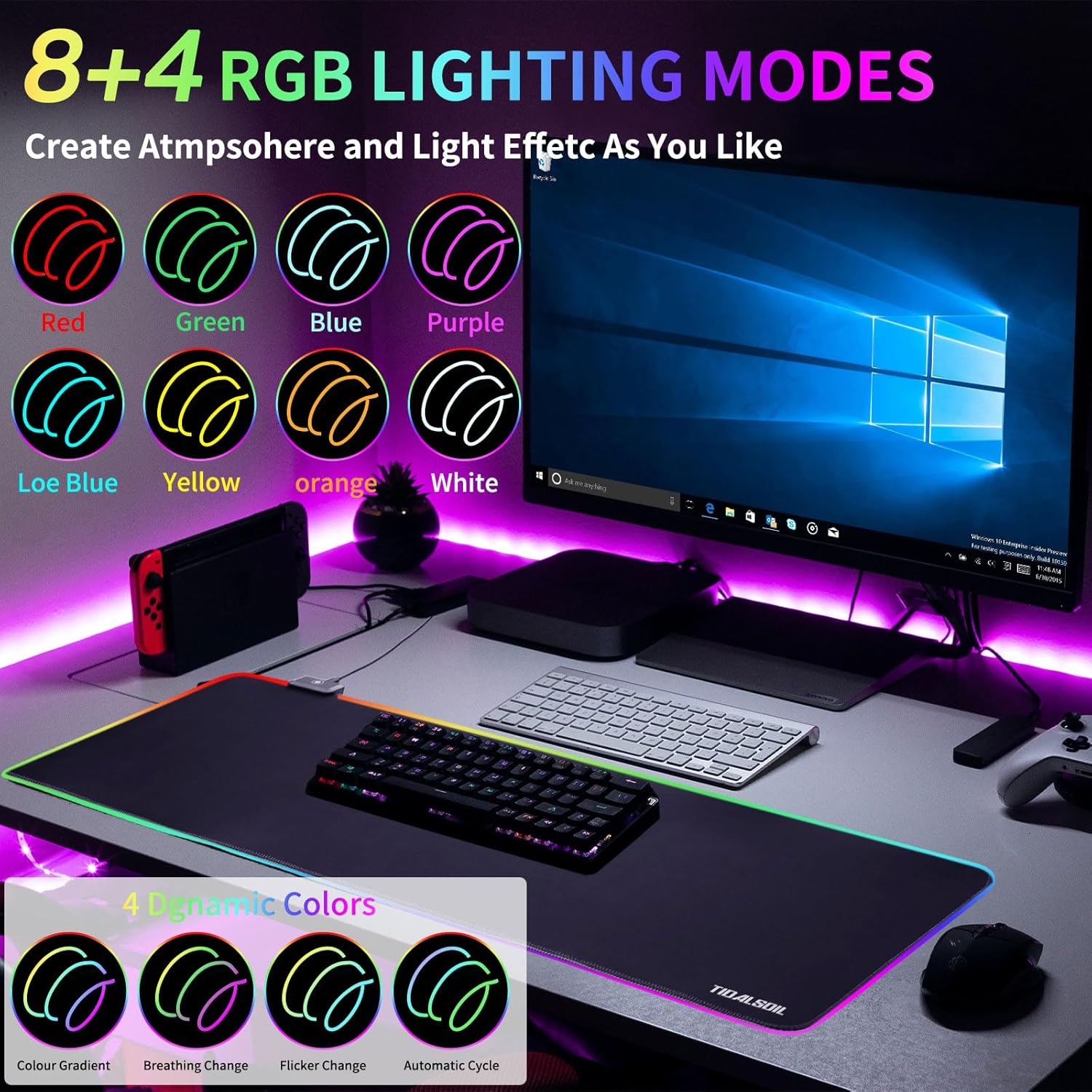About this itemn?12 Stunning RGB Light Modes?: Featuring 4 dynamic modes (Color Gradient, Breathing, Flicker Change, Cycle Color) and 8 static modes, this gaming mouse pad offers vivid RGB lighting to create an immersive gaming atmosphere – all while ensuring your eyes remain comfortable.n?Oversized for Full Coverage?: With dimensions of 31.5 x 11.8 inches, this mouse pad provides plenty of space for both your keyboard and mouse. The smooth surface allows for precise movements, offering an ideal experience for gaming or office work.n?Durable & High Quality?: Built with a durable touch button switch to easily turn the lights on and off, reducing unnecessary power consumption. The long-lasting LED bulbs are resistant to damage, ensuring consistent brightness over extended use.n?Anti-Slip Rubber Base?: The natural rubber base grips your desk firmly, preventing any movement during intense gaming sessions or work tasks, offering stability and a smooth experience.n?Edge Stitching?: Reinforced anti-fray stitching around the edges ensures the mouse pads durability, preventing wear and tear over time.n?Plug & Play with Memory Function?: Simply connect the mouse pad to your PC or laptop via USBno software or drivers needed. It also features a memory function, remembering your last chosen lighting mode for added convenience.n?Smooth Gliding for Precision?: The soft and smooth surface allows for effortless mouse gliding, providing precision and speed, perfect for both competitive gaming and professional tasks.