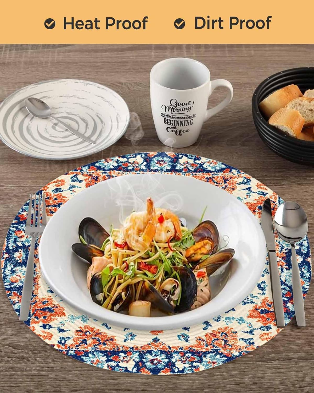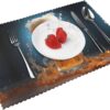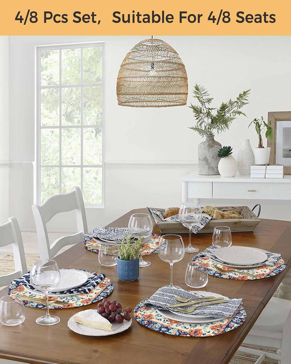 About this itemnBraided with Polyester clear thin threads and Cotton blend threads. Wrinkle resistant. Under light the clear wiring is a little shiny or glittery. 15 inch across, large enough for any plate or bowlnSet of 2. Folded in half for easier transportation. Steam iron low heat if there is any fold linenProtect and dress up your tables. Fit rectangular, round and oval tables. Go well with almost any kitchen or dining room decorationnUse round placemats for birthdays, Christmas, housewarming, holiday, parties, family gatherings, weddings, showers, and more. Great for everyday use inside or outsidenEasy to clean: Wipe clean with damp cloth. Hand wash and air dry
