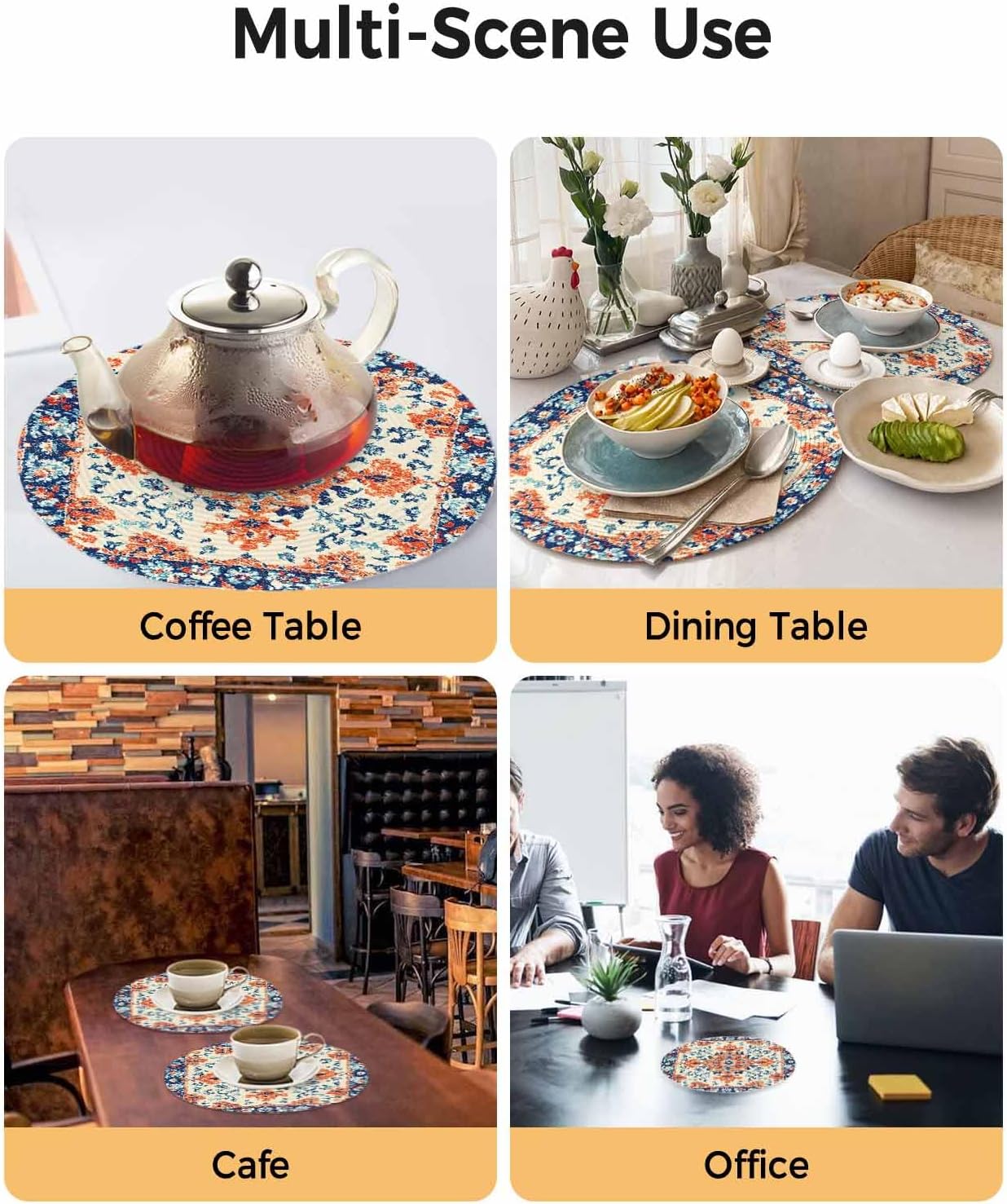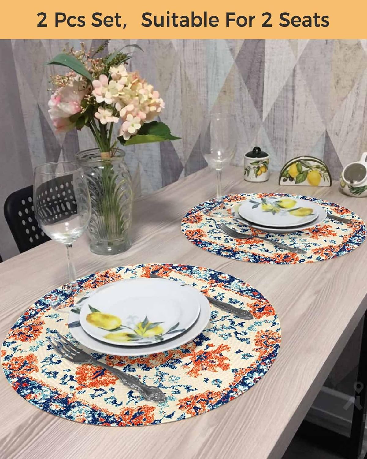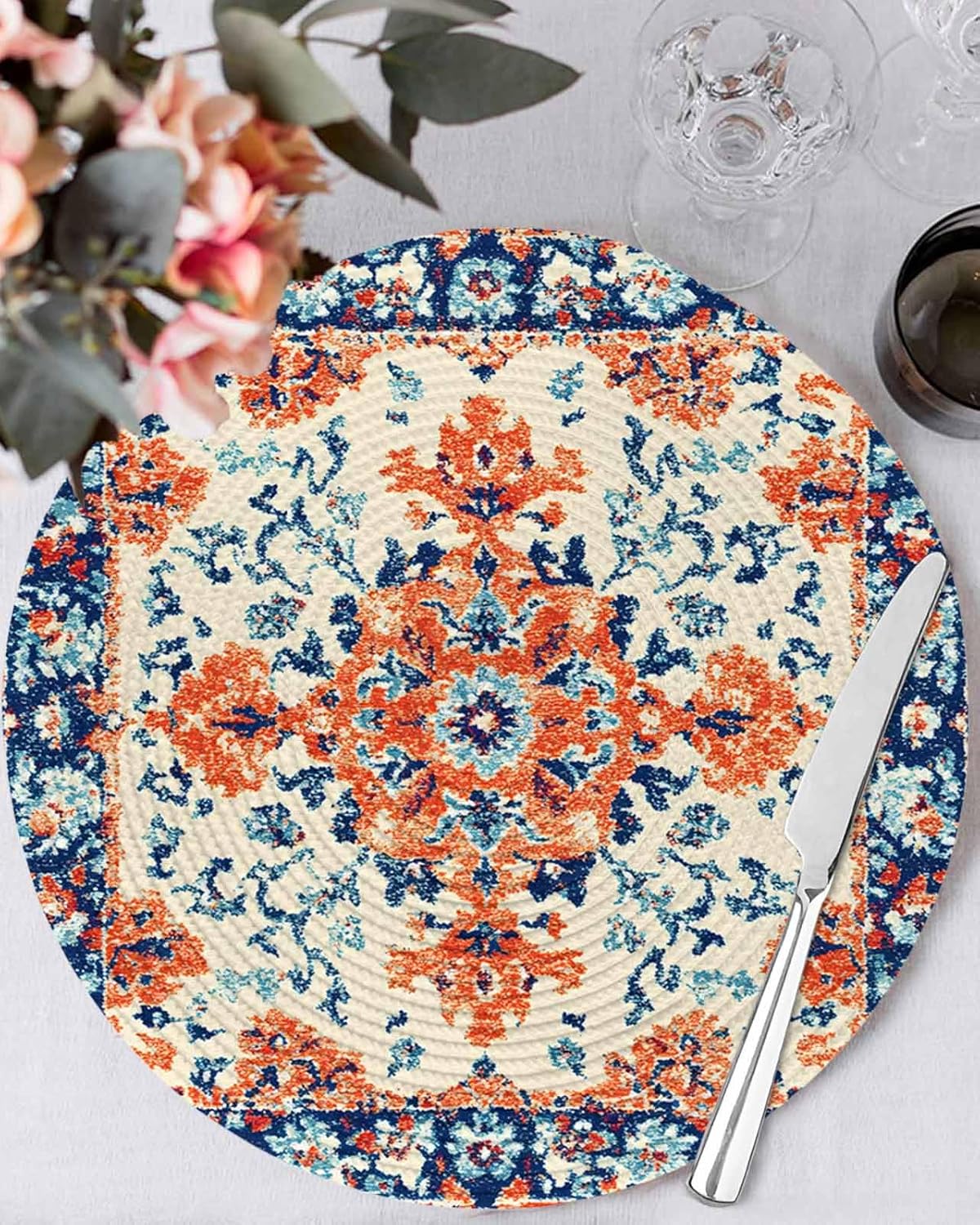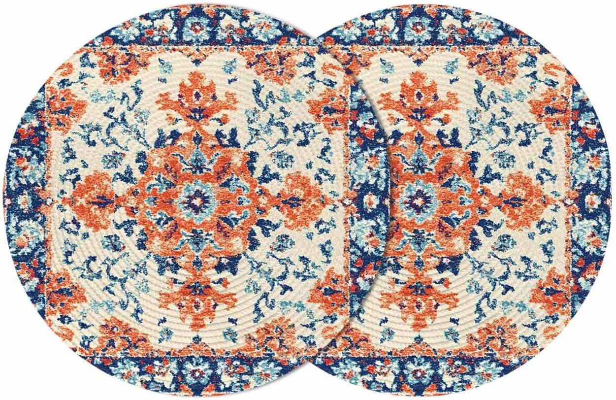 Round Braided Placemats Set of 2 Orange Retro Flowers Decoration Ethnic Heat Round Placemats for Dining Tables Kitchen Decoration 15 inch Washable Round Table Mats