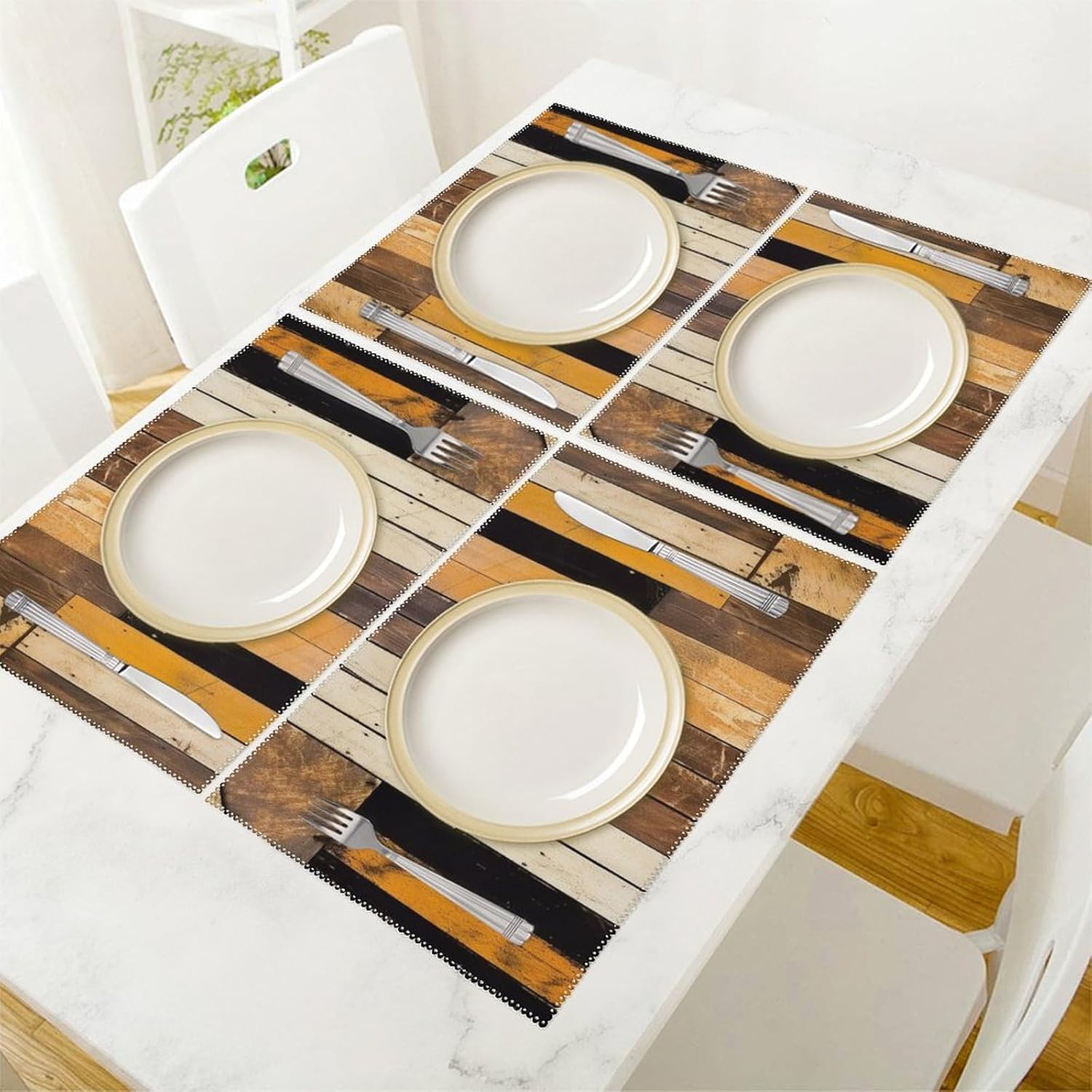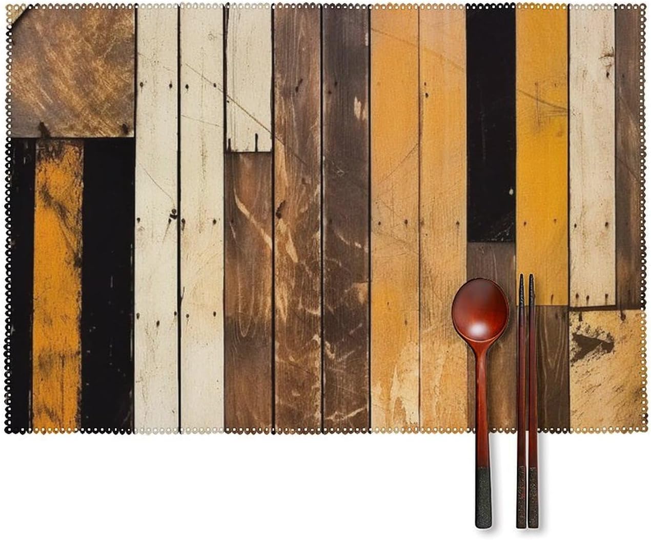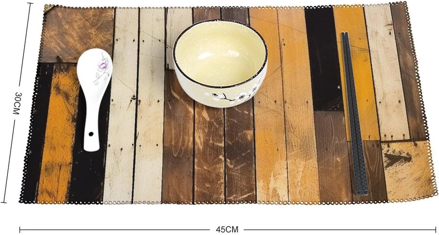About this itemnPerfect Protection: Crafted from high quality canvas fabric, the Rustic Wooden table protector is thick, protecting your tables and furniture from hot dishes, stains and scratches.They provide a non-slip surface, resist fading, and are easy to clean, elevating your dining experience.nMeasurements: Each package includes 4 pieces of placemats measuring 17.7 x 11.8Inch.If there is any problem,please contact us, our customer support team is always ready to help you. It is suitable for all hot drinks and plates, protect your dining table from scalding.nGreat Gift Idea: The stylish placemats set makes s great housewarming, wedding or birthday gift. They are quality assured, practical, stylish, and add a touch of elegance to any home. Add style to your dining setting while ensuring table protection.nVersatile Uses:Our placemats can be used as nice accessories to match your different decor purposes such as table mats, pot holders, coasters, laptop pads, etc. The rustic and neutral design fits any occasions and helps to create a warm and inviting atmopshere.nEasy to Care: Hand wash with warm soapy water or wipe dry directly; do not wash in a washing machine or use steel balls or something very difficult to clean.They provide a non-slip surface, resist fading, and are easy to clean, elevating your dining experience.