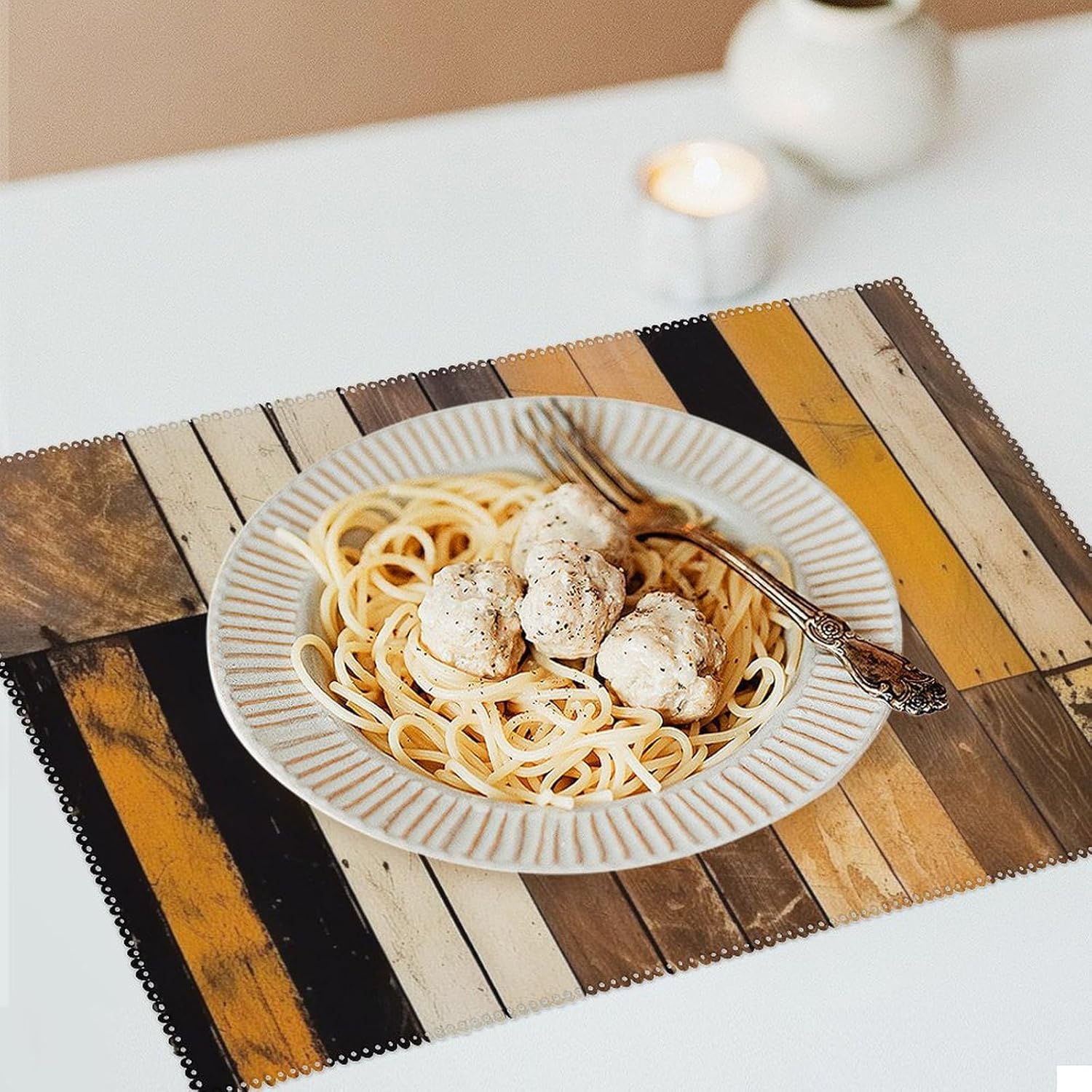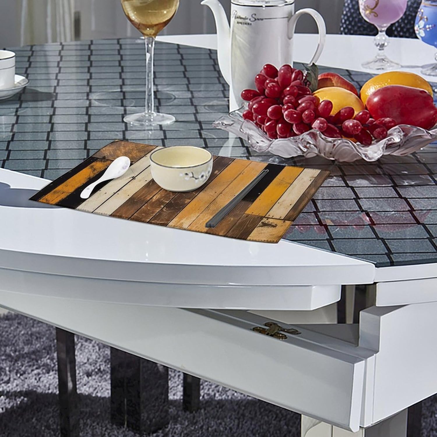 About this itemnPerfect Protection: Crafted from high quality canvas fabric, the Rustic Wooden table protector is thick, protecting your tables and furniture from hot dishes, stains and scratches.They provide a non-slip surface, resist fading, and are easy to clean, elevating your dining experience.nMeasurements: Each package includes 4 pieces of placemats measuring 17.7 x 11.8Inch.If there is any problem,please contact us, our customer support team is always ready to help you. It is suitable for all hot drinks and plates, protect your dining table from scalding.nGreat Gift Idea: The stylish placemats set makes s great housewarming, wedding or birthday gift. They are quality assured, practical, stylish, and add a touch of elegance to any home. Add style to your dining setting while ensuring table protection.nVersatile Uses:Our placemats can be used as nice accessories to match your different decor purposes such as table mats, pot holders, coasters, laptop pads, etc. The rustic and neutral design fits any occasions and helps to create a warm and inviting atmopshere.nEasy to Care: Hand wash with warm soapy water or wipe dry directly; do not wash in a washing machine or use steel balls or something very difficult to clean.They provide a non-slip surface, resist fading, and are easy to clean, elevating your dining experience.
