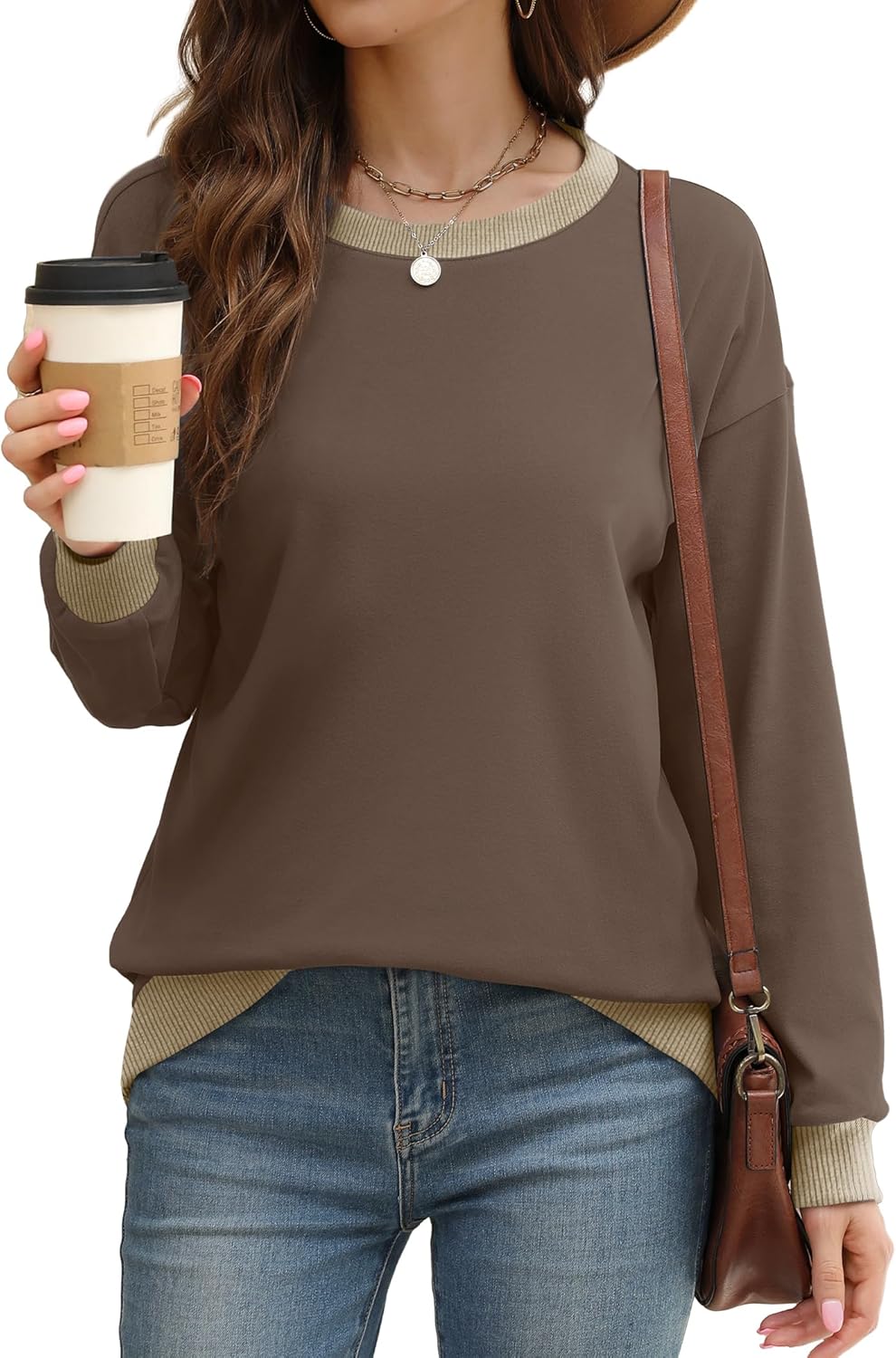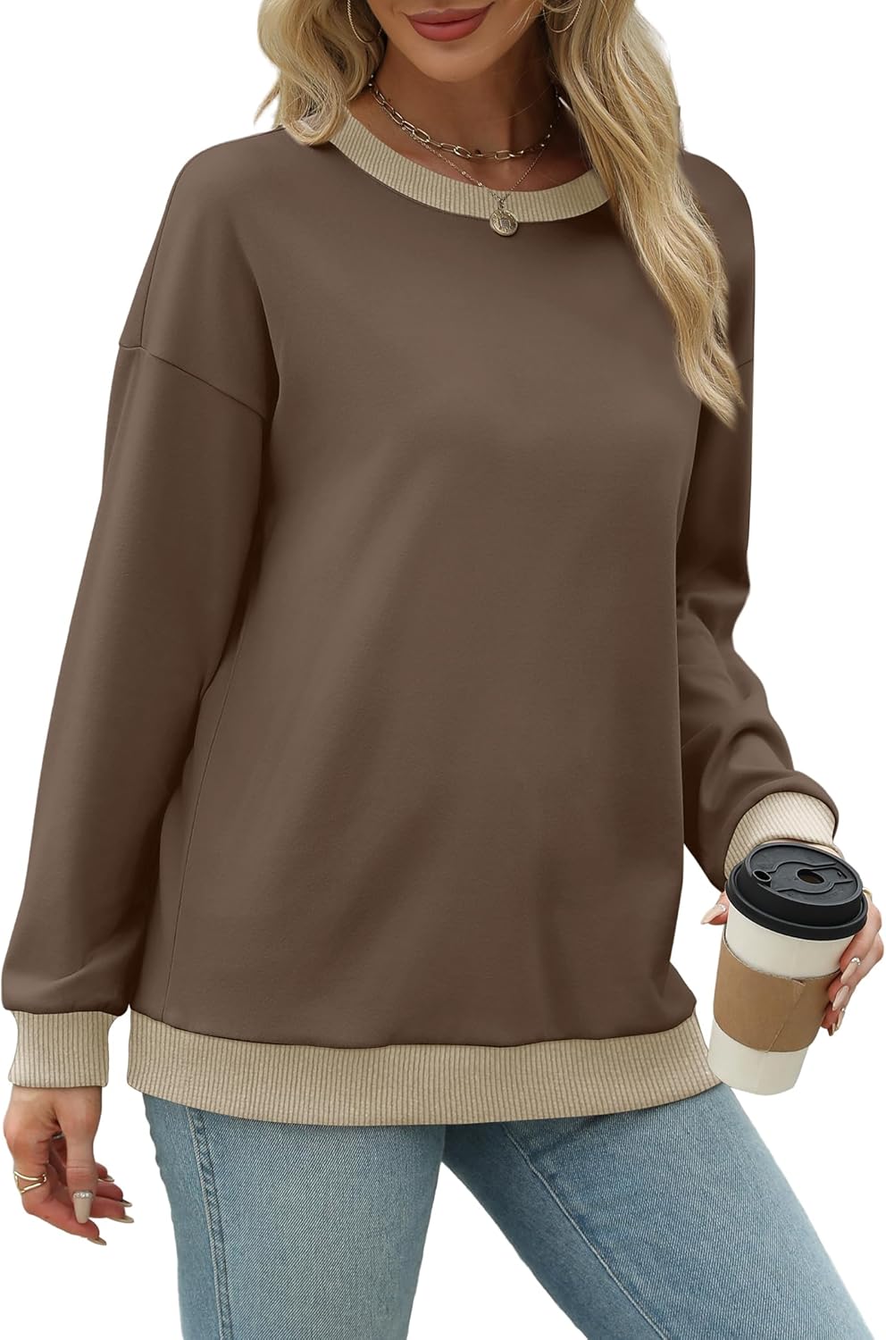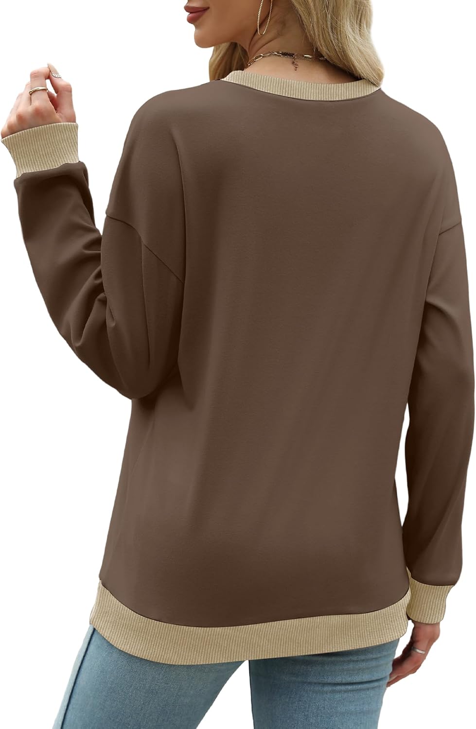 Saloogoe Sweatshirts for Women Crewneck Long Sleeve Loose Fit Tops Color Block Ribbed Trim Fashion 2024