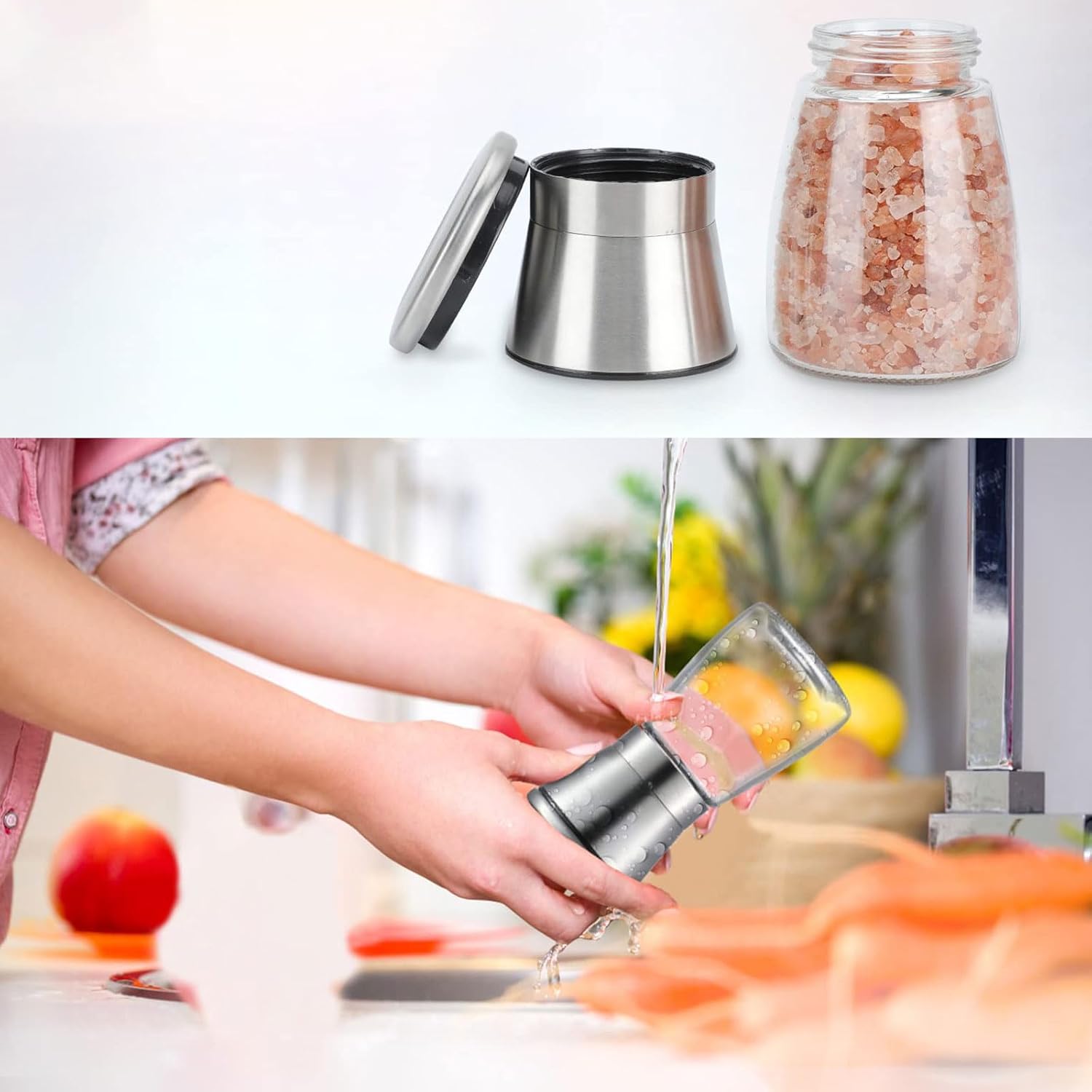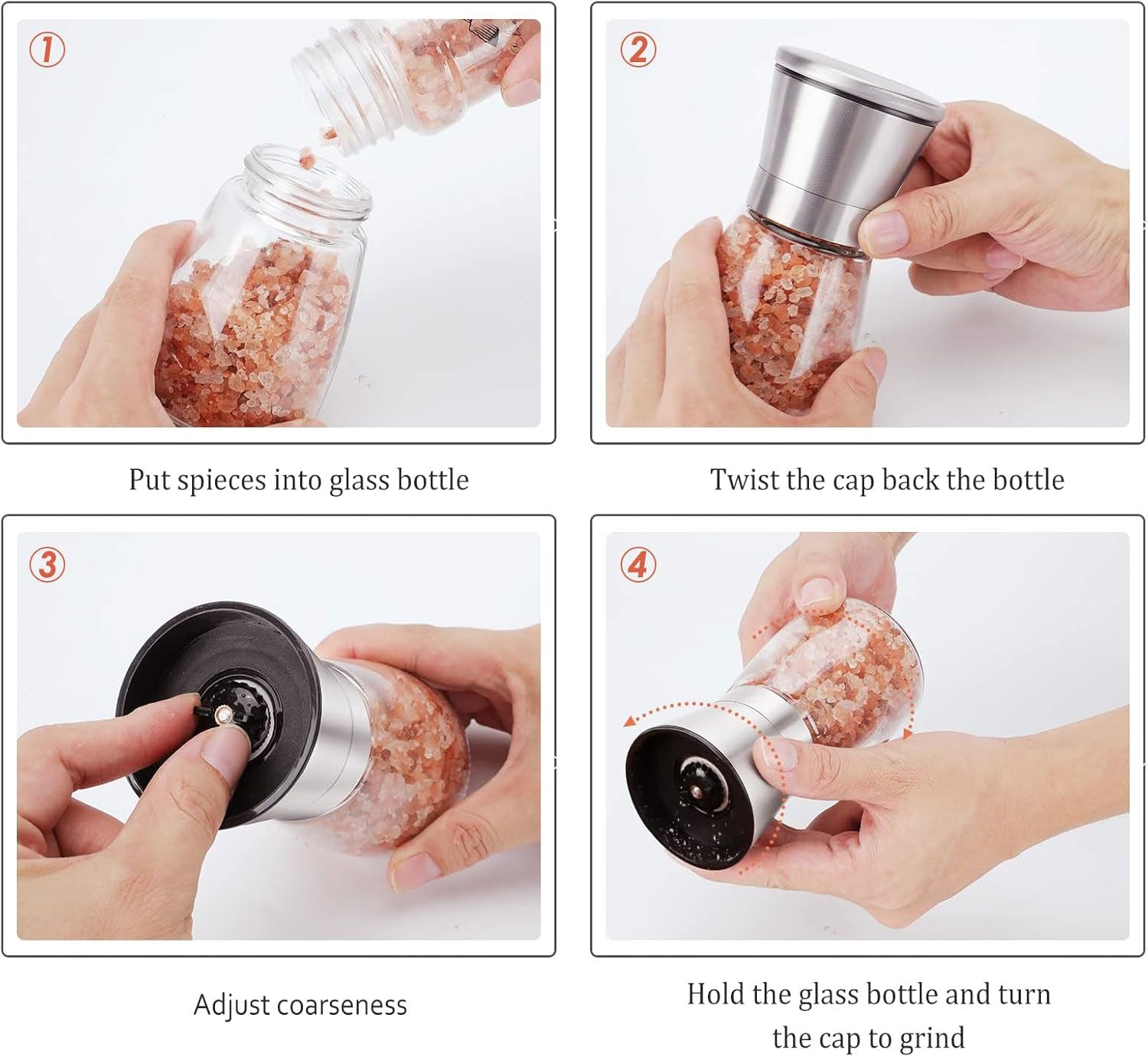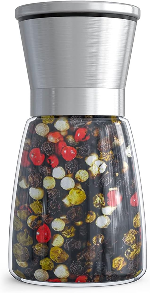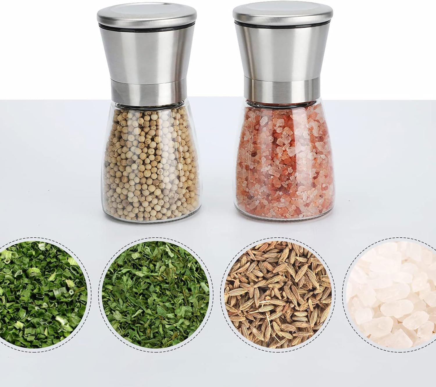 About this itemn?Premium Stainless Steel Grinder? The salt and pepper shakers are made of the highest grade non-corrosive stainless steel and BPA Free glass bottle. The sealing lid can prevent moisture and water penetration, keeping your spices remain completely fresh.n?Two Adjustable Particle Size? Our grinders have high hardness ceramic grinding core, which can grinding out more delicate spices and quickly produce powder. It offers fine and coarse granules to meet your different spice needs. You only need to turn the knob to adjust the thickness of the ground powder.n?Freshly Grind Spices? The stainless steel lid can keep your spices away from moisture and dust. Freshly ground spices can solve the problem of weakening the fragrance of spices due to long storage time. The professional grinder strips spices down by their individual layers as it grinds, releasing maximum flavor.n?Widely Used? It is ideal for grinding black pepper, rice, white pepper, mung beans, pepper, sea salt, cumin, dried chili or other spice. This grinder also makes a great gift for any aspiring chef, foodie, men, or women who cook daily!n?Modern and Stylish Design? The body of the spice grinder adopts a transparent and visual design, which can easily identify the seasonings. The shape adopts a small waist design, which is comfortable to hold and easy to grind. The luxurious and stylish appearance is suitable for all dining tables and kitchen countertops.