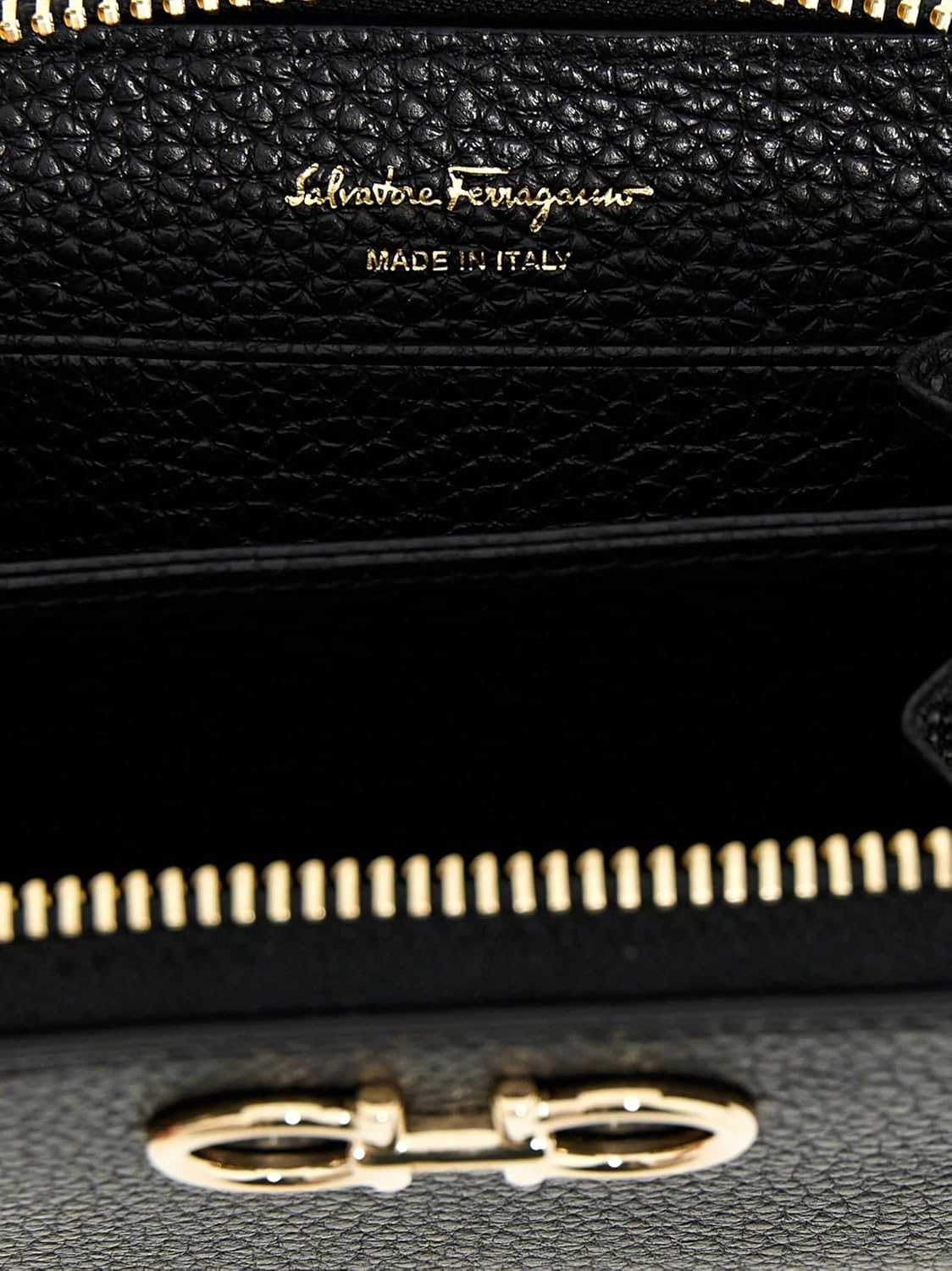 About this itemnNew in Ferragamo Gift Box, Gancini’ hammered leather wallet with zip around style with front metal logonSize and fit: W 11 x H 8 x D 2 cmnMade in ItalynMaterials: Leather