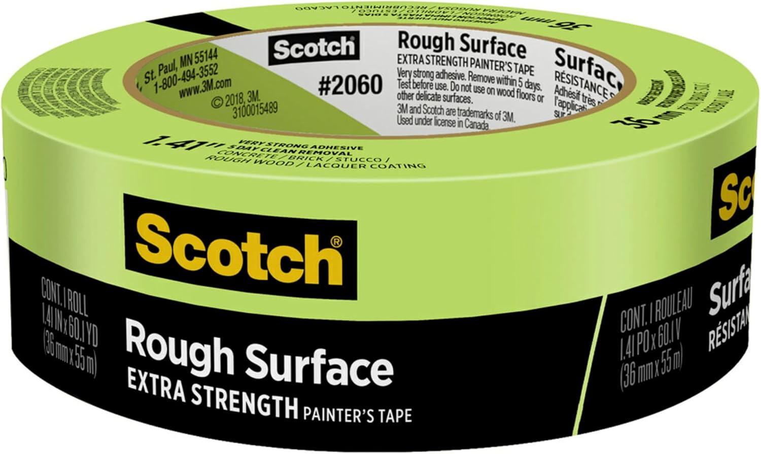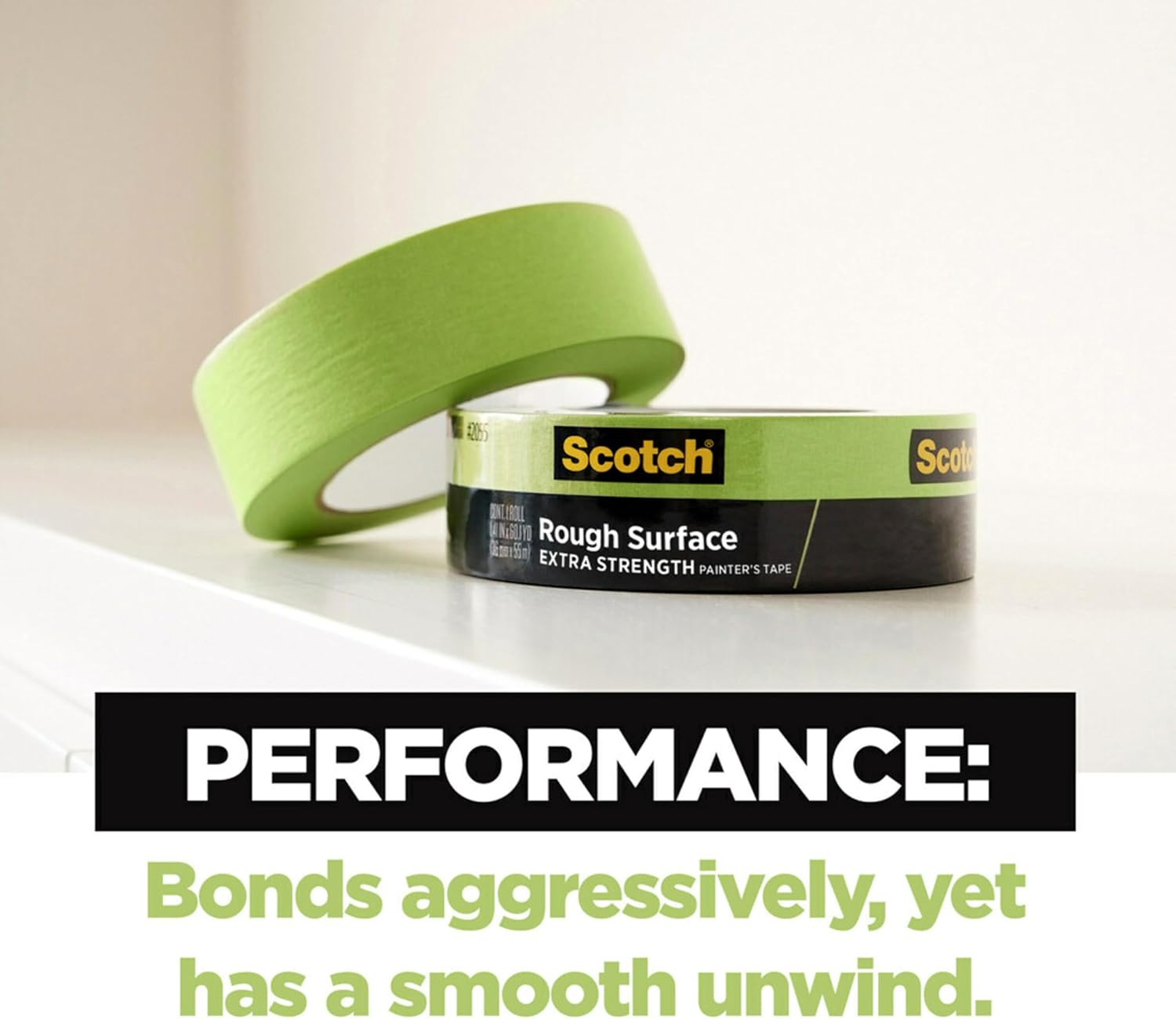 About this itemnREADY. SET. PAINT!: 1 roll of 1.41 inches x 60.1 yards green Scotch Rough Surface Extra Strength Painter’s Tape, designed with a very strong adhesive for performance on rough, non-damageable surfaces with a 3-inch corenDAMAGE-FREE PAINTING PREP: Colorful painters tape can stay on exterior surfaces for three days and up to five days on interior surfaces, and it removes easily without leaving a sticky residue behindnCONQUER ROUGH SURFACES: Specially designed tape features a strong adhesive that bonds aggressively to brick, concrete, stucco or rough wood and is recommended for use with or on lacquer coatingsnTACKLE INDOORS AND OUTDOORS: Resists UV rays, sunlight and moisture so you can use it as an indoor or outdoor tapenSUSTAINABILITY: Solvent-free painting tape made from 50% renewable resources with a core made from 70% post-consumer wasten› See more product details