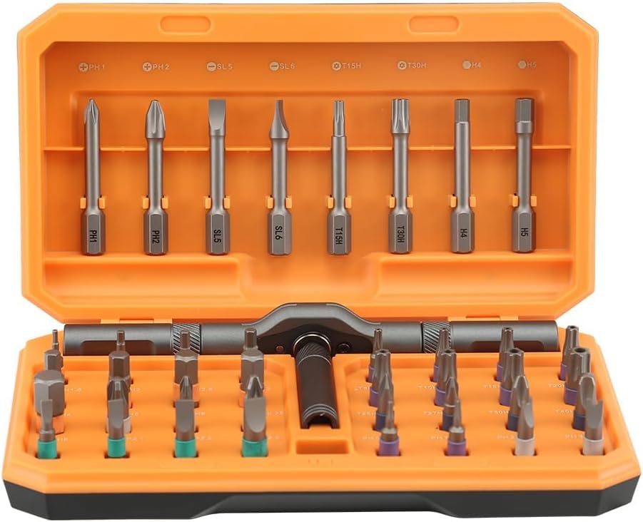 About this itemn?ANVANNA Advanced Ratchet Torque Kit?Aluminum 42 in 1 Ratchet Torque Kit, Ratchet Screwdriver Kit. Our experienced technical team has redesigned the kit, including all the tools needed to repair furniture, including Phillips, Pentalobe, Torx, Hex, JS, Slotted, Triangle, Square, and more.n?Intelligent Creative Design?Ergonomic design, 58-tooth forward and reverse ratchet mechanism, reduces effort by80%,6.2-degree ratchet design, comfortable grip, long-lasting comfort. screws intight spaces, quick switching between long and short bits, versatile formulti-dimensional maintenance tasks, durable and versatile.Ultra-hard hot-forged aluminum alloy, supported by high-precision CNcintegration. Half the weight of regular steel, excels in tight spaces withease.n?User-Centered Design,implemented in Every Detail?From appearance to material, from material to tactile experiencefrom tactile experience to practicality, every aspect is ourcommitment to you. User-Friendly Color-Coding System. Color-Coded Wraparound Design for Bit Retrieval, Clear and Easy. Chromium-molybdenum alloy steel, CNC lathe milling one-time formingcarburizing and tempering heat treatment, industrial-grade durability.Magnet Groove Design. The handle has built-in strong magnets, which sen?Whatever you need?Whether you’re a professional repair technician or a DIY enthusiast, this set is for furniture assembly, home appliances, computers, glasses, game consoles and other electronics.With our state-of-the-art equipment, you can solve the problems of assembly and repairn?For him?We believe that everyone needs a ratchet screwdriver kit to meet their travel and daily needs. Our ratchet screwdriver set is elegant and compact, perfect for him or anyone who enjoys home decor projects.n› See more product details