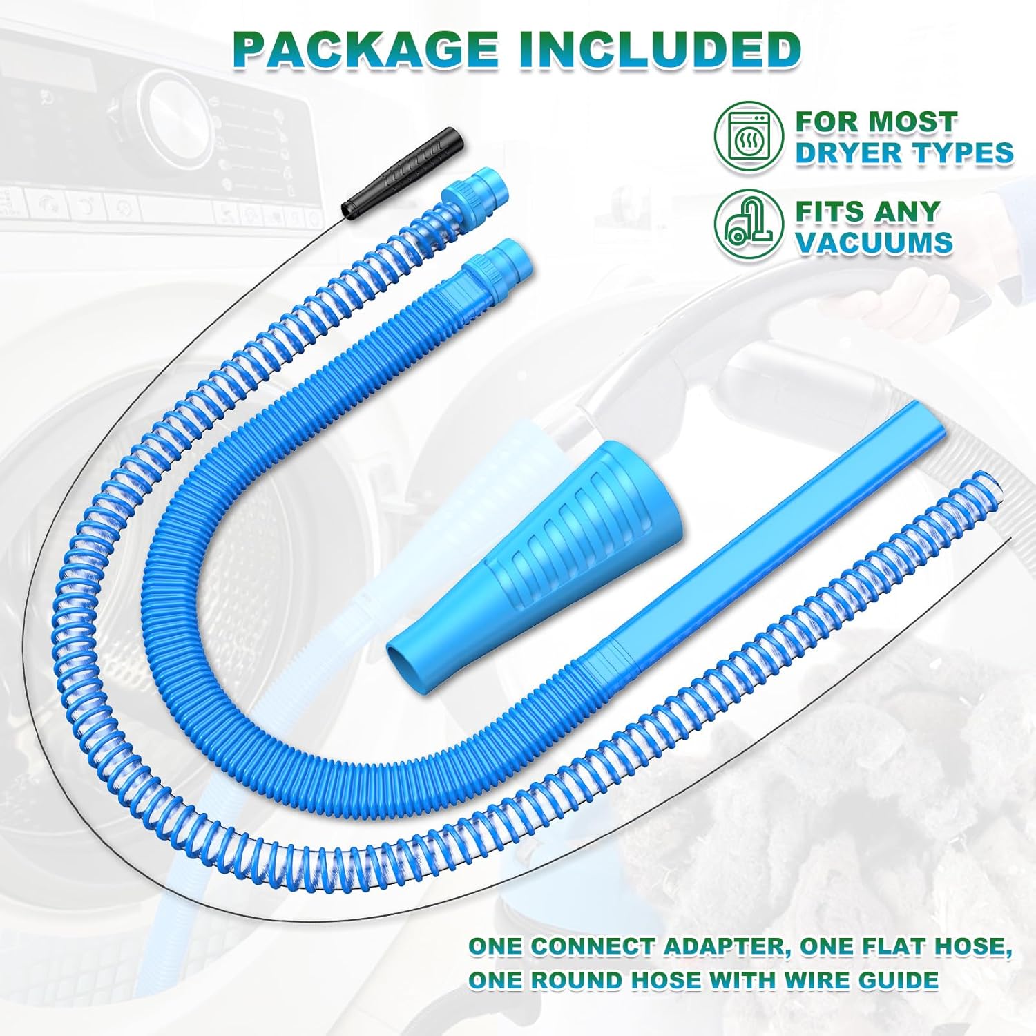 About this itemnNote: This product needs to be used with a vacuum cleaner, not fit for dyson vacuum cleaners; please check the packing list, the vacuum cleaner is not included. [New Upgrade] Essential for Dryer Vent-These dryer duct cleaning tools connect to a vacuum handle or hose to use suction to remove lints. They can be vacuum attachments flat hose or flexible round hoses, These hoses are specially designed to the narrow vents of dryer.. Perfect for your washing machine, dryer, freeze dryer machine,and more can run more efficiently. Flexible and handy hose is perfect for removing lint build-up beyond you can’t reachn[Improve Dryer Performance] The dryer that not be cleaned for many years accumulates a lot of dirt. The vents will become narrow or blocked. Our dryer lint vacuum attachment-No suction power is lost after attaching to the vacuum. Its slender, flexible design allows it to slide smoothly into the lint trap without scratching or damaging the inside of the dryer. It powerfully out all sorts of sand, dirt, and lint that had accumulated over the years and make your dryer runs more efficientlyn[Helps Prevent Fires] The dust lint is the main cause of fire in the dryer. Dryer fires are the result of lint building up in places other than just your lint trap. While your lint trap is designed to catch most, it is not a 100% guarantee. Oftentimes, the lint gets lodged in other areas, such as the interior dryer duct, the dryer vent. So we need this helping clean dryer lints avoid fires and protect the performance of dryer. It is valuable for you to choose this dryer vent cleaning hosen[Flexible and Bendable Hose] This dryer vent cleaner kit can adapt to narrow dryer vent filters, Can also get into curved corners we also have a guide iron to help control the direction. Perfect for cleaning appliances that you can’t touch in or moven[2 Types of Hoses can be Switched for Use] In order to adapt to different dryer vents, we provide two types of hoses. One adapter can be switched to connect two types of hose. When switching use, you only need to remove the adapter and the hose connection to connect to the corresponding long hose. Note that the adapter need to changed while you use the round hose. So you don’t have to agonize over which hose is right for your dryer, you can receive both for about the similar price!n› See more product details