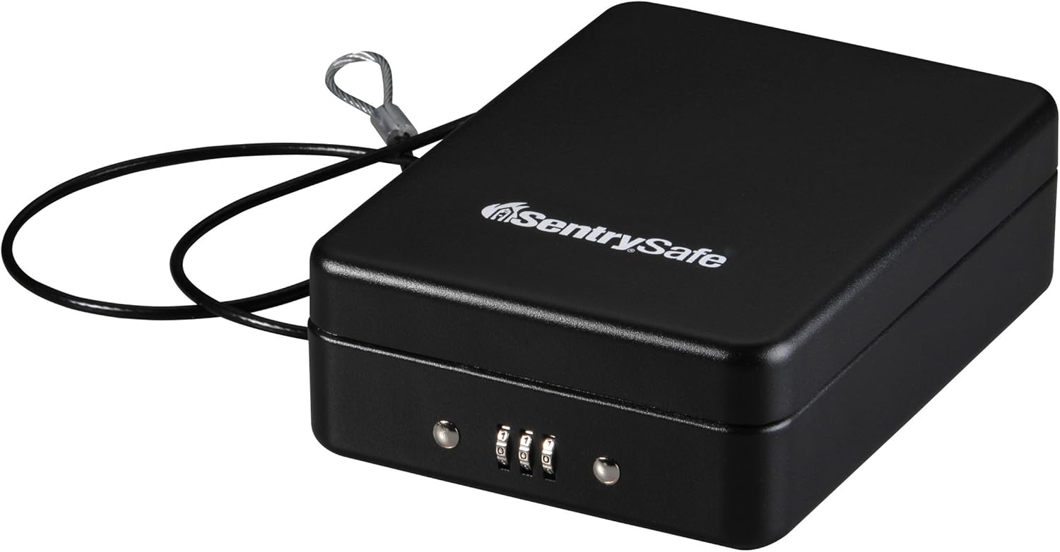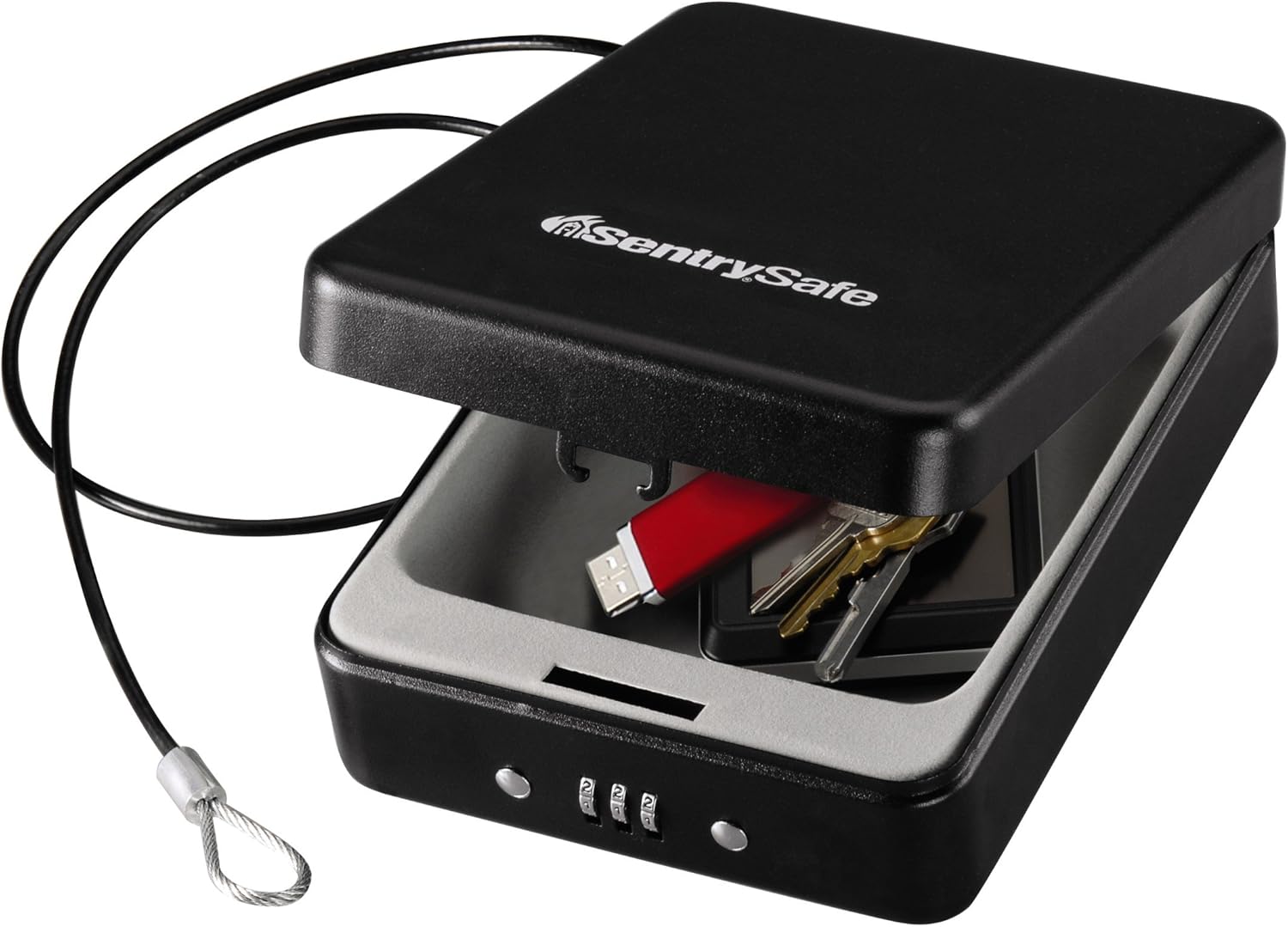 SentrySafe Small Safe, Black Lock Box with Combination Lock for Office or Dorm Secures Money, Passport, Jewelry, 0.05 Cubic Feet, Exterior: 2.6 in. H x 5.9 in. W x 8.0 in. D, ?P005C