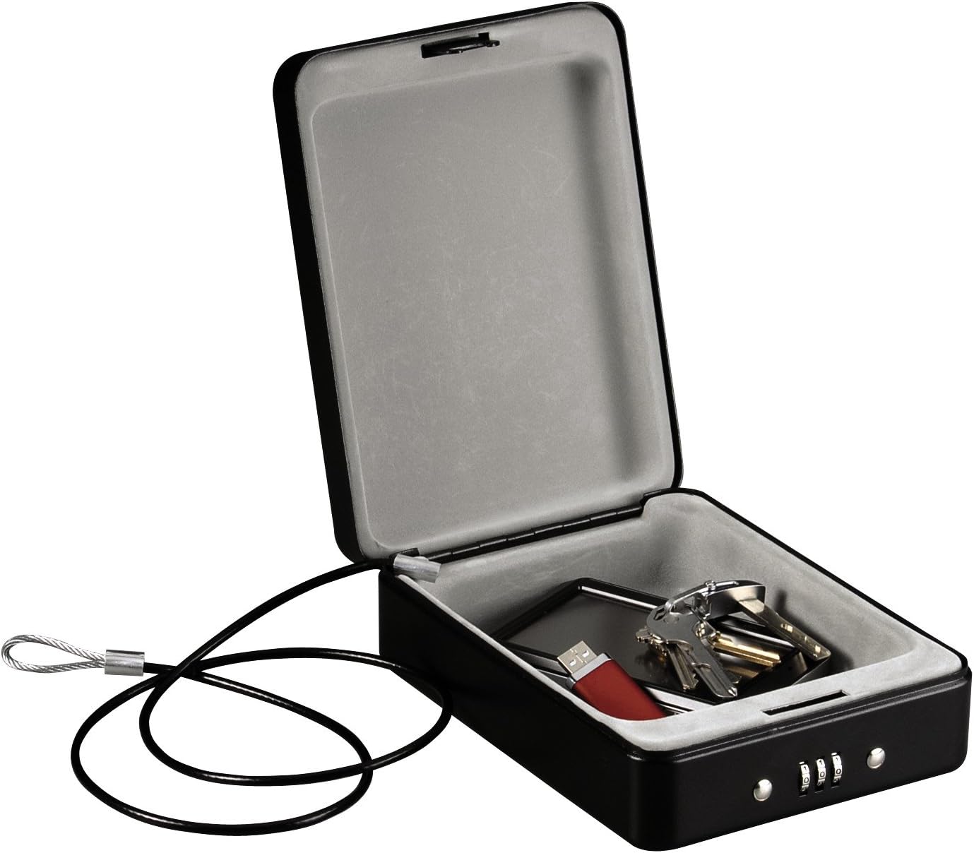 About this itemnSmall safe is made with sturdy steel construction and perfectly fits passports, keys, wallets, USB drives, cash, medications and other small itemsnLock box has a resettable, three-digit combination for easy use and keyless security (no misplacing keys or having them fall into the wrong hands)nTethering cable makes it easy to secure portable lock box to nearby structuresnSmall lock box is ideal for travel, fitting easily in cars for hunting, hikes and other excursionsnSpecifications: Exterior: 2.6 in. H x 5.9 in. W x 8.0 in. D, Interior: 2.4 in. H x 5.3 in. W x 6.6 in. Dn See more product details