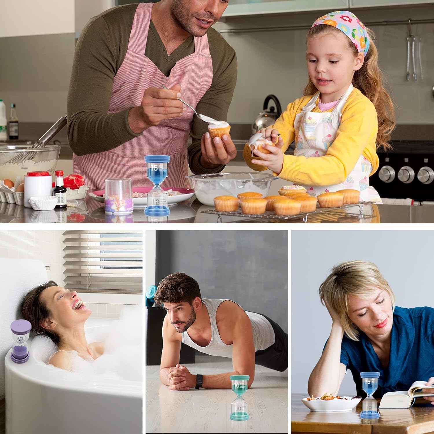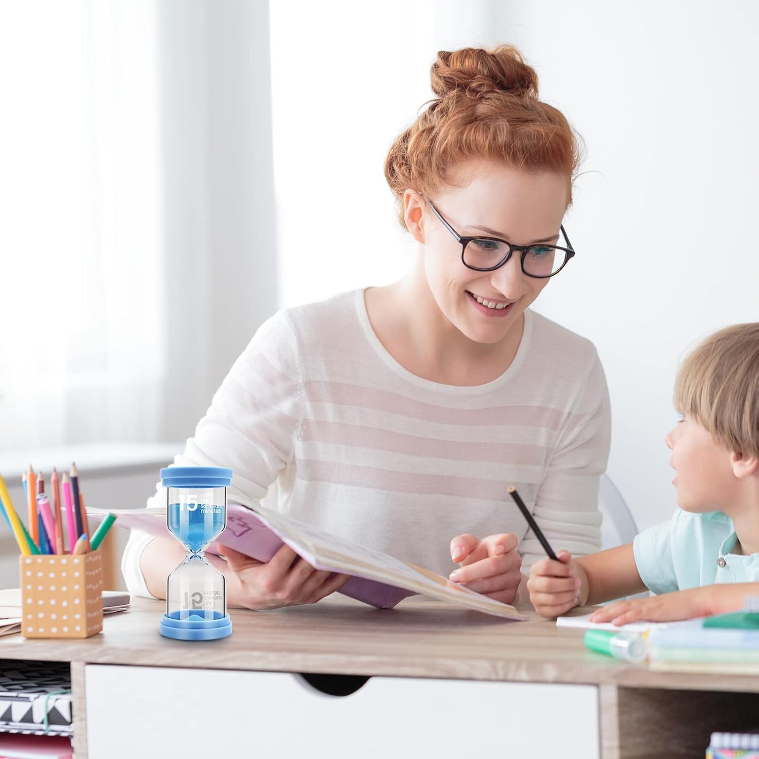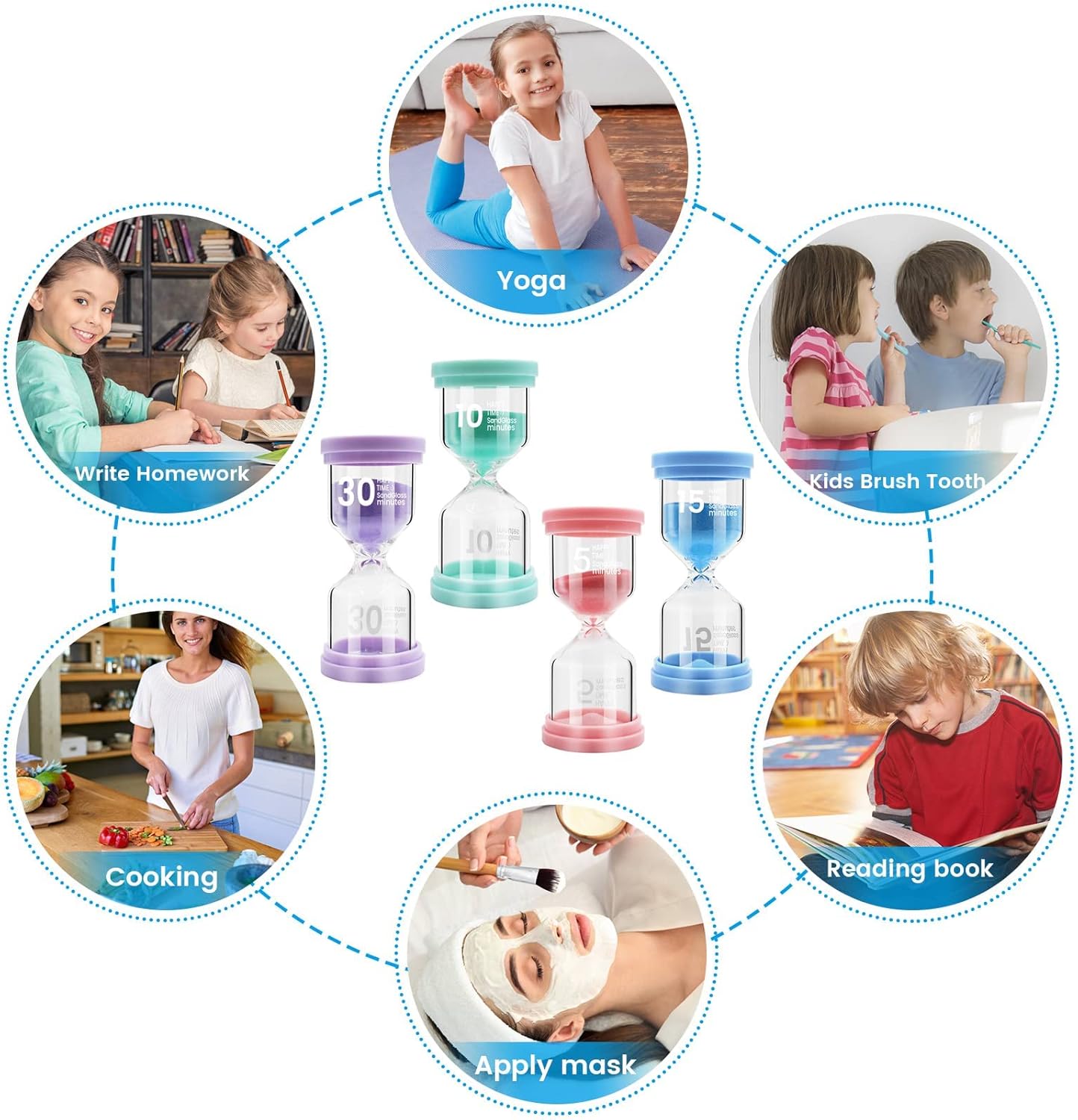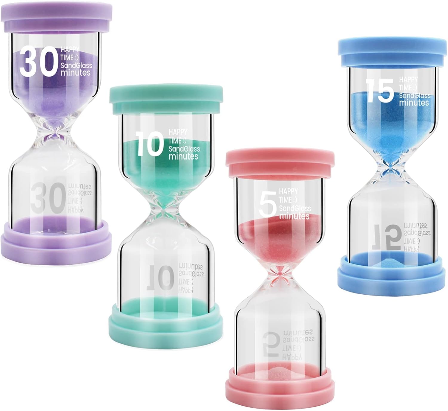About this itemnHourglass glass for children and adults: with a timer, children and adults can create a visual time concept in many situations. For monitoring different times.n?Color Hourglass?Including 4-piece color sand timer with wave pack, attractive for use at home, school or office etc. Tip: please do not scratch words on the glass to prevent words from falling off.nCounting: 5 minutes, 10 minutes, 15 minutes, 30 minutes. Please note the 10% time deviation as the timer is not a mechanical clock. Sand timers are very suitable for games that count time, add more fun and a fun atmosphere.nWide application: perfect for cooking in the kitchen, home, classroom, playing, office, learning, timer training and many uses. The hourglass is perfect for home and office decoration, a wonderful gift for children and friends.nGood sand quality: the timer is made of durable PVC (protective case) and clear glass, high borosilicate glass and sand that runs smoothly. If it does not break easily under normal use, do not drop it from above.