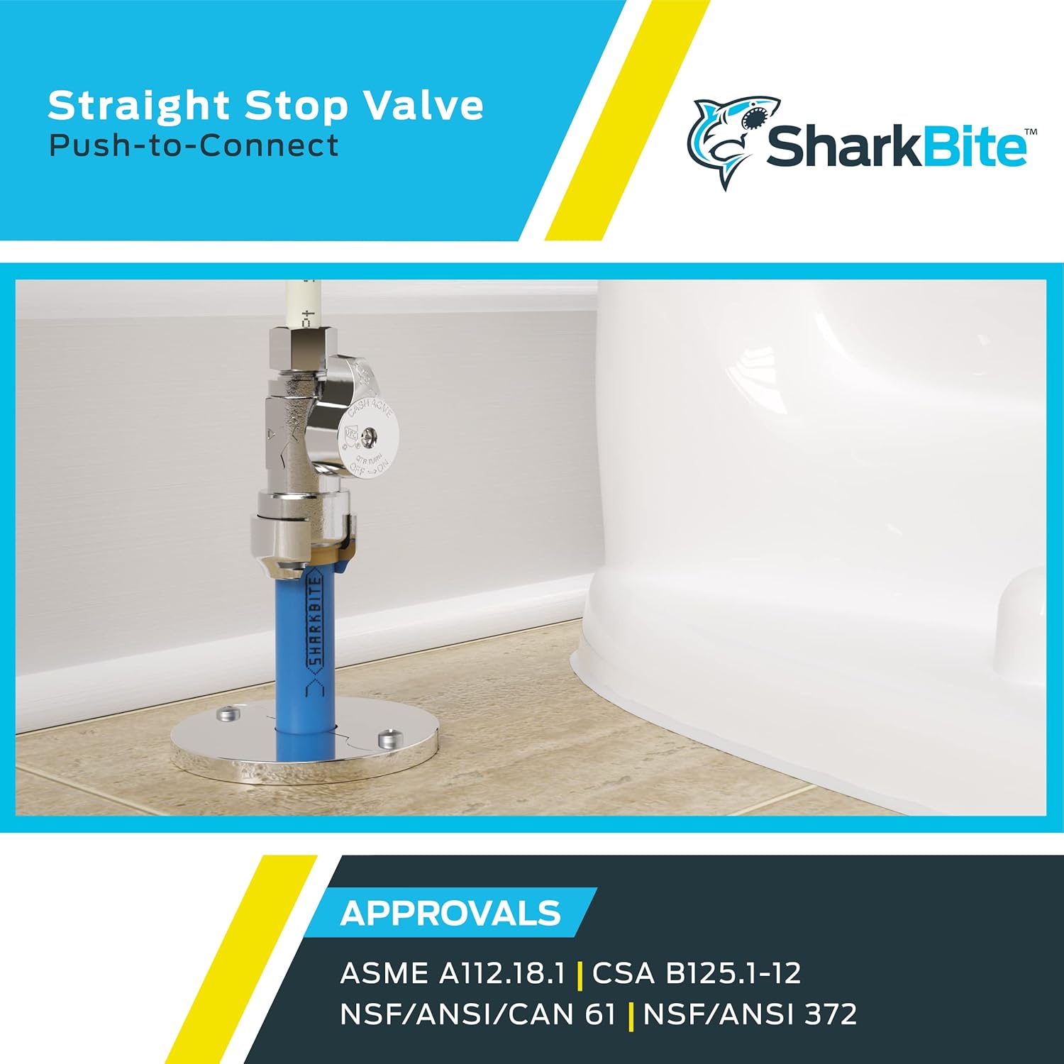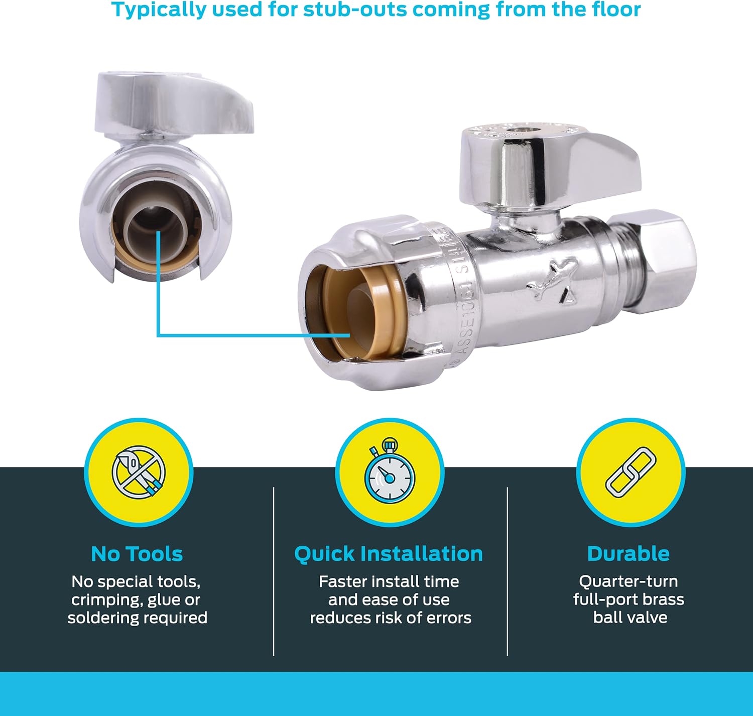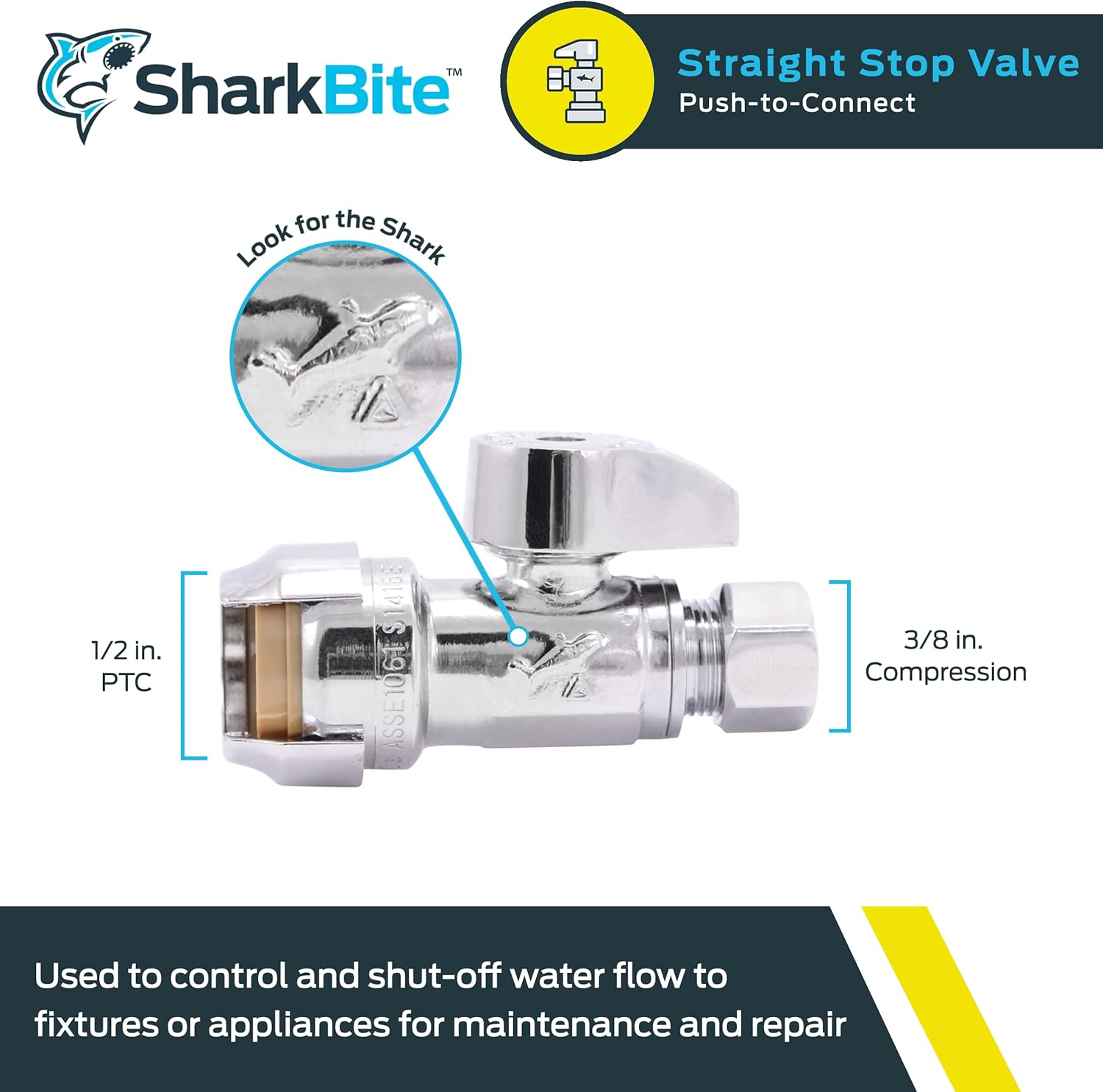 About this itemnSHARKBITE BRASS PUSH STRAIGHT STOP: Brass push straight stop valves are used to control and shut off water flow to fixtures or appliances for maintenance and repair; ideal for working in tight spaces; remove using a disconnect clip or disconnect tongsnVERSATILE: Brass push straight stop fittings work well with PEX, CPVC, PE-RT, SDR-9 HDPE, and copper pipesnEASY TO INSTALL: This innovative stop valve features a 1/2-inch push-to-connect inlet and a quarter-turn full-port brass ball valve for quick and easy operation; no special tools, crimping, glue, or soldering needed; can be installed in wet linesnPREFERRED BY THE PRO: SharkBite tools and fittings meet the same high standards for commercial and residential plumbing applications, combining durability and ease of use; feature a sleek chrome finish for an attractive appearancenMADE IN THE USA: All SharkBite valves, clips, joints, and adapters are manufactured and tested in the USAn› See more product details