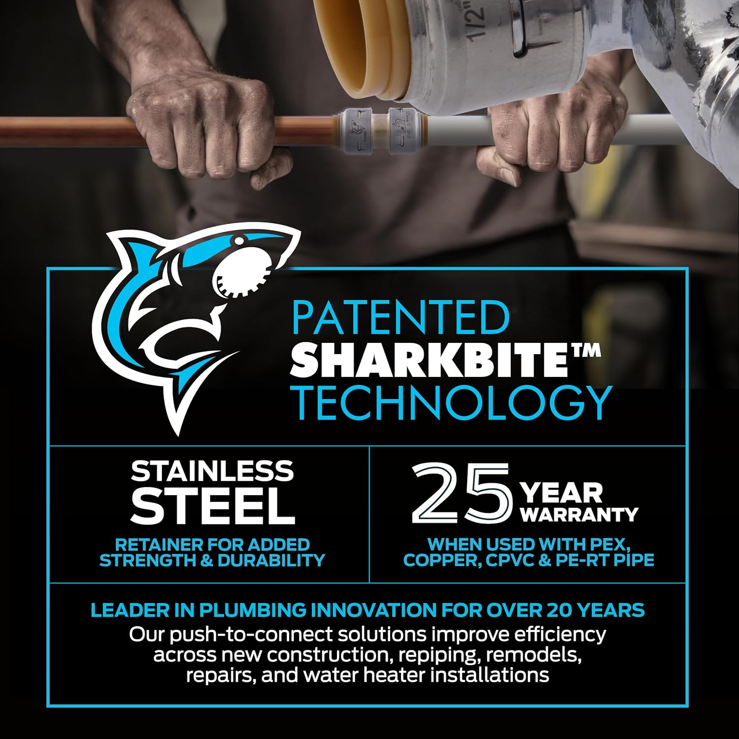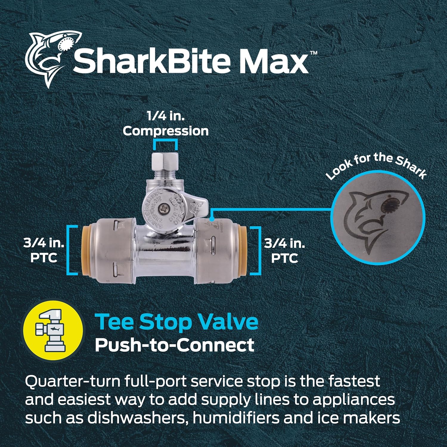 About this itemnBRASS PUSH TEE STOP VALVE: Brass push tee stop valves are used to add supply lines to fixtures and appliances such as dishwashers, humidifiers, and ice makers; ideal for working in tight spaces; remove using a disconnect clip or disconnect tongsnVERSATILE: Brass push tee stop fittings work well with PEX, CPVC, PE-RT, SDR-9 HDPE, and copper pipes; can be rotated for easier and faster installationnEASY TO INSTALL: This innovative stop valve features a quarter-turn full-port brass ball valve that allows for easy on/off control of the supply line; no special tools, crimping, glue, or soldering needed; can be installed in wet linesnPREFERRED BY THE PRO: SharkBite tools and fittings meet the same high standards for commercial and residential plumbing applications, combining durability and ease of use; feature a sleek chrome finish for an attractive appearancenCERTIFIED: Service stop valves are rated to 160 degrees F and 125 PSIn See more product details