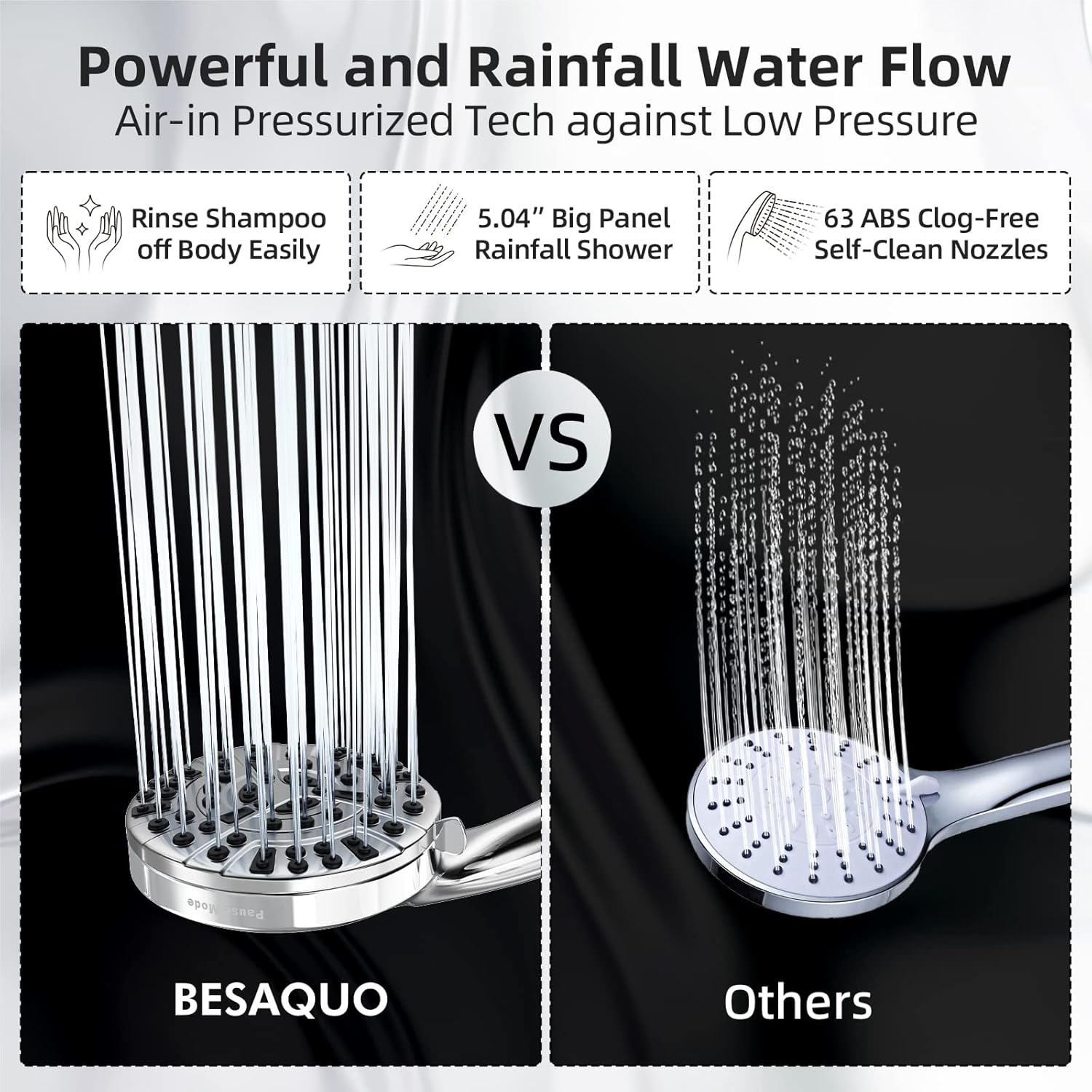 About this itemnHIGH PRESSURE SHOWER HEAD: Our USA designed shower head maximize water pressure with Air-in Tech against low pressure condition. BIG PANEL and NO CLOG Nozzles desgin insure no accumulation of grime, massage muscle, soothing fatigue, and quickly rinse hairn10 FUNCTIONS & 2 BUILT-IN POWER WASH: 10 Functions shower head provides different functions, pulsating for massage, PAUSE MODE if soaping or shaving, 2 POWER WASH, POINT JET: blast away the grime on tub, WIDE FAN: rinse off soap foam and large areanEASY INSTALLATION & ADJUSTABLE BRACKET: Our shower head comes with long hose and bracket, installed by hand-tightening in 5 minutes, no plumber needed. Our UPGRADED Desgined backet is more sturdy allows you to hold the shower head to any shower positionnLEAKPROOF & NO BREAKAGE: Our Double Buckle design hose keeps this hose away from breakage and leakage. This hose provide maximum flexibility, and the backet is crackproof and leakproof can hold up the shower head even under high pressure water flown5 YEARS SERVICE: Our handheld shower head with hose bring you luxury shower with 10 ifferent functions. No worry in low pressure area anymore. Let’s us know if any questions of this shower head, we will get back to you within 24 hoursn See more product details