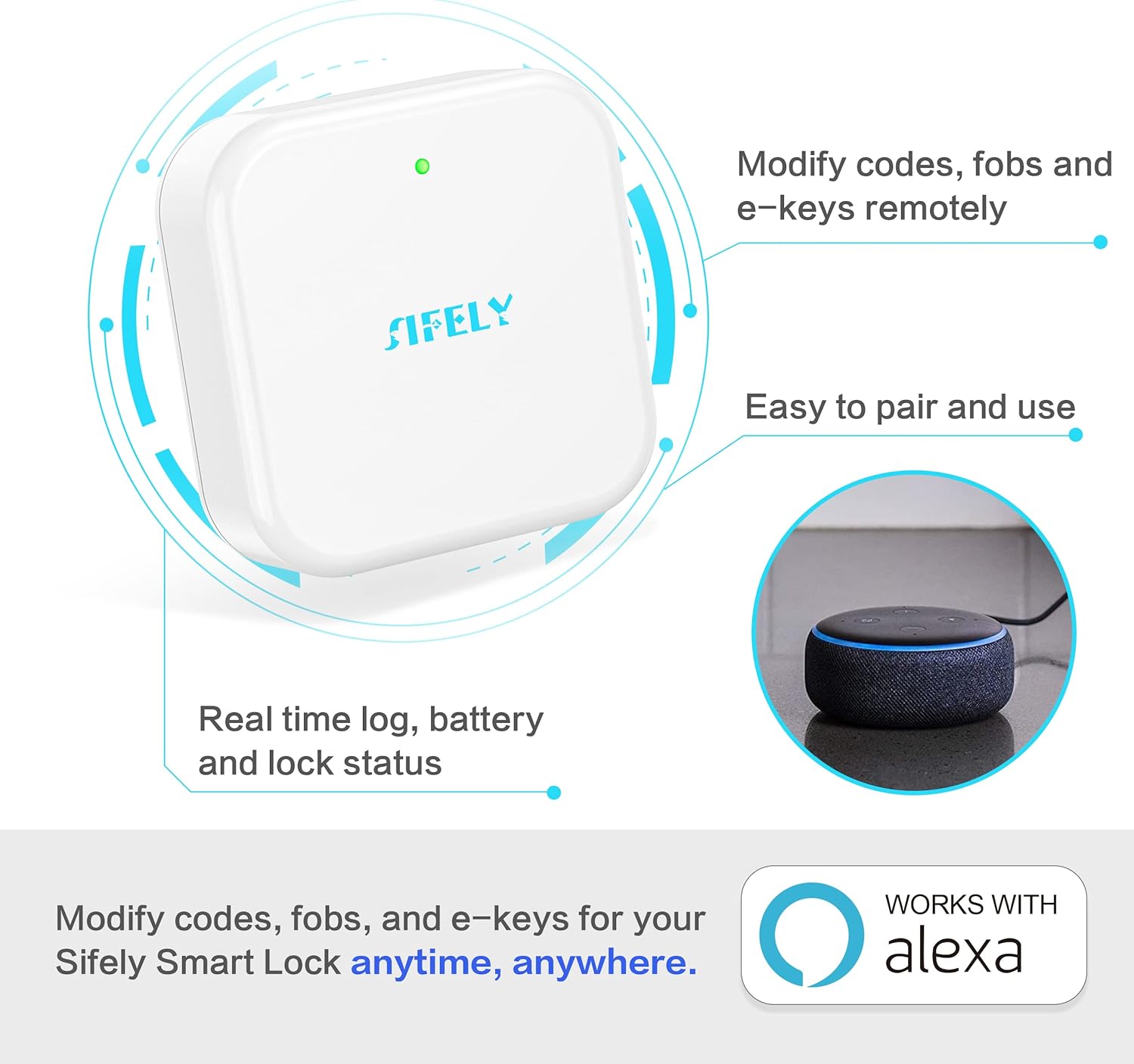 About this itemn[Compatibility] Works for Sifely, samtechT and Dermum Branded Smart Door Lock.n[EASY SET UP] Just plug it in, connect and set up with your smart lock app within 2 minutes. One Sifely Wi-fi gateway can pair as many locks as you want. We strongly recommend that the distance between locks and gateway is 10 feet for a strong connection.n[Remote Control] Remotely control your door lock anywhere in the world even if you are away from home. Set, change, delete codes from anywhere anytime. You can also check door status, battery life and activity logs remotely in real-time. Note: Our gateway connects only to 2.4 GHz networks.n[Instant Alerts] Get Instant alerts who enters or exits your home.n See more product details