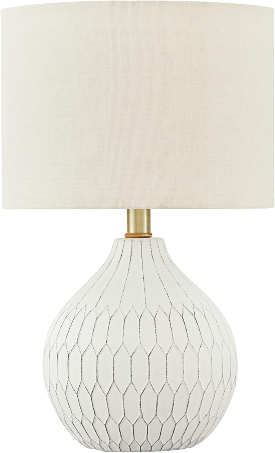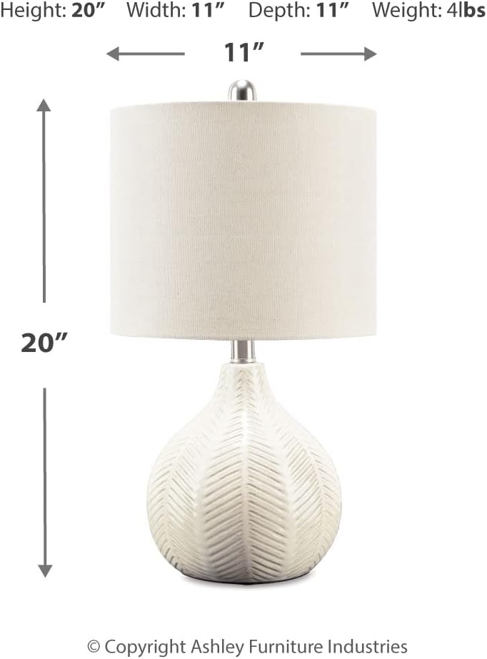 About this itemnCERAMIC TABLE LAMP: Reflecting your effortlessly chic sensibility, the textural surface is enriched with a herringbone pattern and a gorgeous transparent white glaze for a hint of sheennCRISP WHITE SHADE: The hardback fabric drum shade in a neutral hue enhances a bedroom, living room or entry area, perfectly suited to fit right in with clean and modern or cool and eclecticnELEVATE THE DECOR: Table lamps have form and function. Whether placed on a small table or bedside nightstand, they illuminate an area while creating an ambiance that shows off your stylenDIMENSIONS: 11