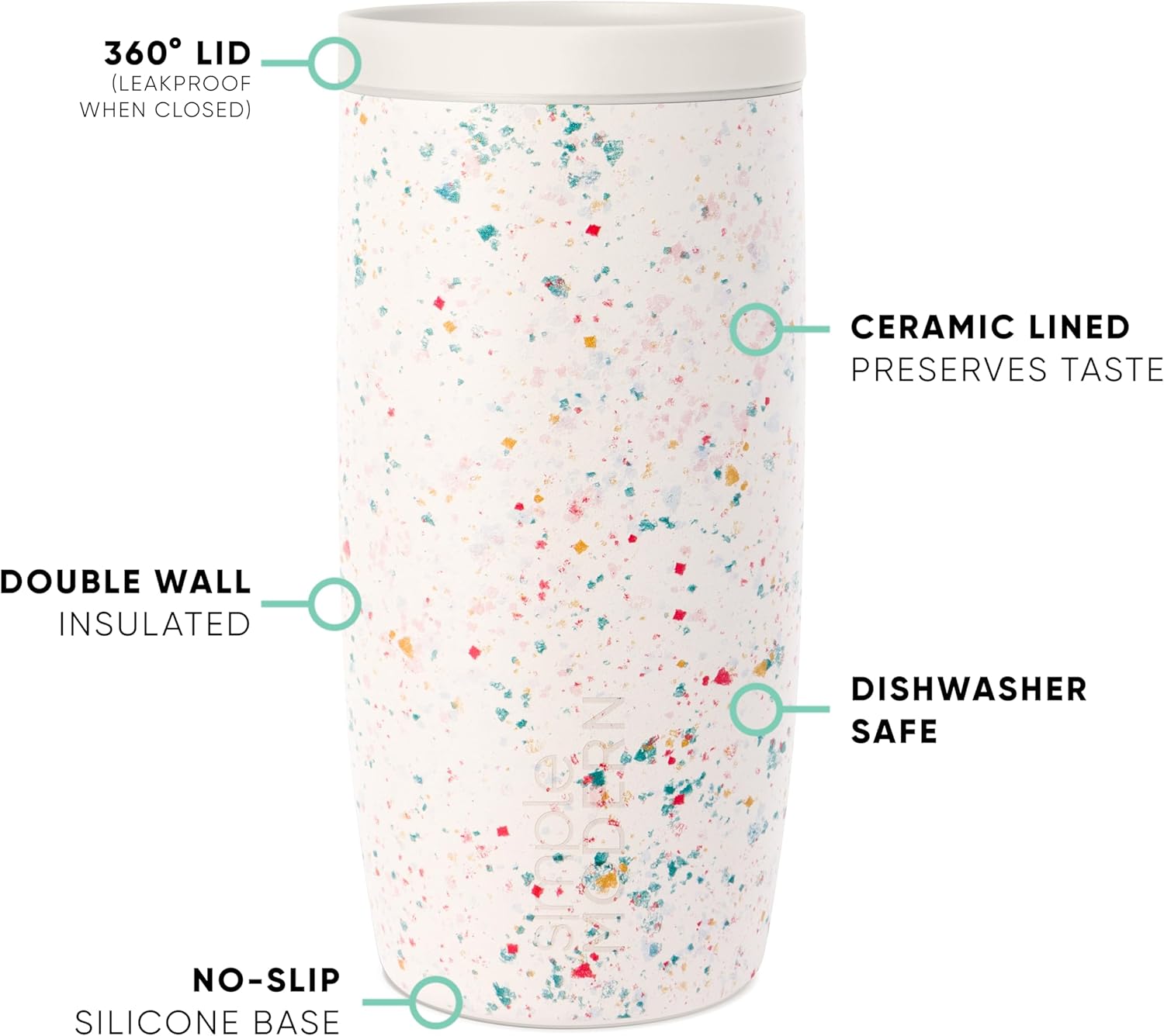 About this itemn360° Lid: The push-button lid is drinkable from any angle and is leak-proof in the closed position.nCeramic-Lined: This double-walled vessel is coated in a ceramic lining that preserves the integrity of your coffee’s flavor for even the most discerning palates.nElevated: Features a silicone base to soften contact and enhance stability.nCupholder Friendly: This sleek design fits in most cupholders, making it perfect for commuting and on-the-go hydration. Carry your coffee in style with our aesthetic design and trendy colors.nLimited Lifetime Warranty & Pat/Pat Pending