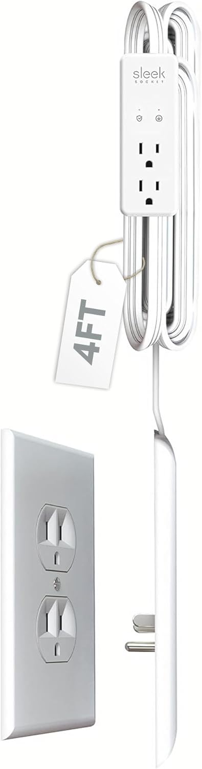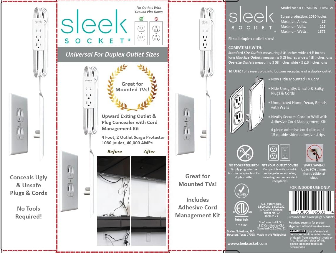 About this itemn?????????? ?????? ?? ?????????????? ???? — Say goodbye to ugly, dangling cords and the hassle of drilling holes in your wall to hide a mounted TV cord. With this product, you can discreetly and completely hide the entire outlet, plugs, and cords, enhancing your home décor. Our solution includes an outlet cover and a flat extension cord going straight up, making it perfect for organizing and concealing a TV power cable. It also features a flat plug power strip with surge protection, providing safe and efficient power management. This outlet concealer features 40,000 Amps and 1080 joules max surge protection.n?????????????????? ????????, ???????????? ?????????? ?????????? ?????? ?????????? — Less is MORE. Less clutter, less hazards, and less obstacles. This ultra-thin, wall-hugging device blends with the wall youll forget its there! If you’re looking for power strips with surge protection, this sleek device will get the job done AND enhances the visual appeal of your home!n???? ?????????? ????????????????! — Simply attach to the top receptacle of a duplex outlet like a traditional plug. This user-friendly design allows for quick and easy attachment without the need for any tools. Perfect for anyone looking to simplify their home TV setup without undergoing a DIY project.n???????????????? ???????????????? ???????? ?????????????????? ?????? — Consisting of double sided, removable adhesive strips and adhesive cord clips to neatly secure the cord to the wall. You deserve a simple solution that is cost effective and keeps your cords neatly organized and out of sight!n?????????????????????? ???????????????????? — Works with duplex standard outlet sizes with round ground pin below flat pins (see thumbnail picture). This ensures a versatile fit for various outlets, making it easy to use with different setups. Whether you’re looking for outlet covers or want to cable manage your TV setup, Sleek Socket offers a reliable fit for various setups while hiding those ugly cords on your wall.n???????????????? ???? ?????? ??????, ???? ?? ????????????-?????????? ?????????? ???????????????? — Sleek Socket has safety certifications under all applicable UL Standards, ensuring that each product meets the highest safety requirements.