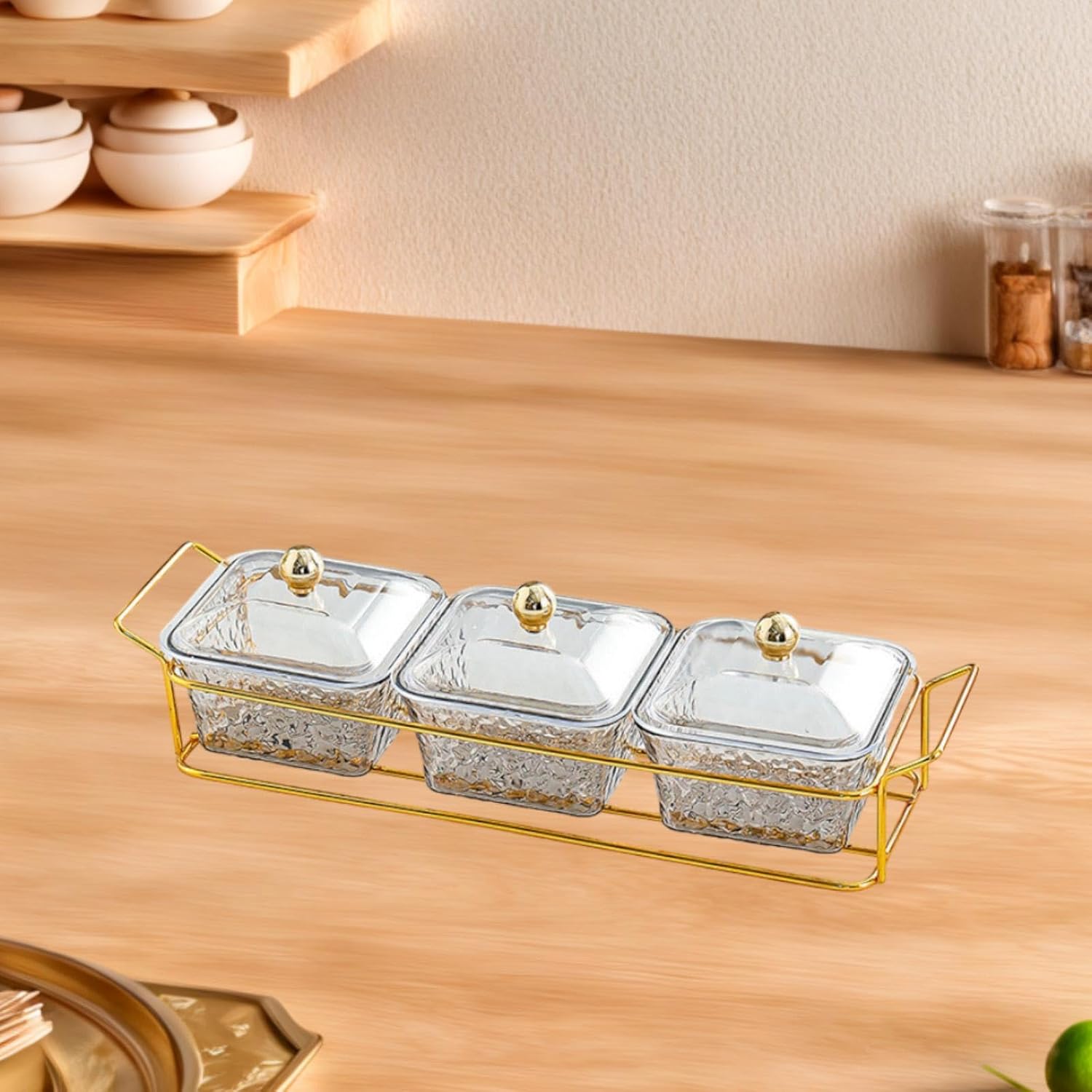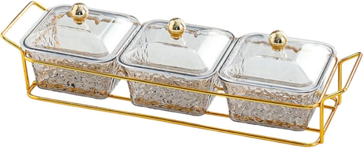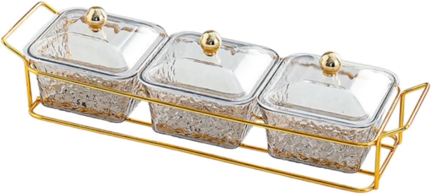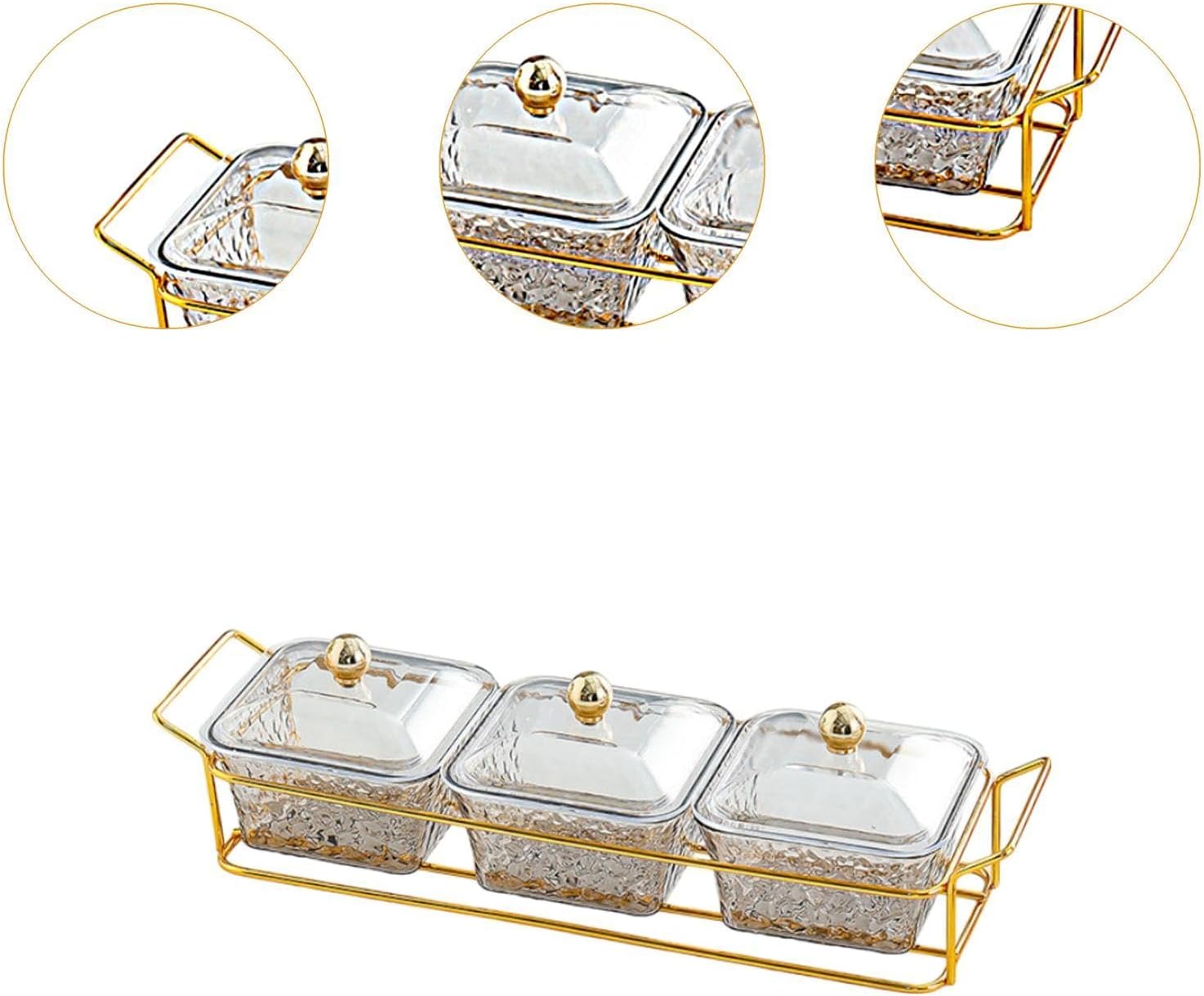 ?Multifunctional?: Divided serving dishes can be used to store nuts, dried fruits, snacks, fruits, appetizers, candies, etc. and can also be used as a condiment boxn?Widely Used?: Appetizer serving plate with tray is suitable for home, kitchen, dining room, restaurant, party, living room, office and other occasionsn?Dried Fruit Tray?: Dried fruit snack serving plate is made of glass and stainless steel material, sturdy structure, elegant and stylish appearancen?Multi Grids?: Multiple compartments dried fruit tray, can be placed individually to avoid mixing and keep the table clean and tidyn?Feature?: Candy nuts dish with lid, can effectively seal the food or seasoning inside the container, dustproof, with tray, easy to move