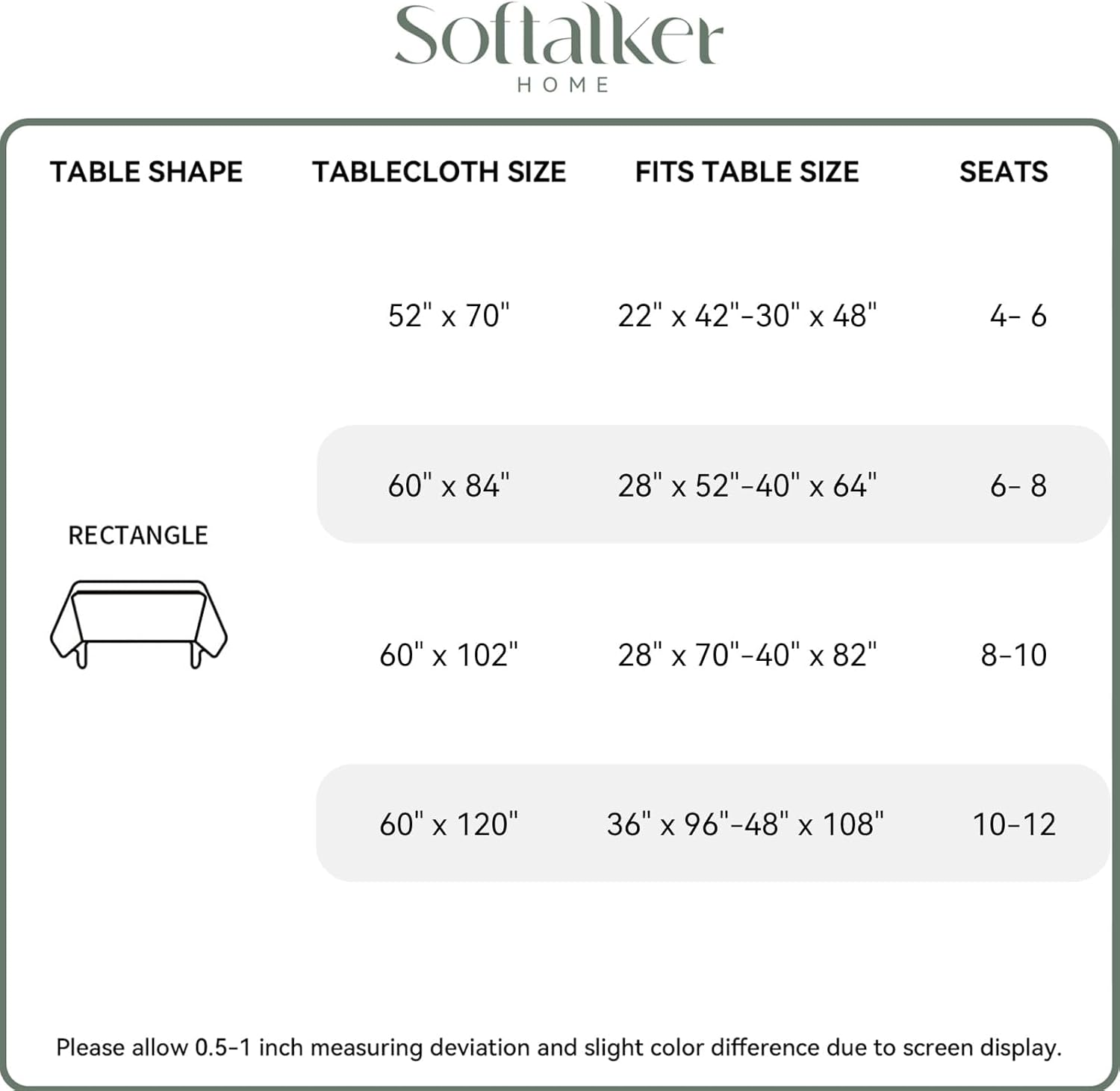 About this itemnMEASUREMENTS:Each package includes 1 piece of faux linen tablecloth measuring 60 W by 120 L inch.The tablecloth size is usually larger than your table size,Suitable for 10-12 people.nRUSTIC HOME DECOR:This Softalker burlap tablecloth is crafted from premium linen-like fabric and meticulously stitched,ensuring it stands out in both texture and long-Lasting.nWATERPROOF & SPILLPROOF:The faux linen tablecloth is specially treated to be 95% waterproof and stain resistant,combines elegance with practicality,making it a great option for any kind of setting.nVERSATILE USES:This rustic linen textured table cloth matches up with a wide range of indoor and outdoor dining occasions including dining tables,kitchen,cafes,afternoon tea,parties,etc.nEASY TO CARE:Wipes clean with a damp cloth (recommended), machine washable,no bleach,tumble dry on low,iron at low temperature.30-day money back guarantee.Feel free to contact us if you have any questions!