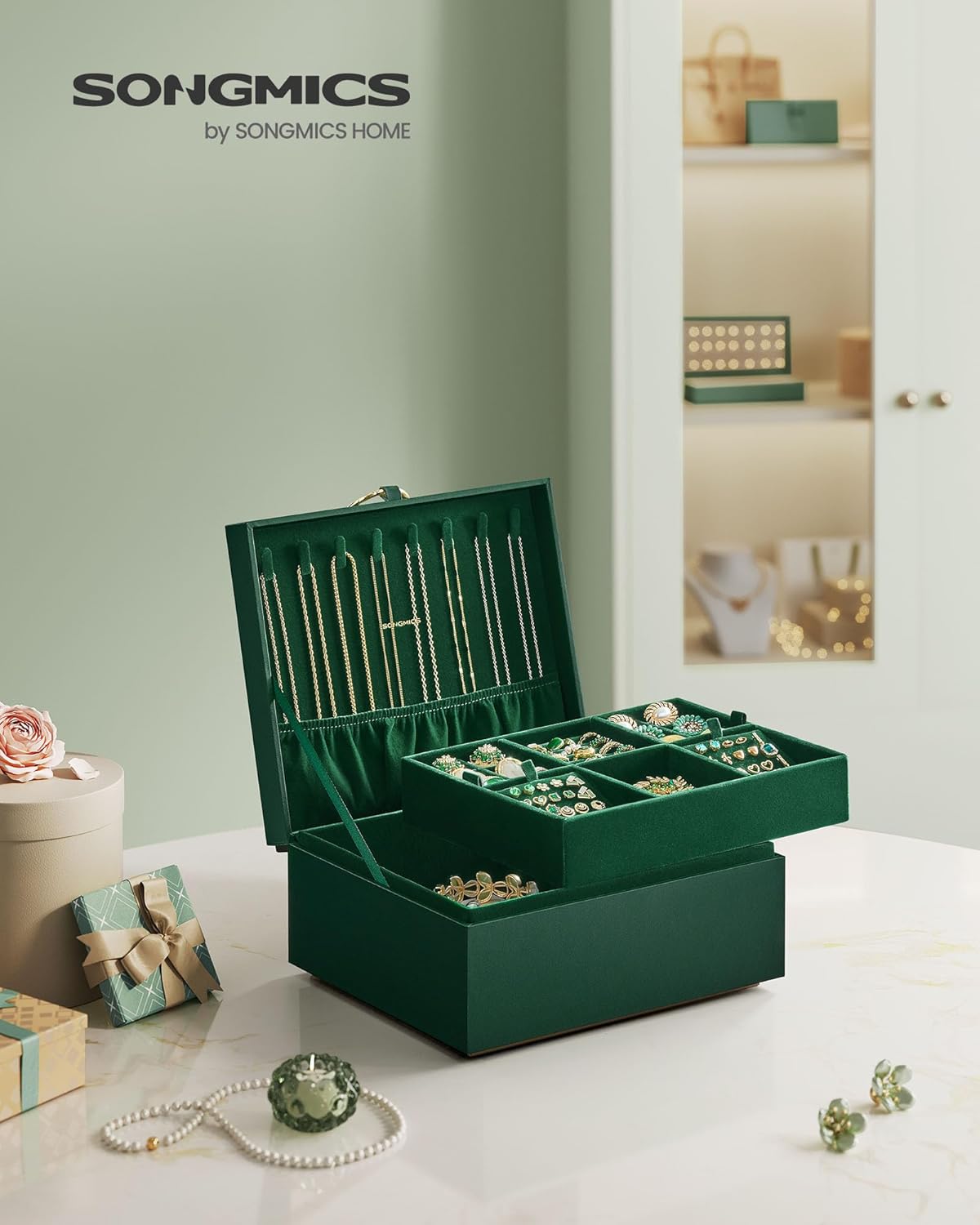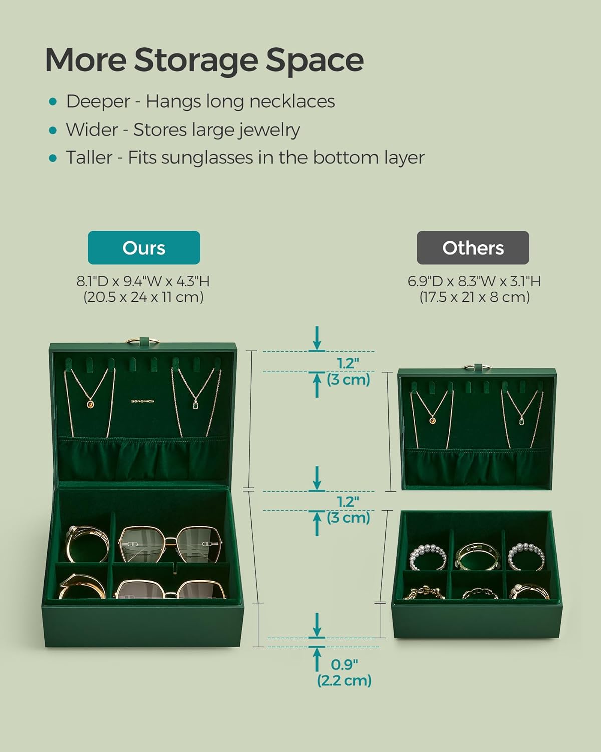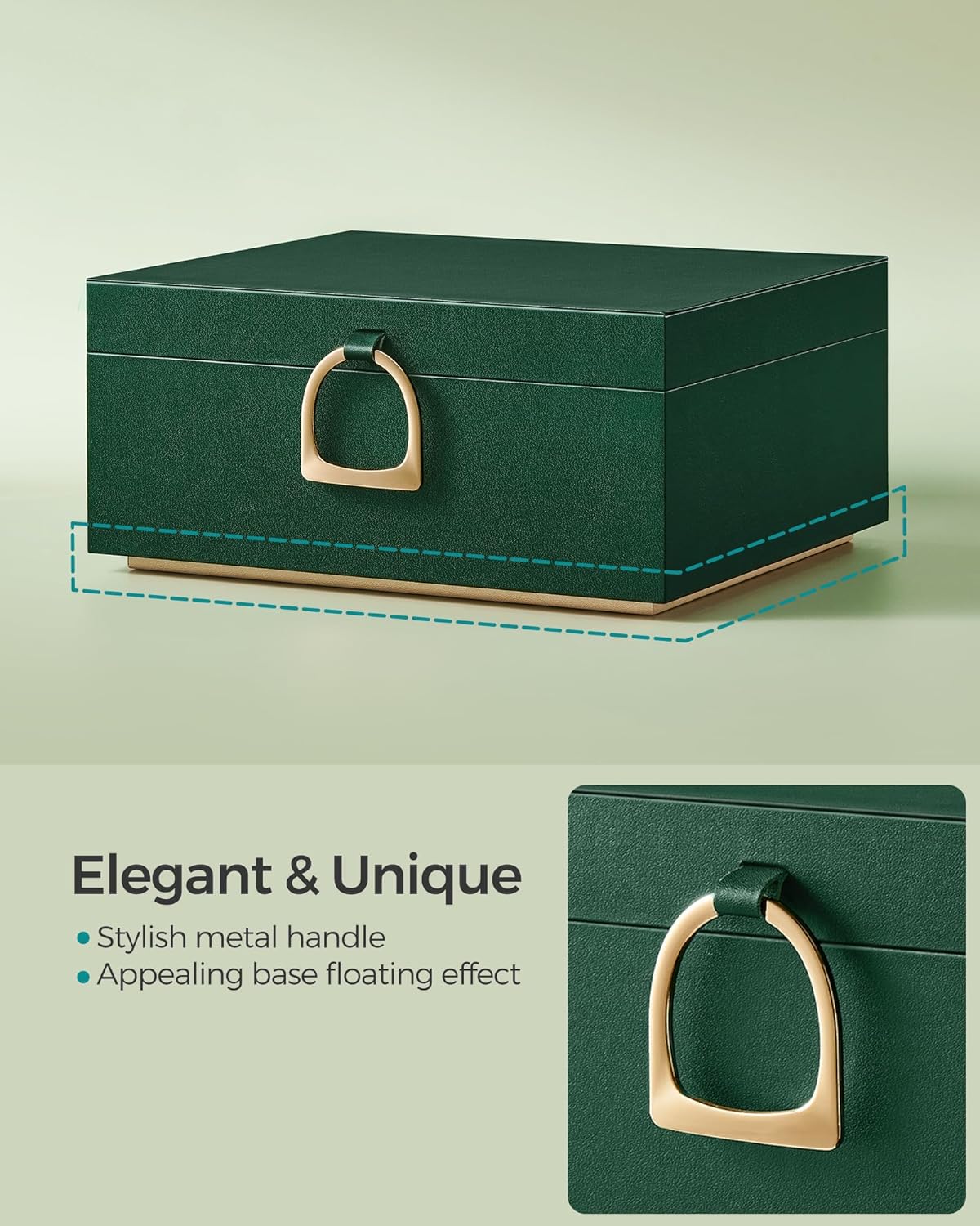 About this itemn[Stylish & Original Design] This eye-catching jewelry box boasts an elegant blend of green and gold, a unique metal handle for effortless opening and closing, and a remarkable base that creates a captivating floating effectn[Abundant Dedicated Storage] This spacious jewelry box helps to organize all your treasured accessorieshooks on the lid for long necklaces, the bottom layer for sunglasses, and multiple sections for earrings, studs, rings, watches, and braceletsn[Convenient Features] The stud earring boards can be positioned in the top tray, lower section, or outside the box to provide adaptable storage. Detachable partitions create space for larger items, while side handles allow easy lifting of the top trayn[Strong, Long-lasting, and Protective] Built with a robust MDF frame and soft velvet lining, this jewelry organizer offers all-round protection for all of your cherished accessories, shielding them from dust and scratchesn[Perfect Gift Idea] Delight your loved ones on special occasions such as Valentine’s Day, birthdays or anniversaries with this exquisitely-crafted, originally-designed jewelry box! Or, pamper yourself with this chic boxyou’re worth it!