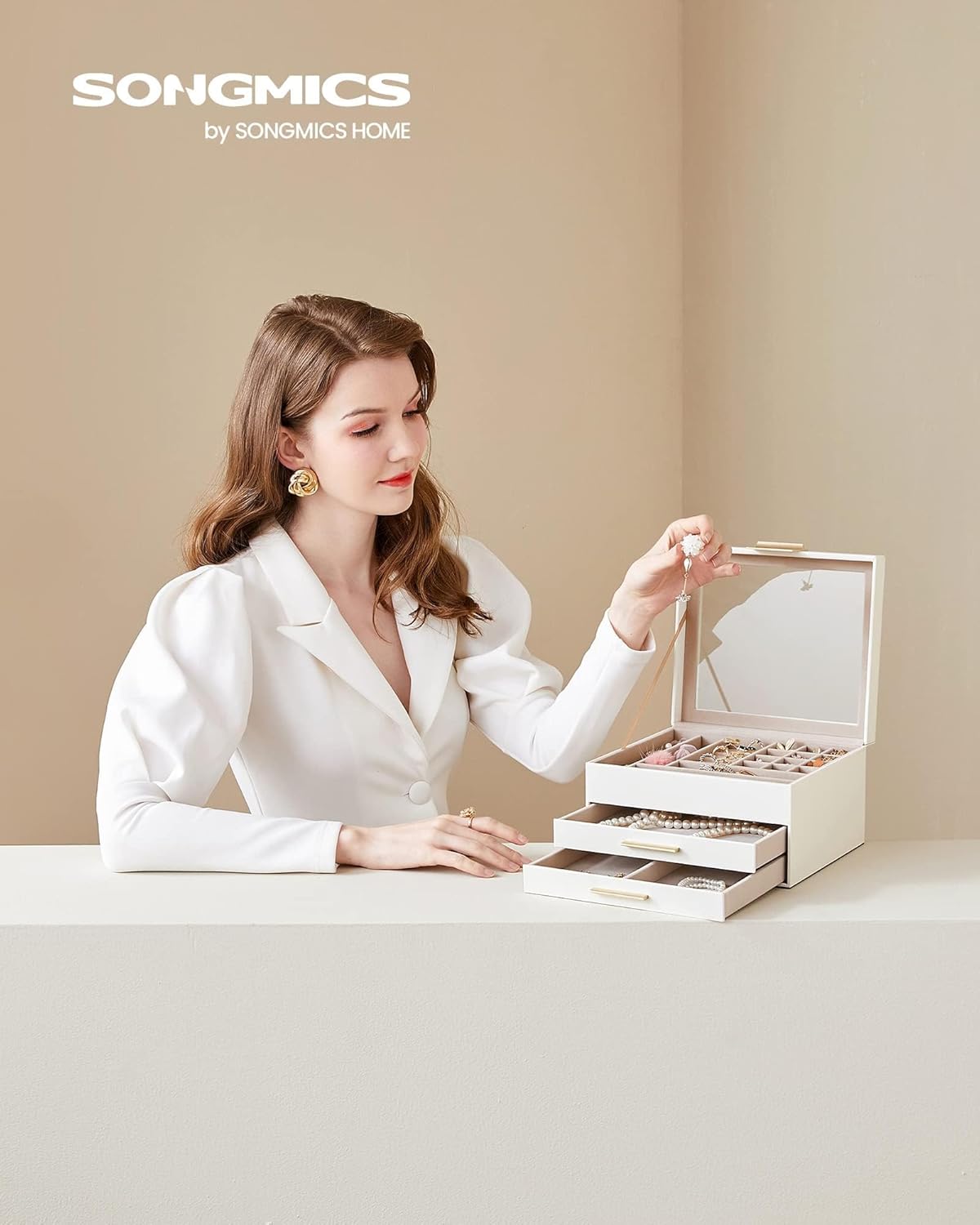 SONGMICS Jewelry Box with Glass Lid, 3-Layer Jewelry Organizer, 2 Drawers, for Big and Small Jewelry, Jewelry Storage, Modern Style, 8 x 9.1 x 5.3 Inches, Cloud White and Gold Color UJBC239WT
