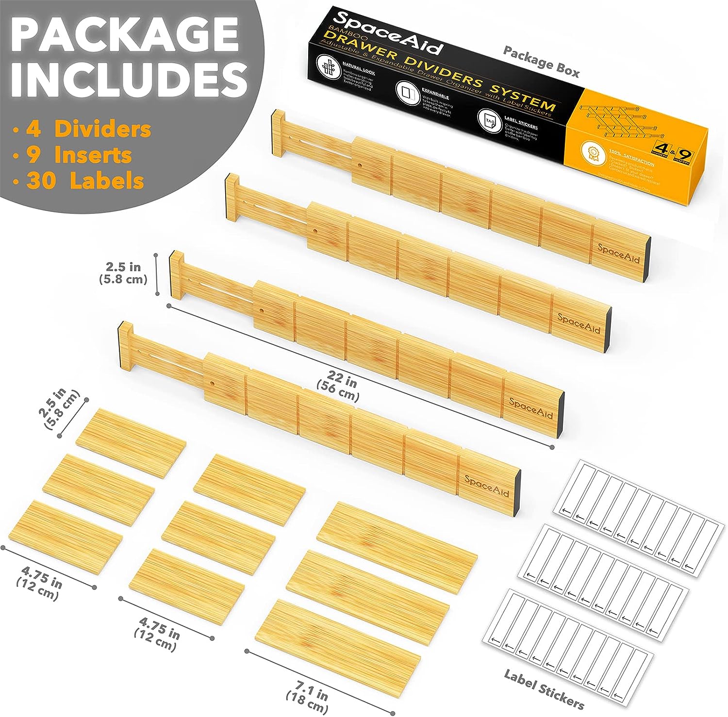 SpaceAid Bamboo Drawer Dividers with Inserts and Labels, Kitchen Adjustable Drawer Organizers, Expandable Organization for Home, Office, Dressers, 4 Dividers with 9 Inserts (17-22 in)