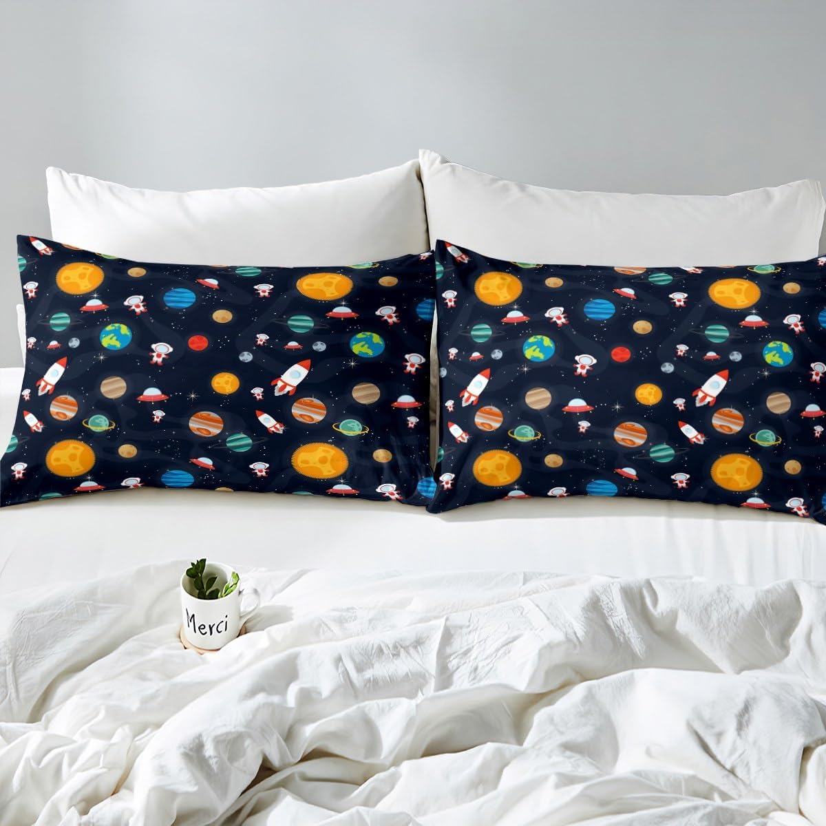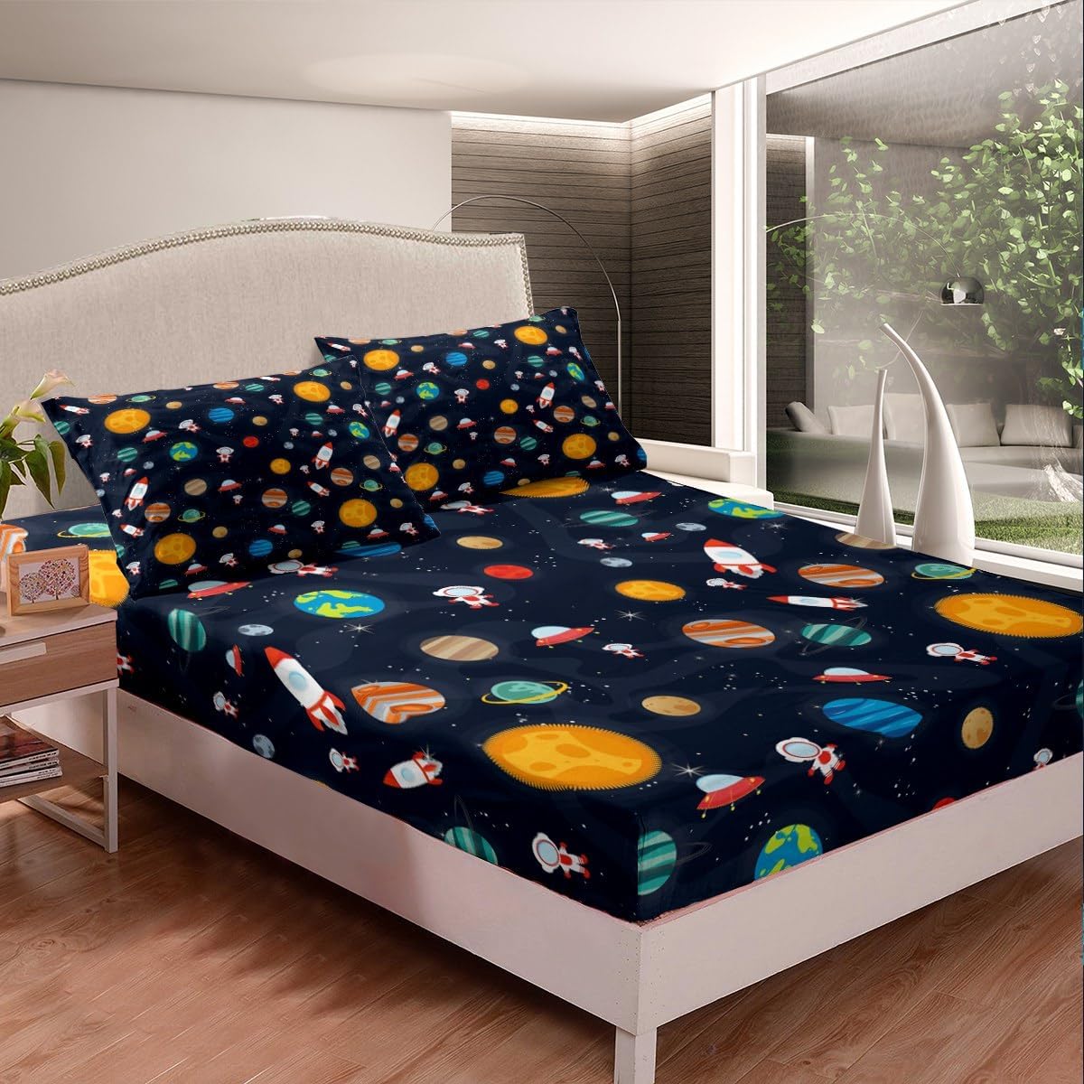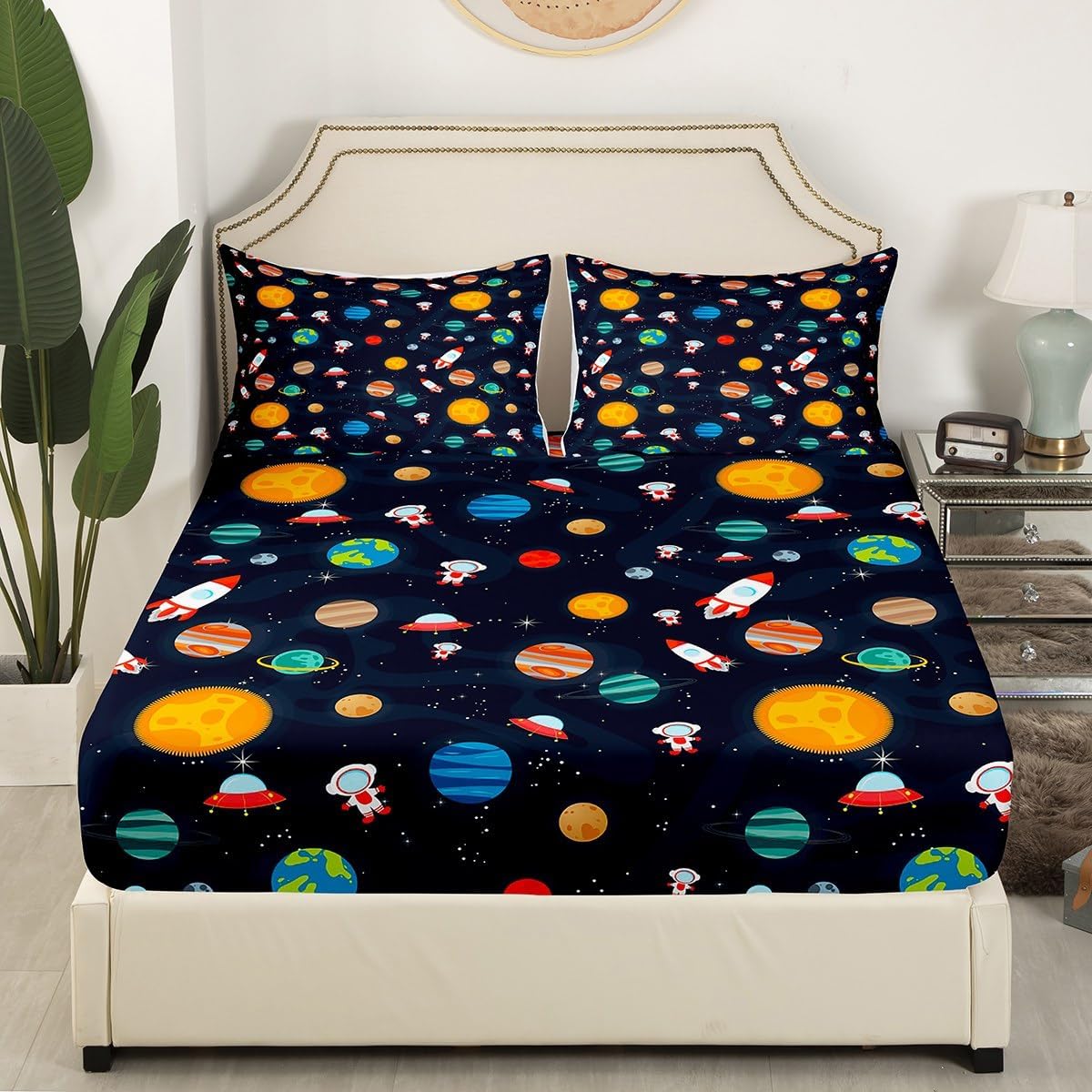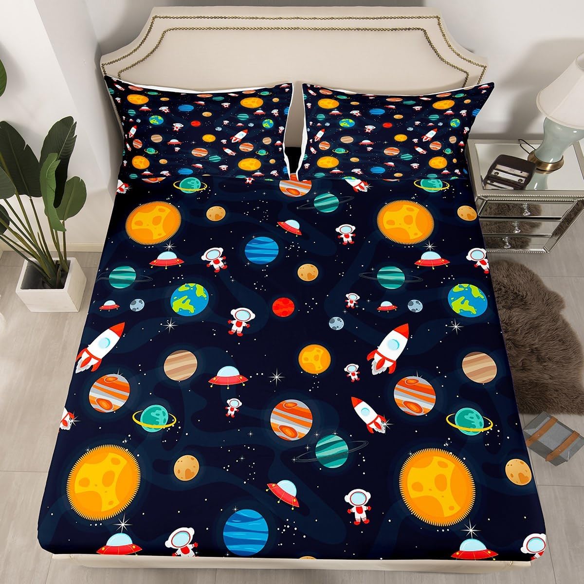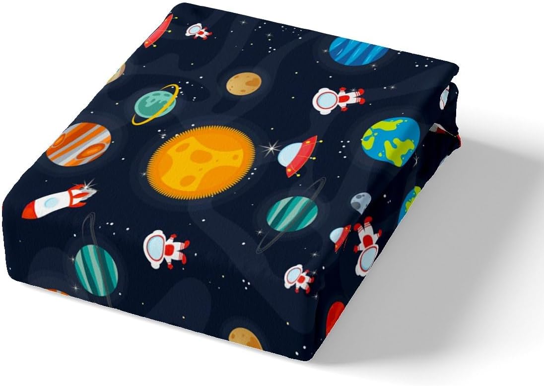 Spacecraft Planets Astronaut Fitted Sheet Queen Size Starry Galaxy Universe Bedding Sheet Set,Outer Space Bed Cover Ultra Soft Breathable Bedding 3 Pcs