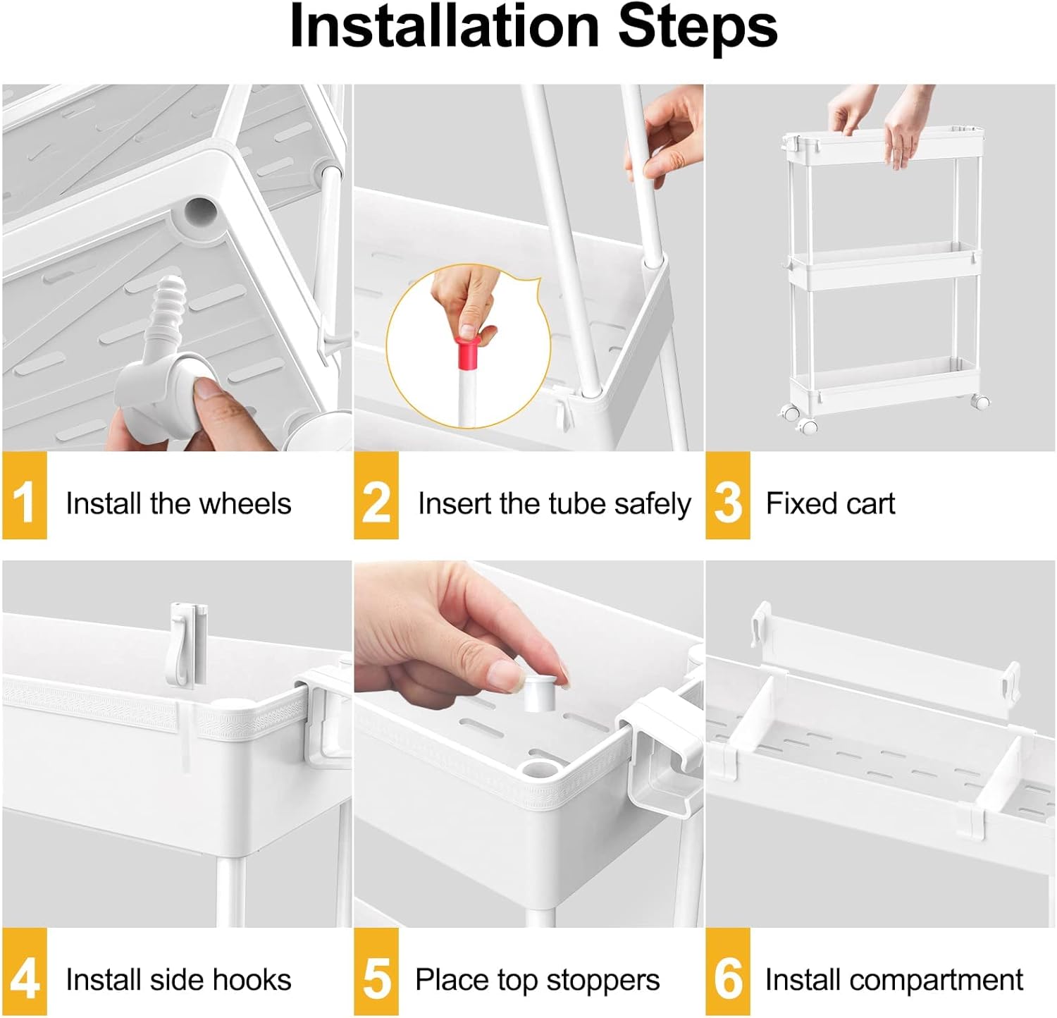 About this itemnFlexible Slim Storage Cart: The bathroom rolling utility cart is equipped with 360°rotating wheels, the storage cart can be moved to any corner of the house to store items. You can flexibly use it for storage in office, bathroom, laundry room, kitchen, narrow places,etcnAbundant Storage Space: The bathroom storage cart provides an extra layer of compartments, you can easily and rationally plan your space to store the required items, and quickly access them at a glance. The side hoops (included) can also provide you with more external storage spacenMultifunctional Storage Cart: Rolling storage utility cart is not just a cart, it can be adjusted to 2 or 3 layer shelf after removing the casters. The partical small utility cart can be used as bathroom dresser, kitchen spice rack to keep your space organized.nMesh Hollow Design: The storage trolley bottom adopts a mesh hollow, bid farewell to the residue of stagnant water during use, and keep things dry at all timesnEasy to Install: The mobile utility cart is made of high-quality plastic, providing you with stable and durable quality. At the same time it is very easy to install, so you can easily install successfully without additional tools