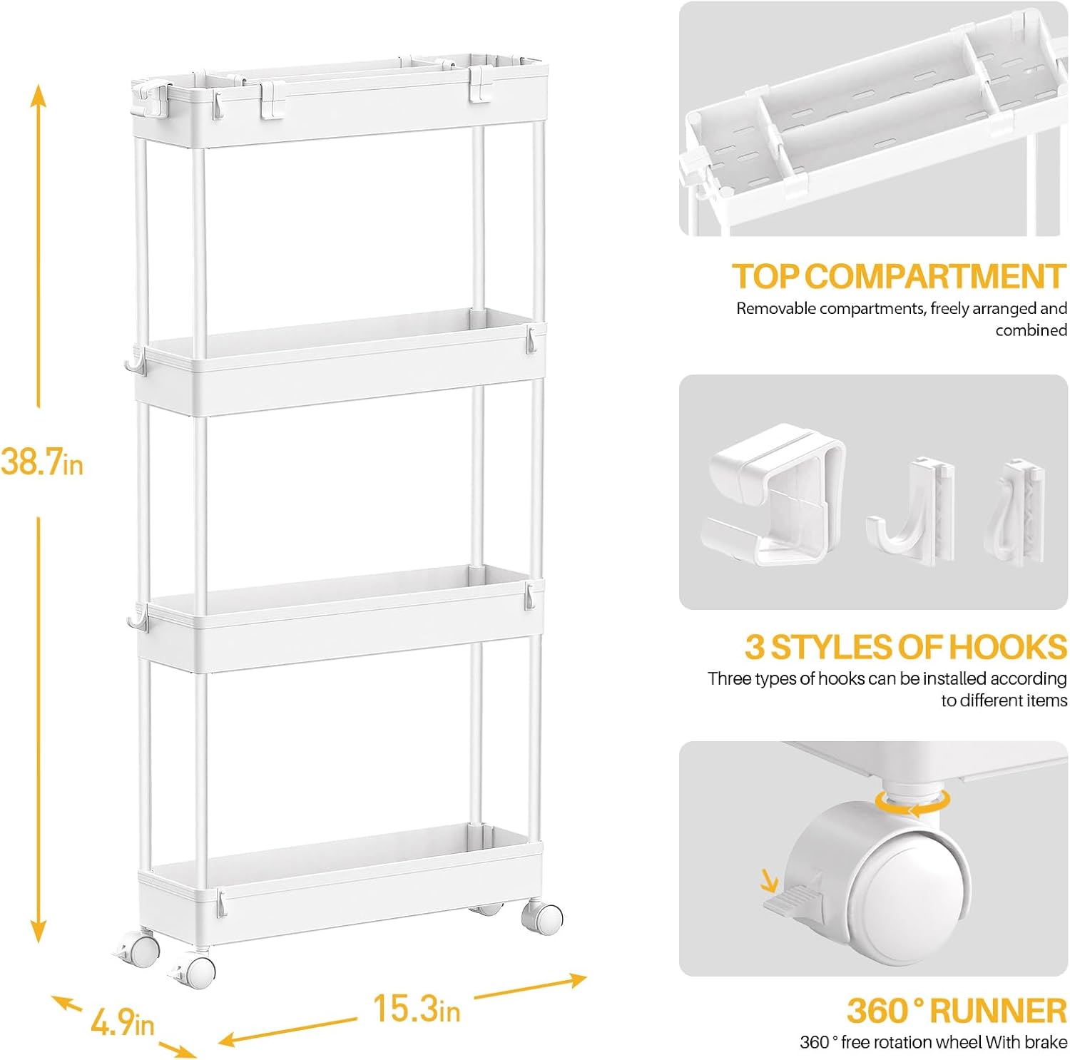 SPACELEAD Slim Storage Cart 4 Tier,Bathroom Organizer Rolling Utility, Mobile Shelving Unit Slide Out for Office, Kitchen, Laundry Room & Narrow Places,White