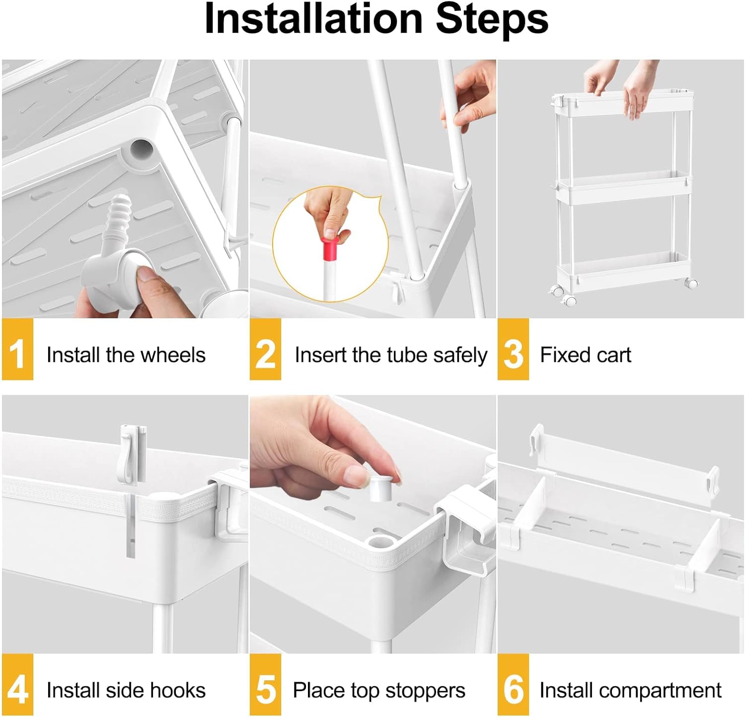 About this itemnFlexible Slim Storage Cart: The bathroom rolling utility cart is equipped with 360°rotating wheels, the storage cart can be moved to any corner of the house to store items. You can flexibly use it for storage in office, bathroom, laundry room, kitchen, narrow places,etcnAbundant Storage Space: The bathroom storage cart provides an extra layer of compartments, you can easily and rationally plan your space to store the required items, and quickly access them at a glance. The side hoops (included) can also provide you with more external storage spacenMultifunctional Storage Cart: Rolling storage utility cart is not just a cart, it can be adjusted to 2 or 3 layer shelf after removing the casters. The partical small utility cart can be used as bathroom dresser, kitchen spice rack to keep your space organized.nEasy to Install: The mobile utility cart is made of high-quality plastic, providing you with stable and durable quality. At the same time it is very easy to install, so you can easily install successfully without additional toolsnMesh Hollow Design: The storage trolley bottom adopts a mesh hollow, bid farewell to the residue of stagnant water during use, and keep things dry at all times