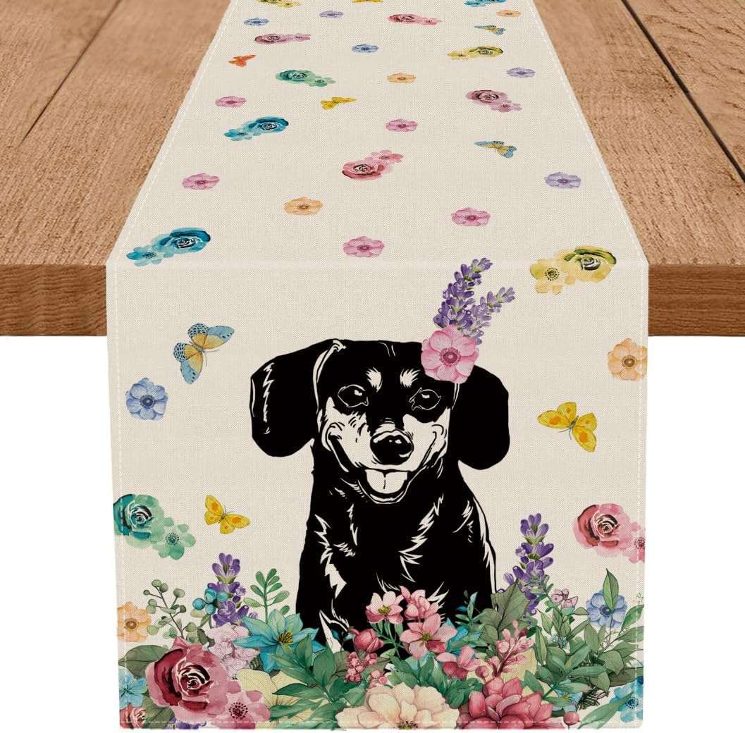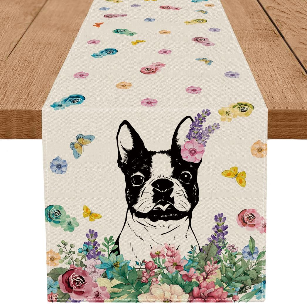 Spring Table Runner French Bulldog Dog Floral Table Runners Burlap Table Decoration Home Kitchen Dining Decor Indoor Outdoor Party Supply 13 x 72 Inch
