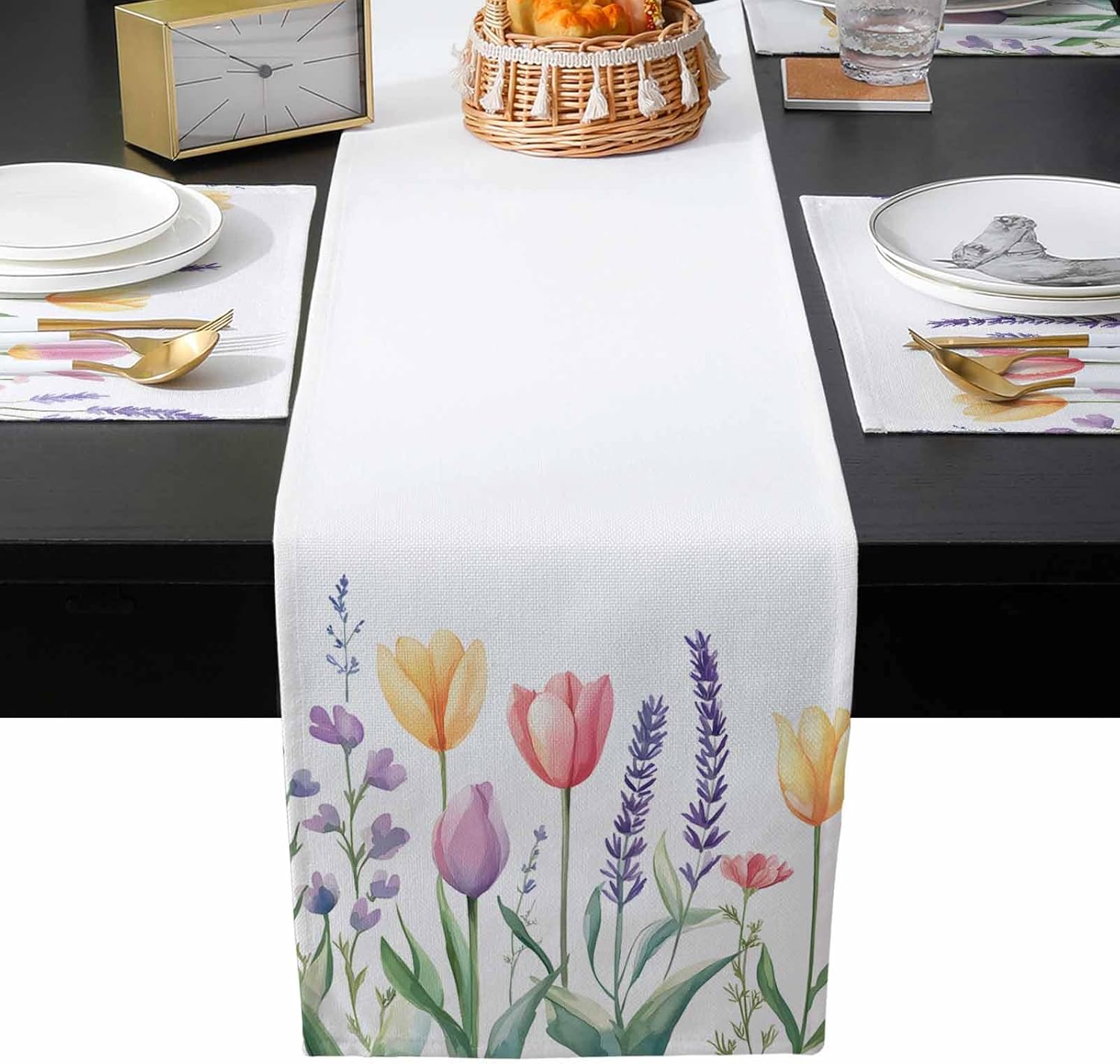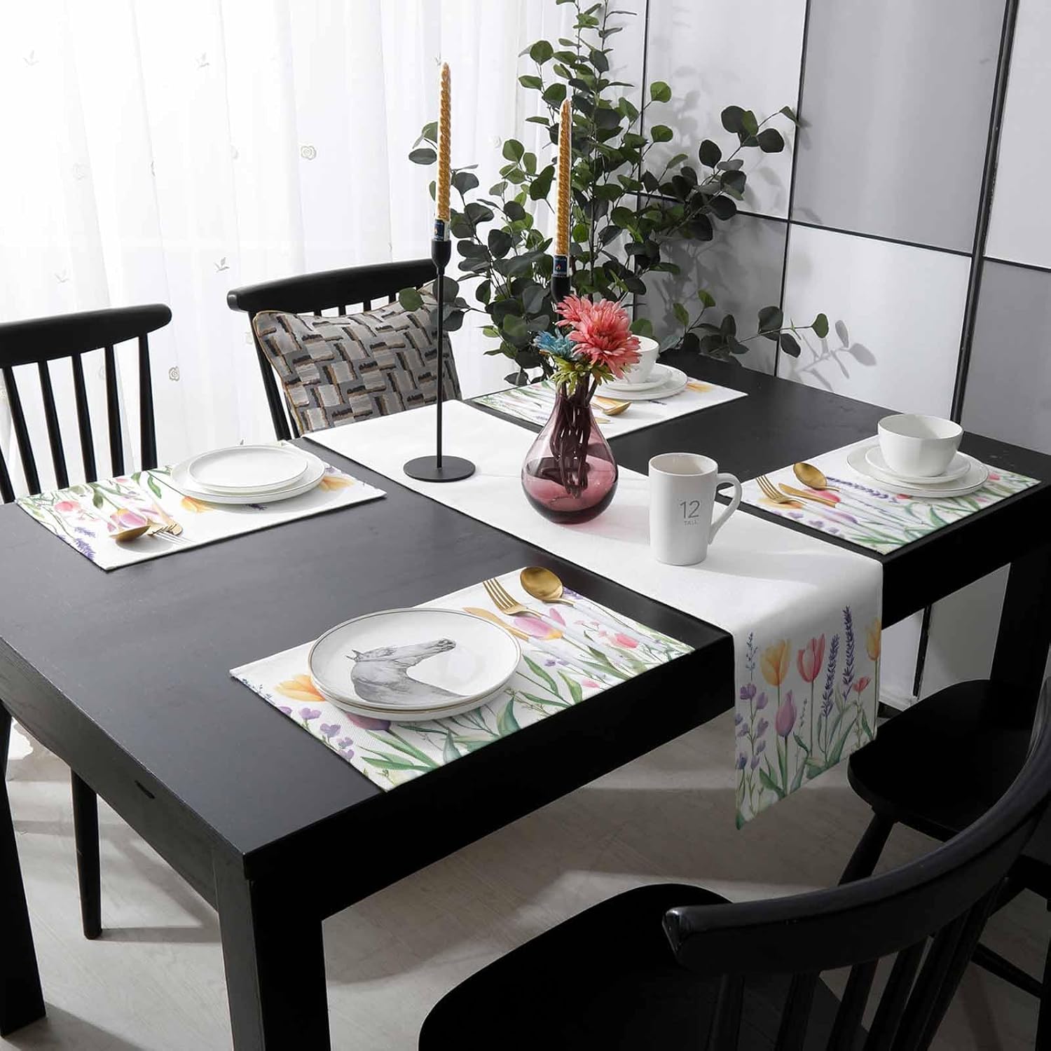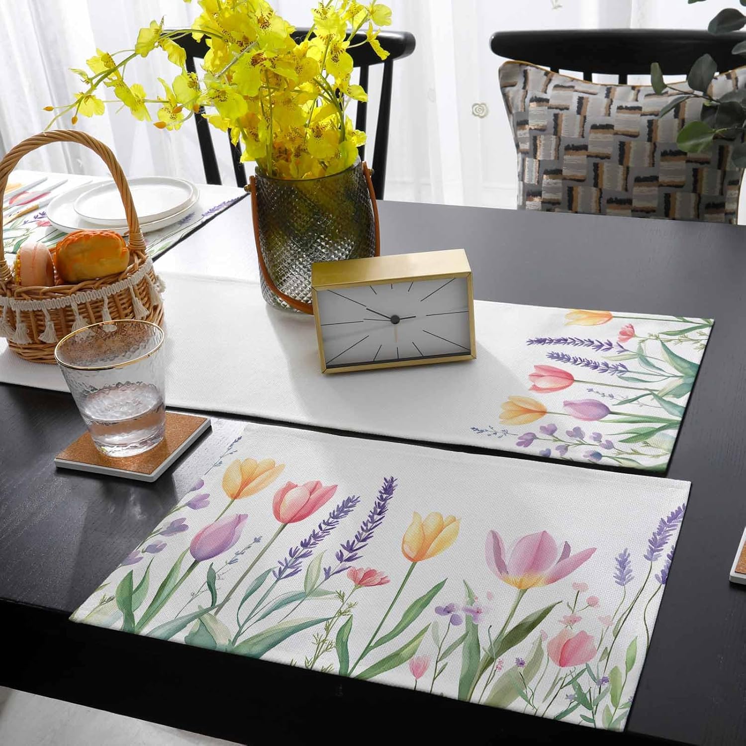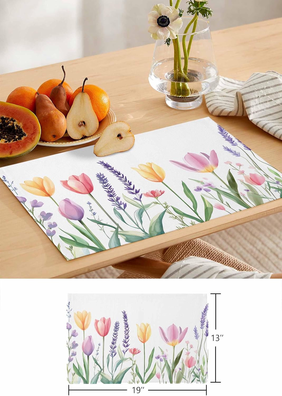 Spring Tulip Table Runner and Placemats for Dining Table, Burlap Coffee Table Runner 90 Inch Long Colorful Botanical Floral Leaves Herbs Washable Table Mats for Kitchen Farmhouse Placemats Set of 6