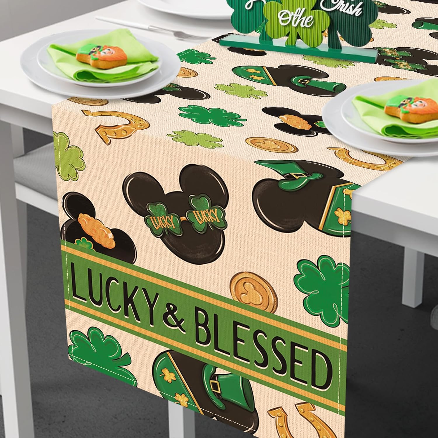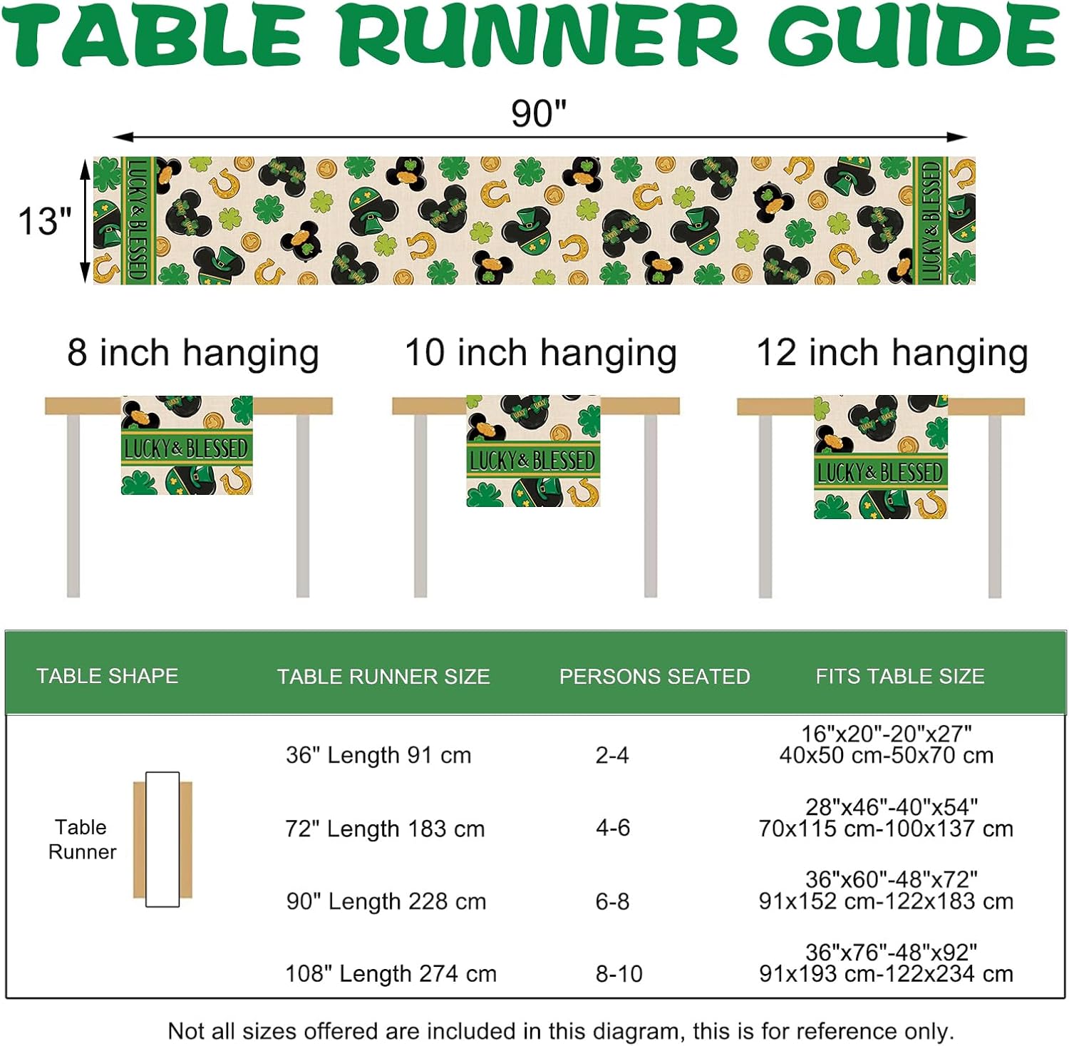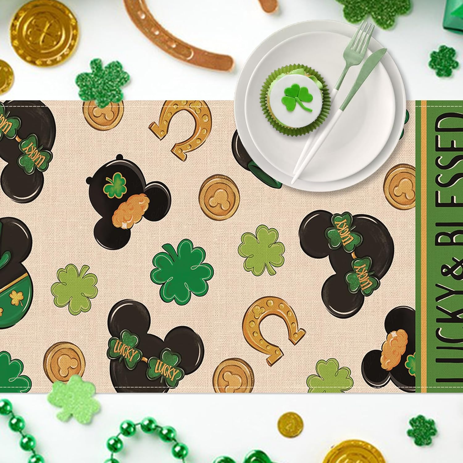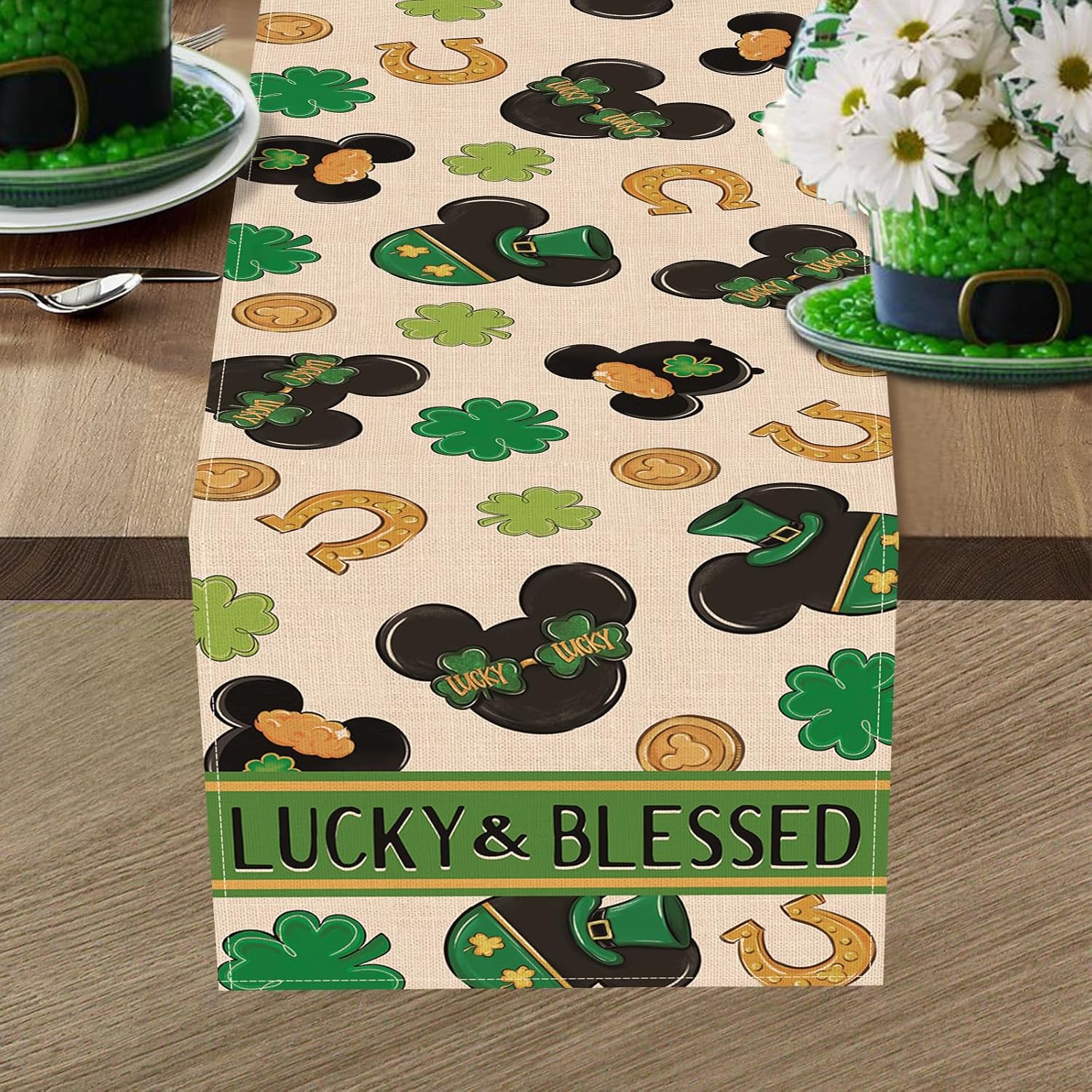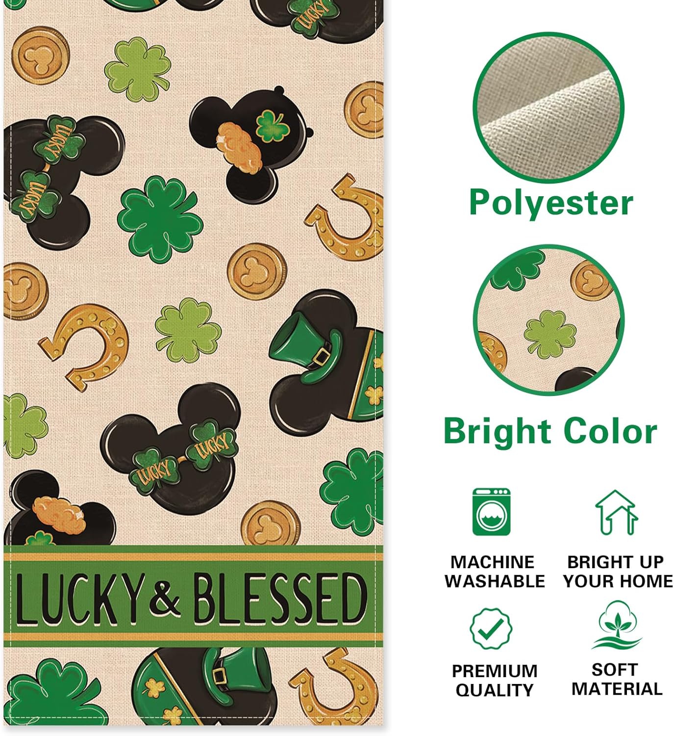 About this itemnPolyesternUniquely Designed Table Runner: Our Saint Patrick’s Day tabletop runner is designed with the current elements to add style and vibrancy to your home. Table runner is printed with vivid shamrock, clover, horseshoes, gold coins patterns, which is the perfect decoration for St. Paddy’s Day. Express your positive outlook on life by decorating your coffee table, dining table, buffet and kitchen with our seasonal table runners in a variety of themesnHigh Quality Table Decor: Made of 100% spun polyester, this stylish table scarf is durable and eco-friendly. 13