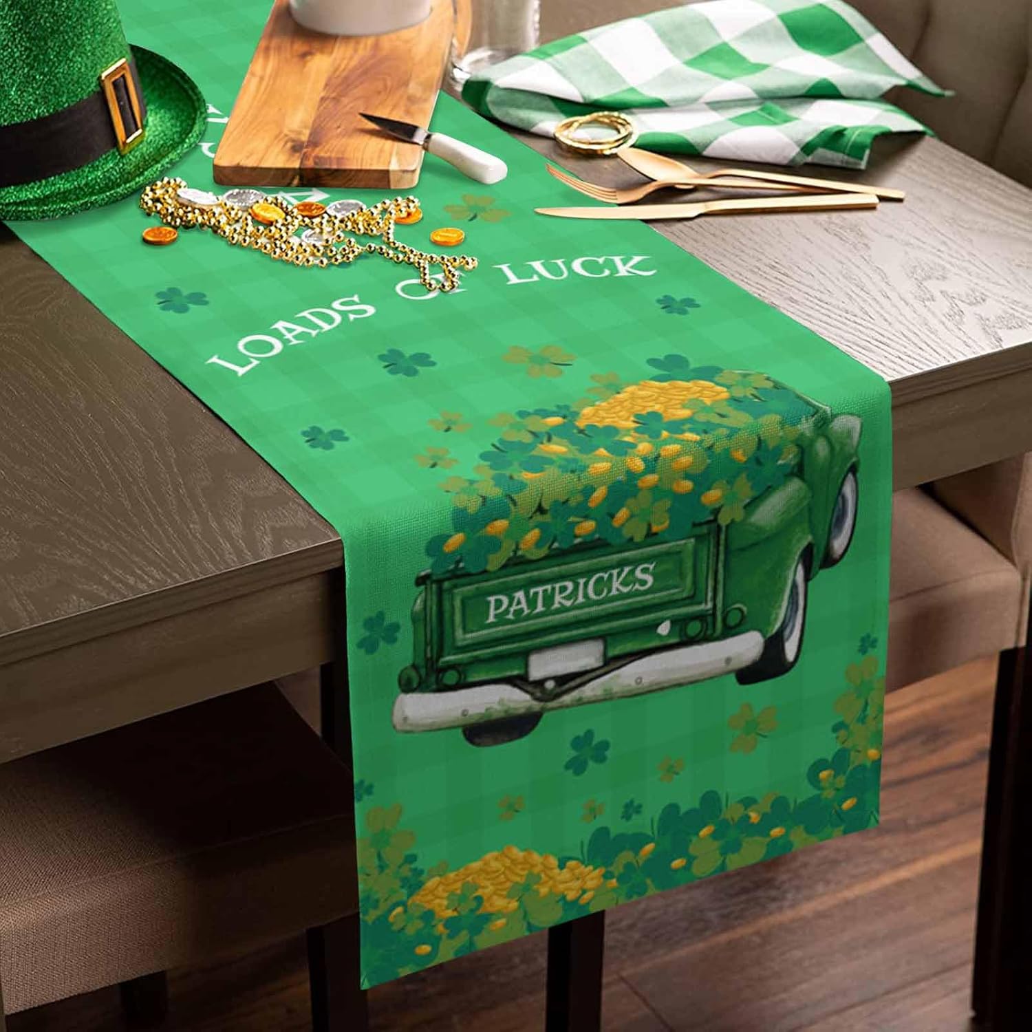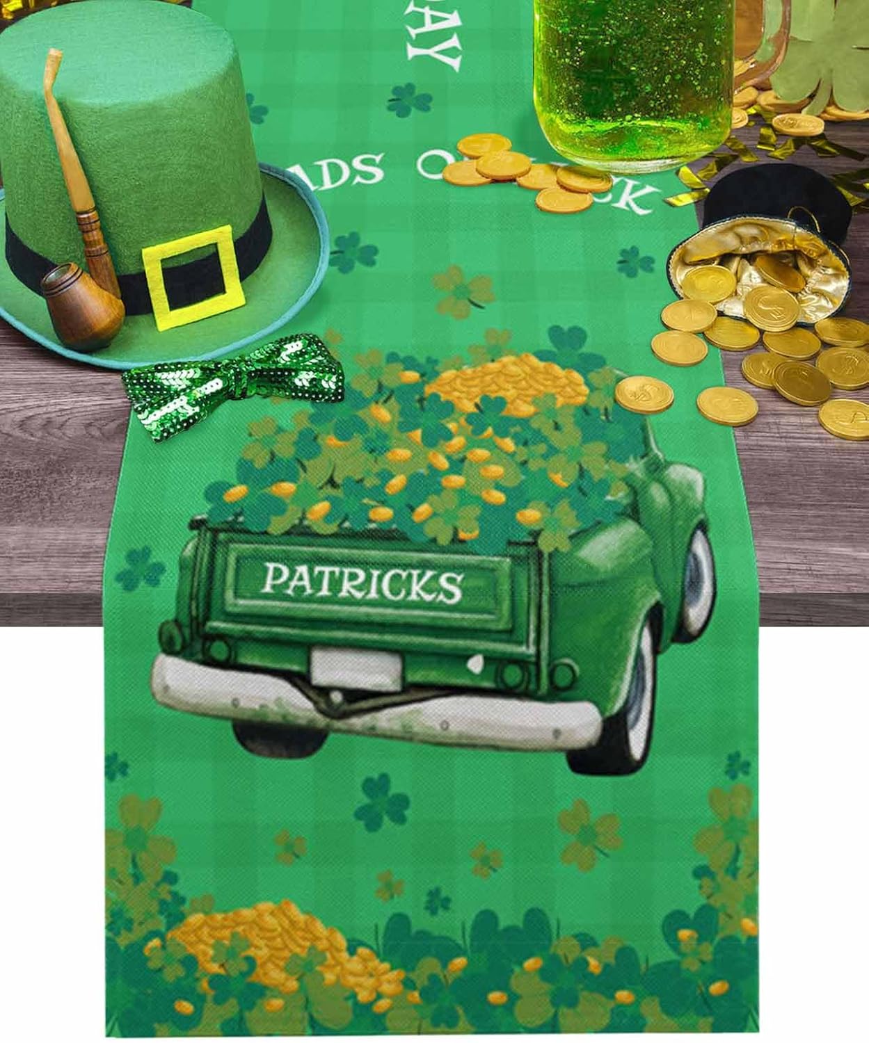 St Patrick’s Day Table Runner Shamrock Truck Small Table Runners Loads Of Luck Gold Coin Green Check Plaid Washable Cotton Linen Dresser Scarf Kitchen Dining Table Decor for Spring Holiday Party 13×48