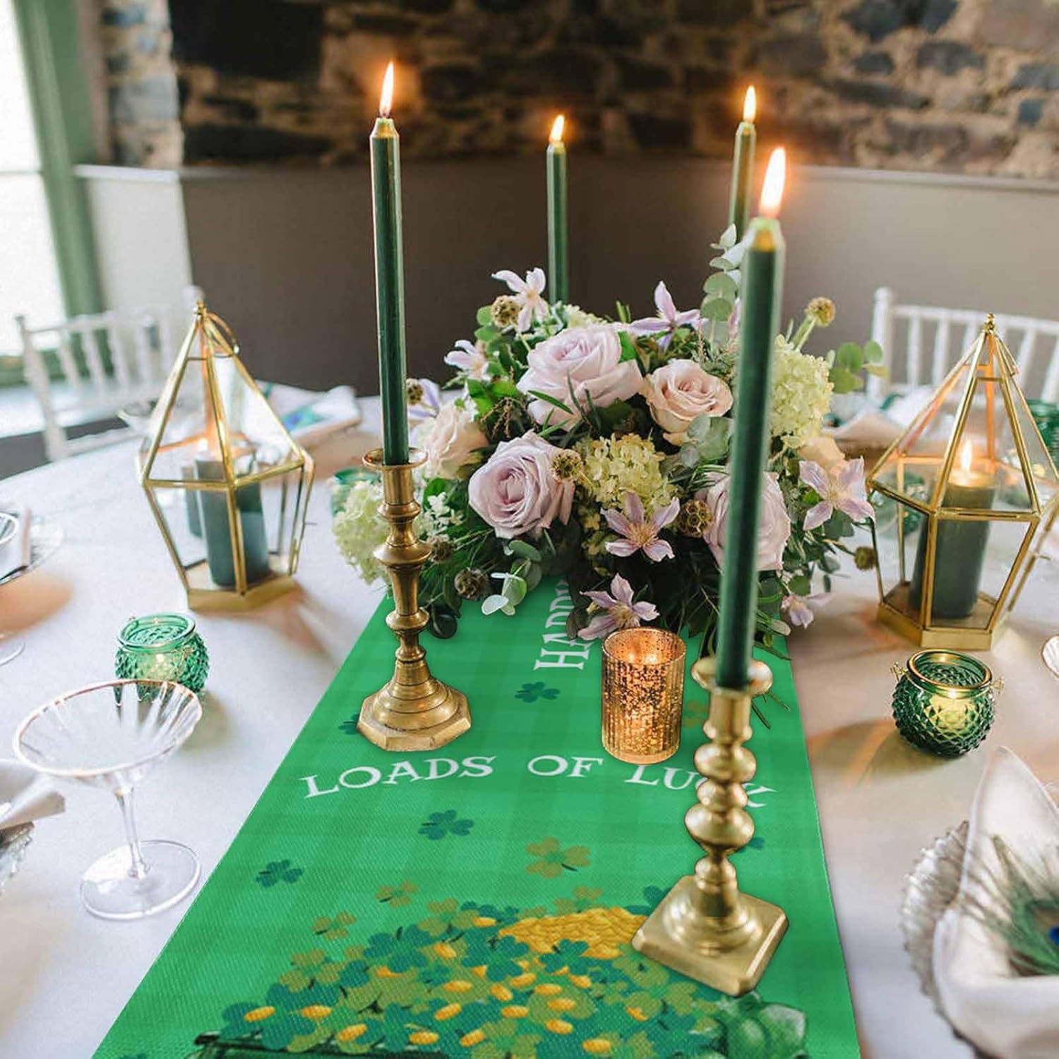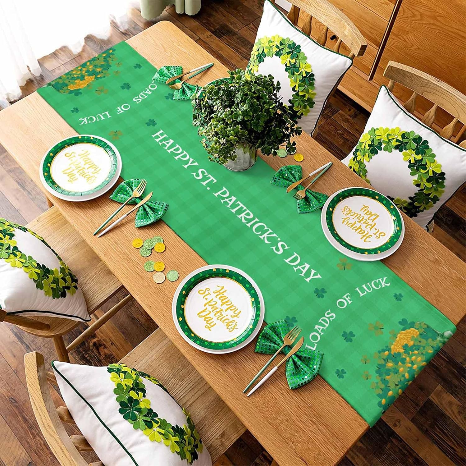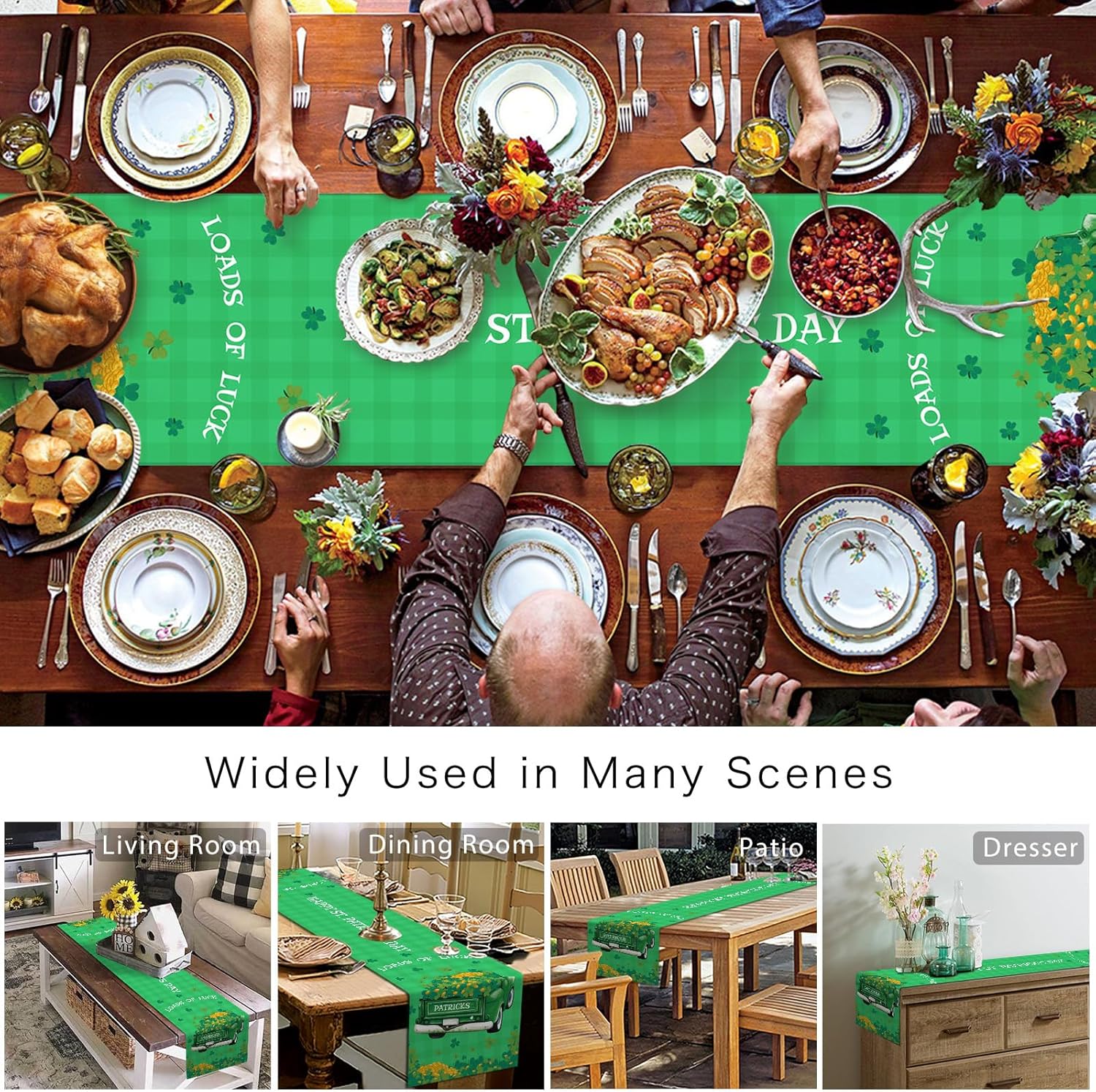 About this itemn100% PolyesternPremium Fabric – Made of high-grade polyester cotton linen table runners which are soft, reusable and wrinkle-proof. Perfect to protect your dining table from food stains and scratches.nTable Runner Size – This table runner is 13×48 inches, appropriate for all round, square or rectangular tables. Full of the spring atmosphere, exquisite decor for your home dinner party. Also well-cut in sewing, with a premium edge and smooth surface.nVersatile Occasions – Perfect for daily celebration holiday party decor, great decorative table runners for your kitchen, dining table, hotel, restaurant, cafe, dessert tables, cabinets, and sideboard. Even an ideal gift for banquet, dinner parties, receptions, housewarming, family gathering, tableware setting decor.nSt Patrick’s Day Table Decor – Shamrock table runner matches all kinds of decorations for your dining tables and furniture. Vibrant color increases the charm of table decor in your home, this will definitely impress your guests.nEasy Care & Home Decor – Machine wash and lay the table dresser scarf flat to dry. Do not bleach. Stay the same and as new after washing. Combine practicality and beauty, it easily folded and occupies a small area.