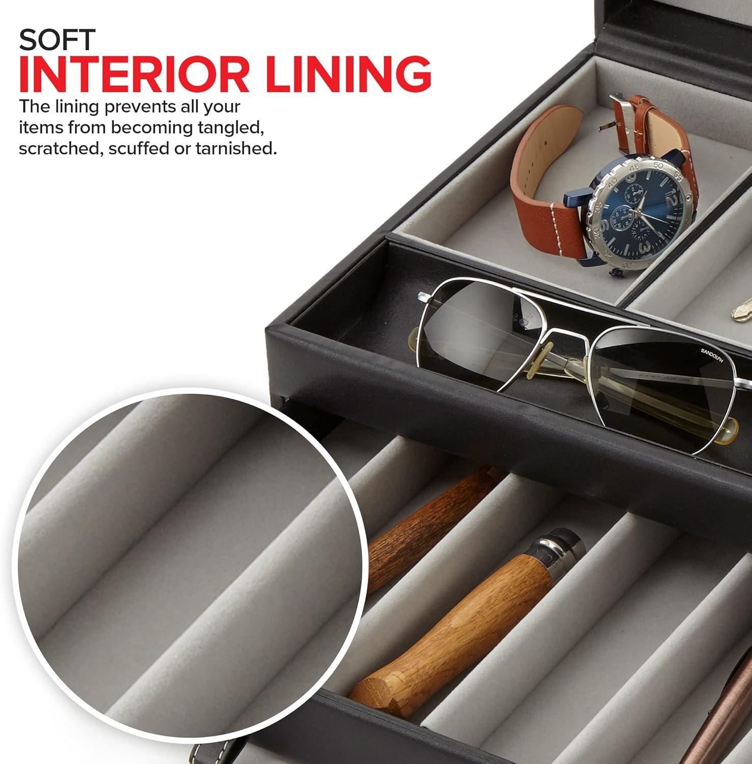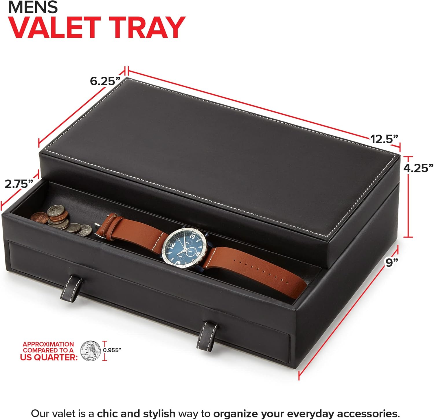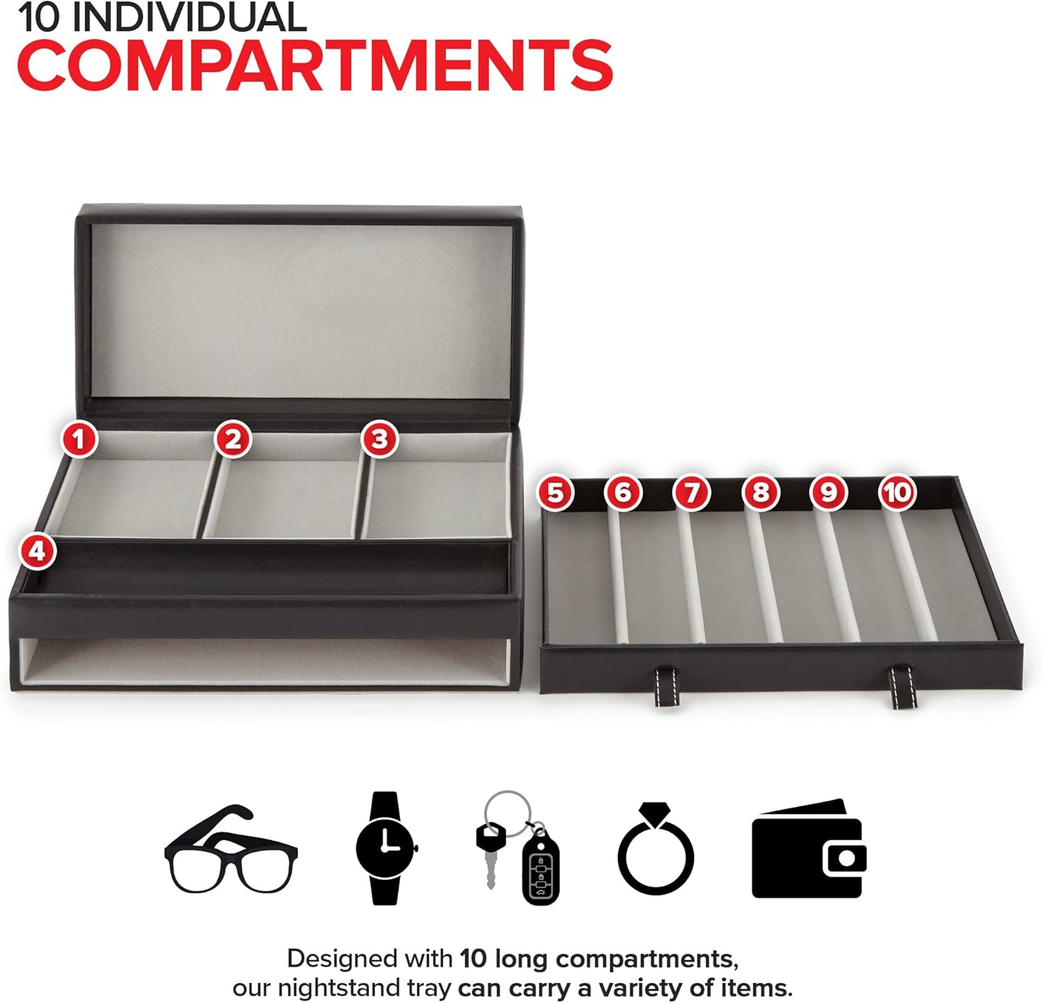 About this itemnSophisticated Organizer for Men: Our valet is a chic and stylish way to organize your everyday accessories. Made with a smooth, faux leather exterior, and a soft felt interior, our organizers compliment any home décor.n10 Individual Compartments: Designed with 10 long compartments, our nightstand tray can carry a variety of items like your wallet, keys, jewelry, cufflink sets, and more!nEverything in Arms Reach: Never lose or misplace your valuables again! Our accessory station keeps all of your personal belongings neatly stored in one place.nRemove Clutter: Time to clean out your junk drawer! Our caddy not only organizes your things, the soft interior lining prevents them from becoming tangled, scratched, scuffed or tarnished.nSpace Saver: Made to be small and compact, our holder won’t take up too much space on top of your bedroom dresser, drawer, or night-stand. Dimensions: 12.5 Length x 6.25 Top Width x 9 Bottom Width x 4.25 Height.n See more product details