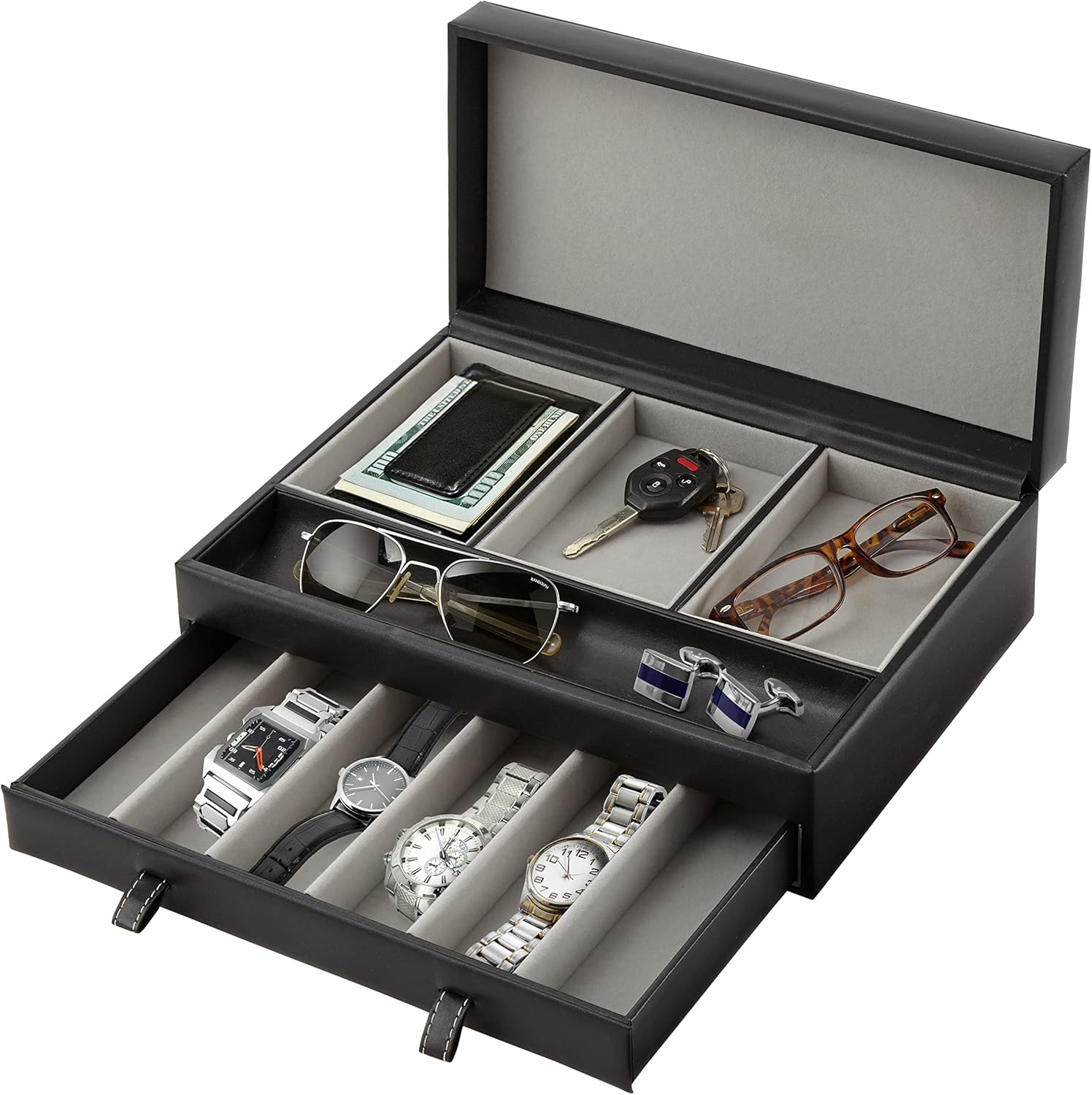 Stock Your Home Mens Valet Tray, Men’s Jewelry Box, Night Stand Organizers and Storage, Bedside Table Organizer, Watch Box for Dresser, Faux Leather (Black & Gray)
