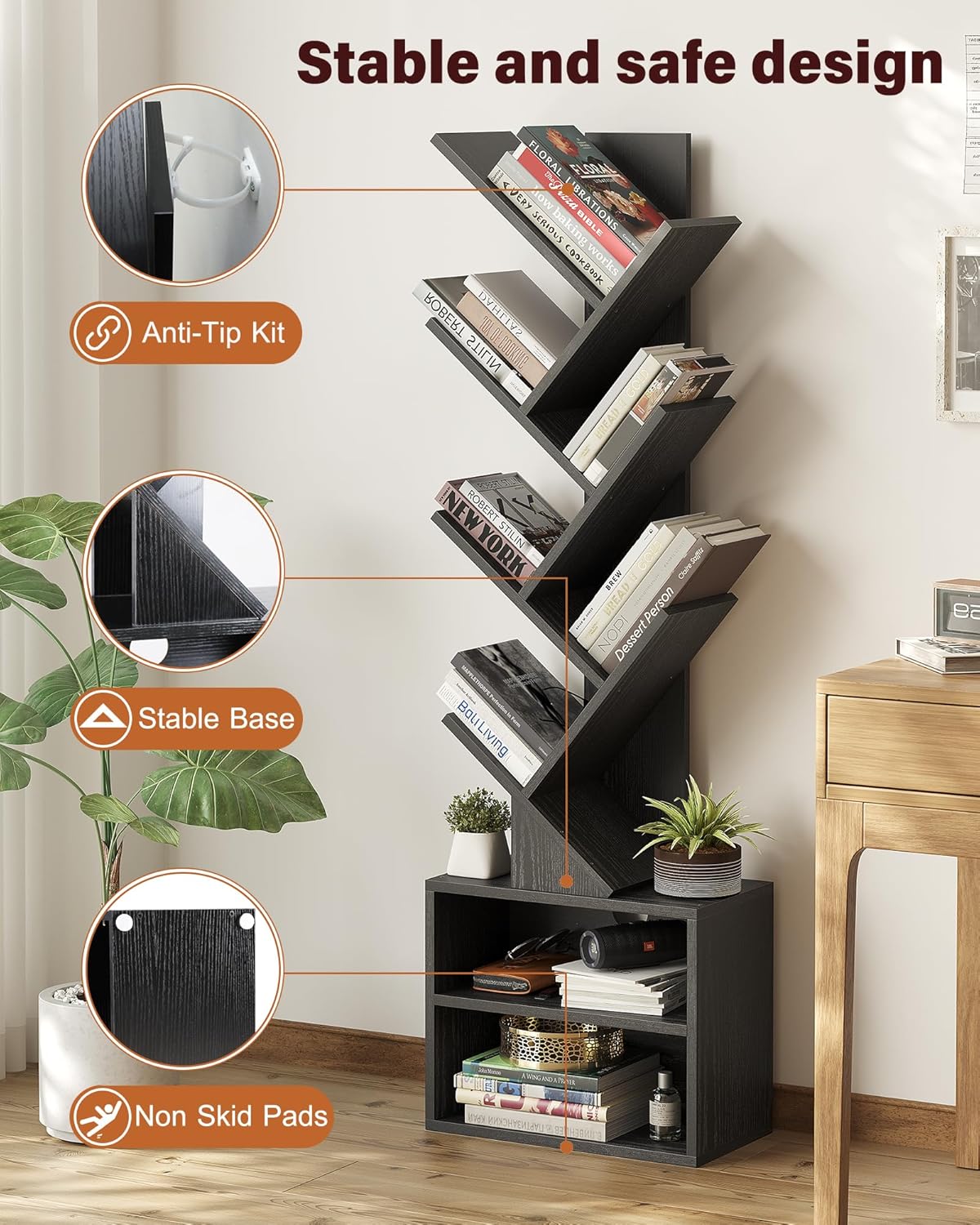 About this itemnSpace-Optimizing Design: This floor-standing tree bookshelf boasts a compact footprint, making it an excellent choice for small spaces like bedrooms, home offices, corners, and hallways. Its narrow profile optimizes floor space while providing ample storage for books, CDs, decorations, and more.nDurable and Stable Construction: Crafted from high-quality MDF material with a sturdy base and reliable backboard, this bookshelf ensures enhanced load-bearing capacity and robust stability. The unique tree structure and anti-tip accessories offer added security, making it an ideal choice for households with children or pets.nVersatile Style and Finish: Featuring a rustic brown faux wood finish and a branch-inspired design, this bookshelf seamlessly combines modern and vintage elements. Its eye-catching aesthetic complements various decor styles, adding a touch of sophistication to any living room, bedroom, or home office.