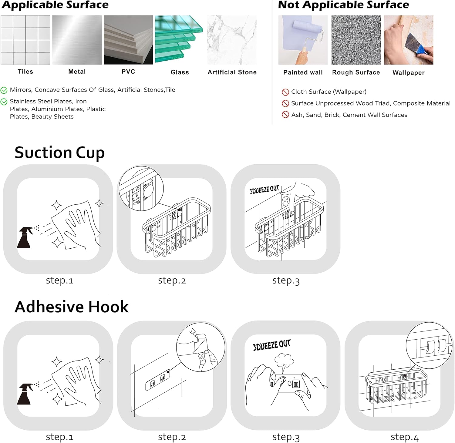 About this itemnSuction Cups Doesn’t Work Well On Natural Material, Like Stone, Cement, Granite, Silgranit, and Marble etc.. Or Surface has rough texture.nKitchen Sink Basket Holds Sponge, Scrubber, Scouring Pad, Drain Stopper, And More! Great For Kitchen, Workplace, Bathroom, Craft Room, Classroom, Or Office SinksnOverall Size 7.48