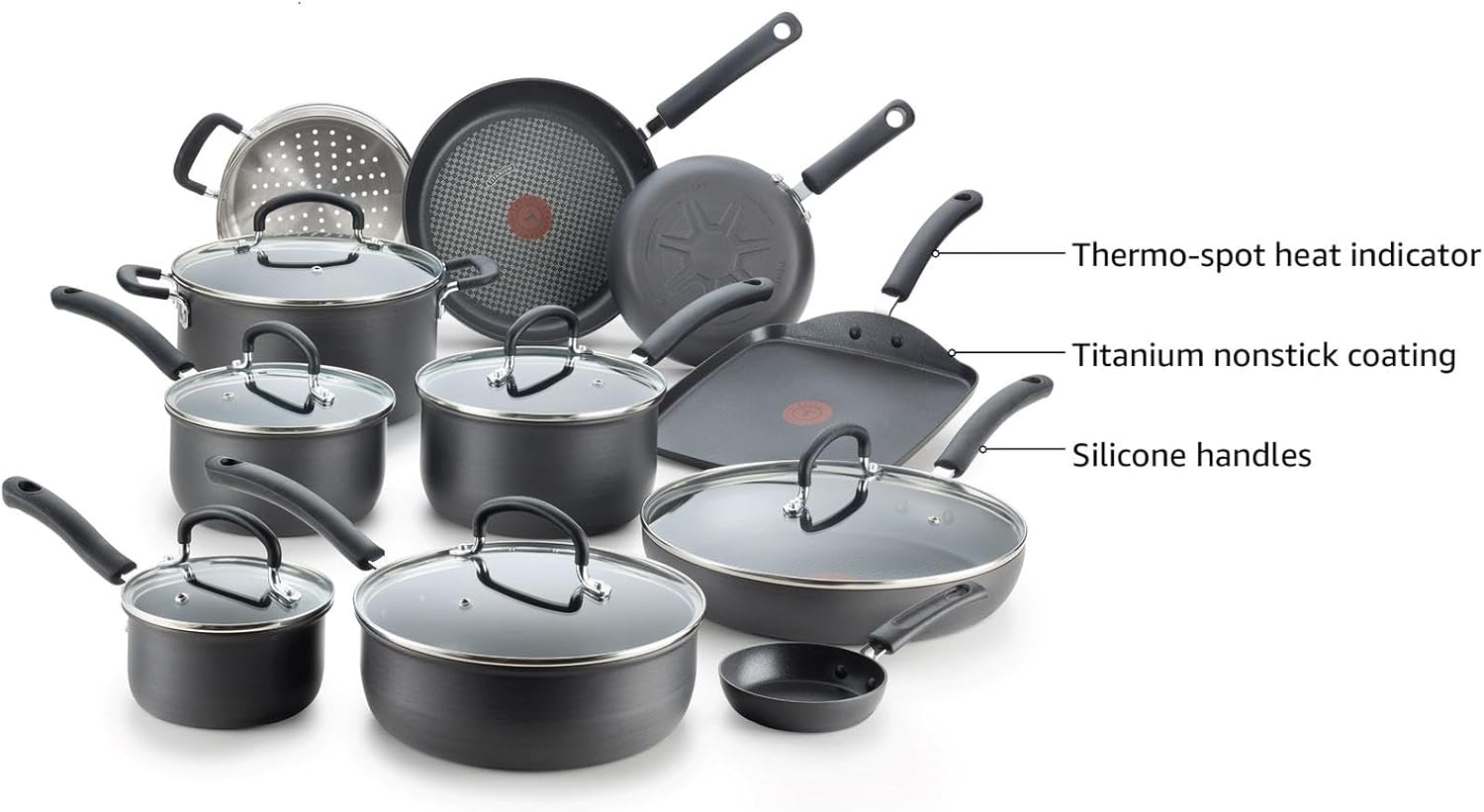 T-fal Ultimate Hard Anodized Nonstick Cookware Set 17 Piece, Oven Broiler Safe 400F, Lid Safe 350F, Kitchen Cooking Set w/ Fry Pans, Saucepans, Saute Pan, Griddle, Pots and Pans, Dishwasher Safe Black