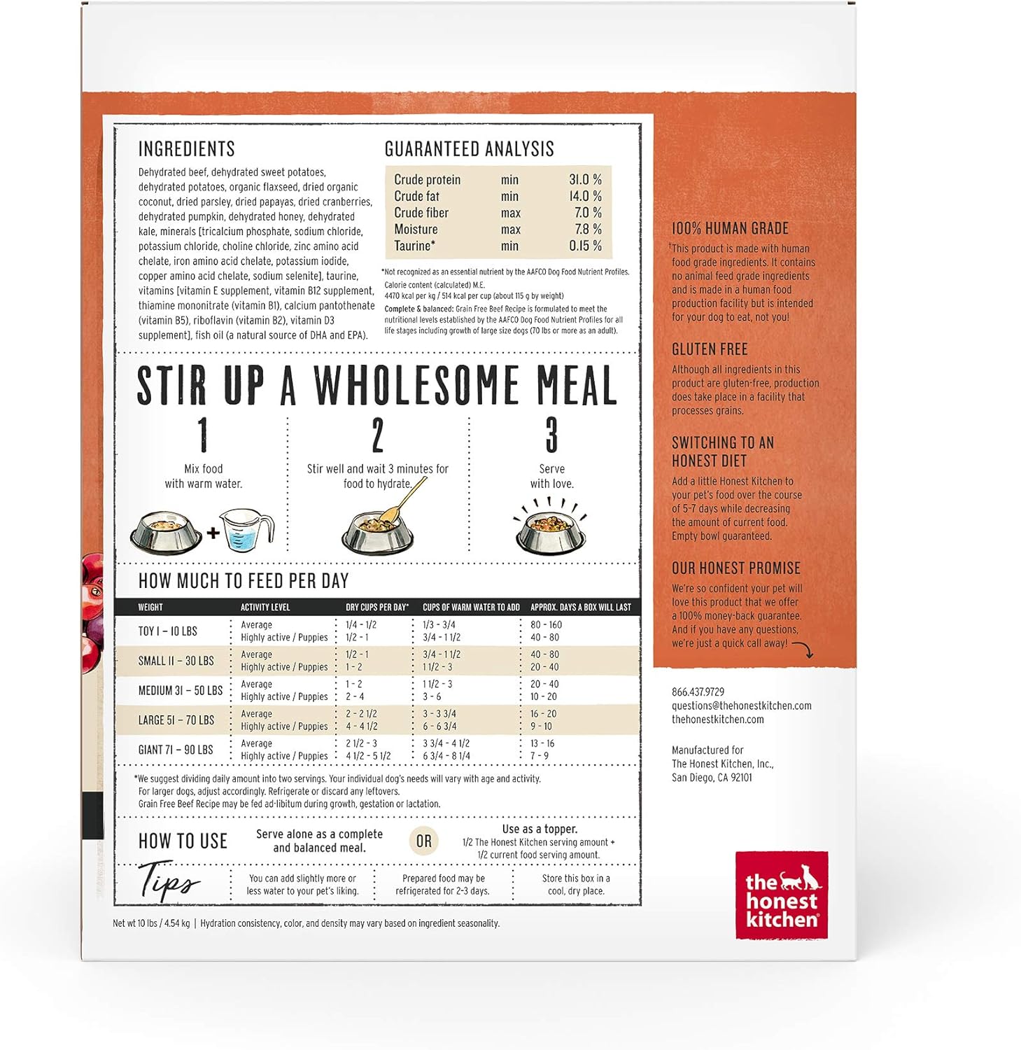 About this item Wholesome Homemade-Style Meal: The Honest Kitchen’s dehydrated dog food recipe is made with 100% human-grade, ranch-raised beef, sweet potatoes, and nutrient-rich vegetables like kale. This 10 lb box rehydrates to make 40 lbs of fresh, delicious food, perfect for serving as a complete meal or topping for dry kibble. Complete and Balanced Nutrition: Suitable for all life stages, including puppies, adult dogs, and nursing mothers, this grain-free formula provides balanced nutrition without any preservatives, by-products, fillers, GMOs, corn, wheat, or soy. Environmentally Conscious: As a Certified B Corporation, The Honest Kitchen meets rigorous standards of social and environmental performance, ensuring a positive impact on employees, communities, and the planet. n See more product details