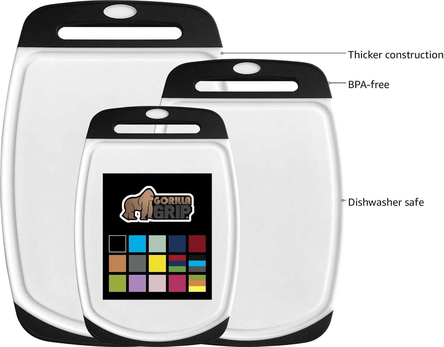 About this itemnULTRA DURABLE AND BUILT TO LAST: unlike wood or bamboo, these thick, nonporous boards are incredibly durable; wont splinter, crack or peel, even after many washes; no oiling or maintenance necessary; deep juice grooves help capture runoff liquid from messy ingredients; rubber border helps provide a secure grip on countertops; food grade and a great choice for all homesnSTAYS IN PLACE DURING PREP: make food prep easier than ever with the most durable cutting board; its slip resistant handle and rubber border help to reduce slipping and sliding on countertop surfacesnLARGER AND THICKER THAN OTHERS: 3 generously sized boards are extra thick; largest board measures 16 by 11.2 inches; medium board measures 13.8 by 9.6 inches; small board measures 11.8 by 8 inches; each board is .37 inches thick and combined, weigh 4.25 pounds; other boards are just .3 inches thick and weigh as little as 2.9 poundsnBPA FREE AND FOOD GRADE: each board is tested to comply with US regulations, food grade and food safe; wash in the dishwasher time after time and boards will not break downnREVERSIBLE DESIGN WITH DEEP JUICE GROOVES: each Gorilla Grip Cutting Board features a reversible design that allows you to chop on both sides to help prevent flavor mingling; boards also feature deep juice grooves on one side to help prevent countertop mess by catching runoff juices