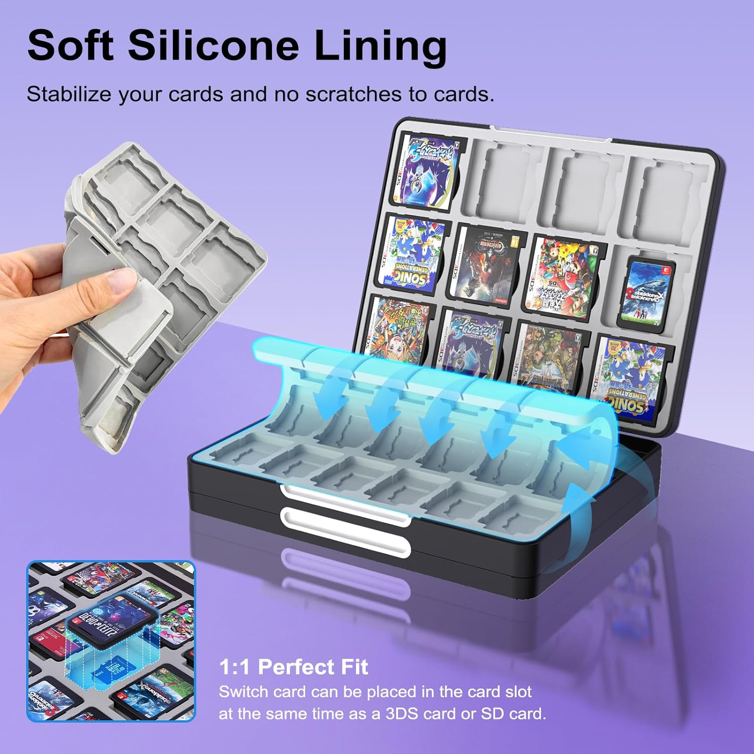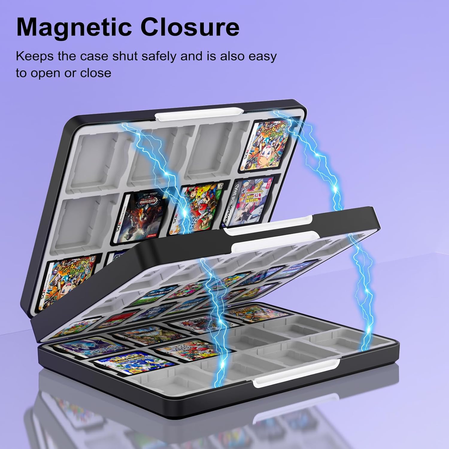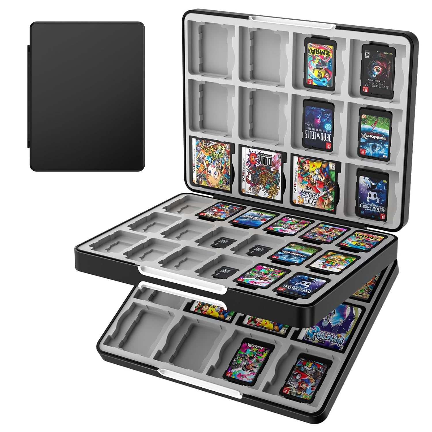 About this itemnOne-fit-all Switch Game Card Case: If you are a Switch fan with different game cards at hand, struggling to find an organizer that can neatly store all of them? Here is exactly what you’re looking for. Large capacity design allows you to store 24 3DS, 3DSXL, DS, DSi cards, 60 Switch cards, 36 SD cards, enough to meet your storage needs, no more need to buy various card cases to separately store themnSafe Magnetic Closure: With built-in strong magnetic clasp, the switch cartridge case closes securely, even if dropped from a height of 1-1.5 metres, the game cards will not be accidentally opened and scattered all over the place, it can well protect the switch game cards inside the box, easy to open and closenPremium Materials: The exterior is made of hard ABS material which is shockproof, scratchproof and rugged for ultimate protection. The soft silicone lining protects your precious cards from scratches, and 1:1 precise cutting holds your switch game cards securely in placenCompact and portable: This switch game case holder is compact and lightweight, so you can hold it in hand or put it in your pocket or bag when travelling, easy for you to enjoy gaming anytime, anywhere. Size: L× W×H: 6.34×4.92×1.3 in, 16.1×12.5×3.3 cmnVarious Patterns Available: The switch game storage case is printed with stylish and eye-catching pattern that won’t fade and damage, available in different patterns for you to choose from