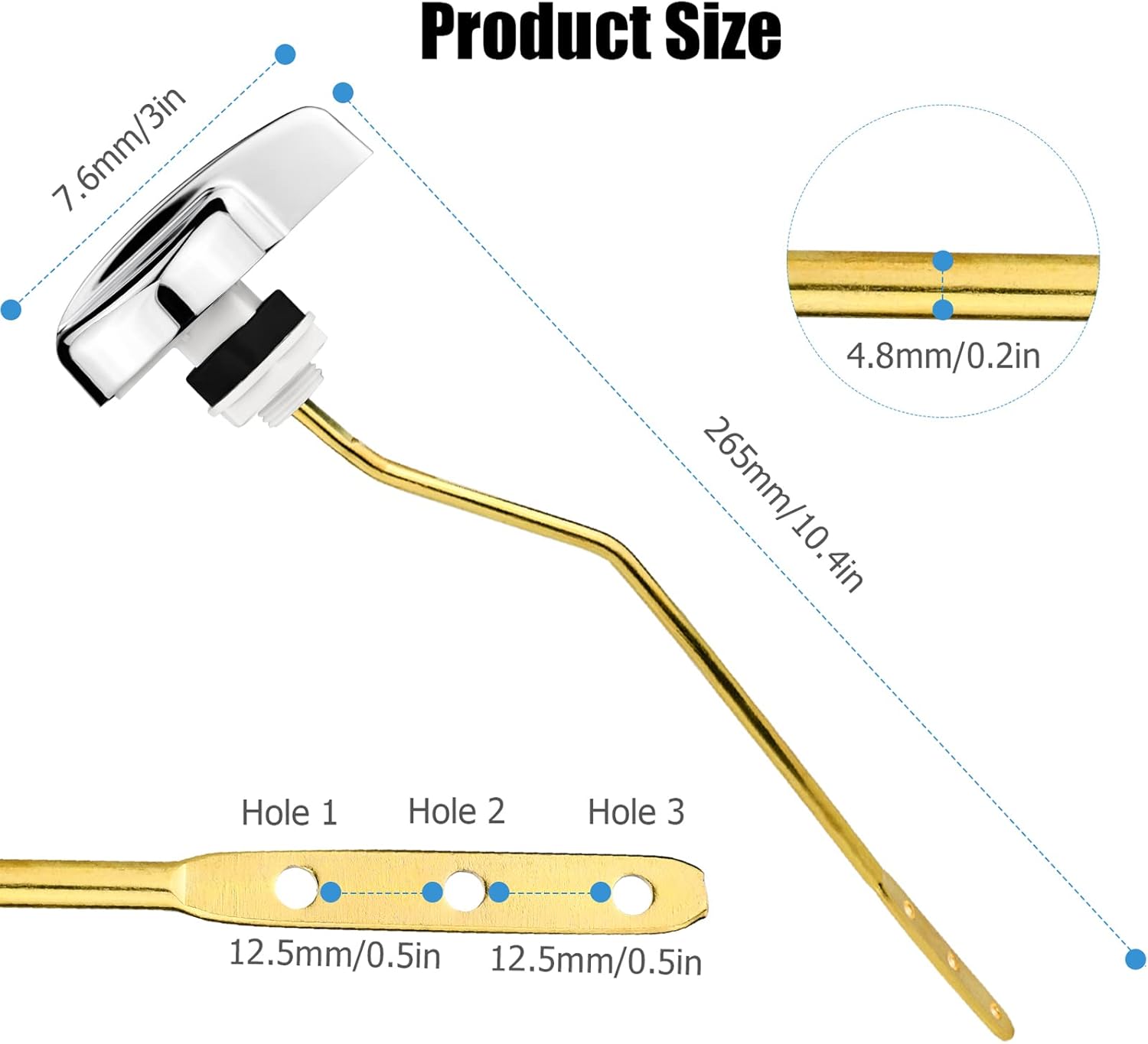 About this itemnUniversal Compatibility: Side mounted toilet handle with small curved lever is suitable for most common side mount toilet tanks such as TOTO Kohler. Please make sure to check the required lever type and size before purchasing.nStrong Durability: Toilet handle is composed of zinc alloy handle, copper stick, white plastic pile and rubber nut. The copper stick has been washed and tested for many times, which is firm and durable, not easy to rust, and can be used for a long time.nEasy to Install: Just remove the old parts and align the new replacement parts to properly install them. You can easily install them without maintenance personnel. The locknut helps prevent loosening over time. There are three holes at the end of the lever, and the length can be flexibly adjusted according to your toilet water tank.nPerfect Replacement: Effectively replace the damaged or rusty toilet handle to solve the flushing problem. Beautiful new accessories decorate your bathroom and refresh the old toilet.n100% Guarantee: All Ancable products come with our 100% No Questions Asked Guarantee. We care about only putting out high-quality products that satisfy your needs. If you have any questions, please contact us.n› See more product details