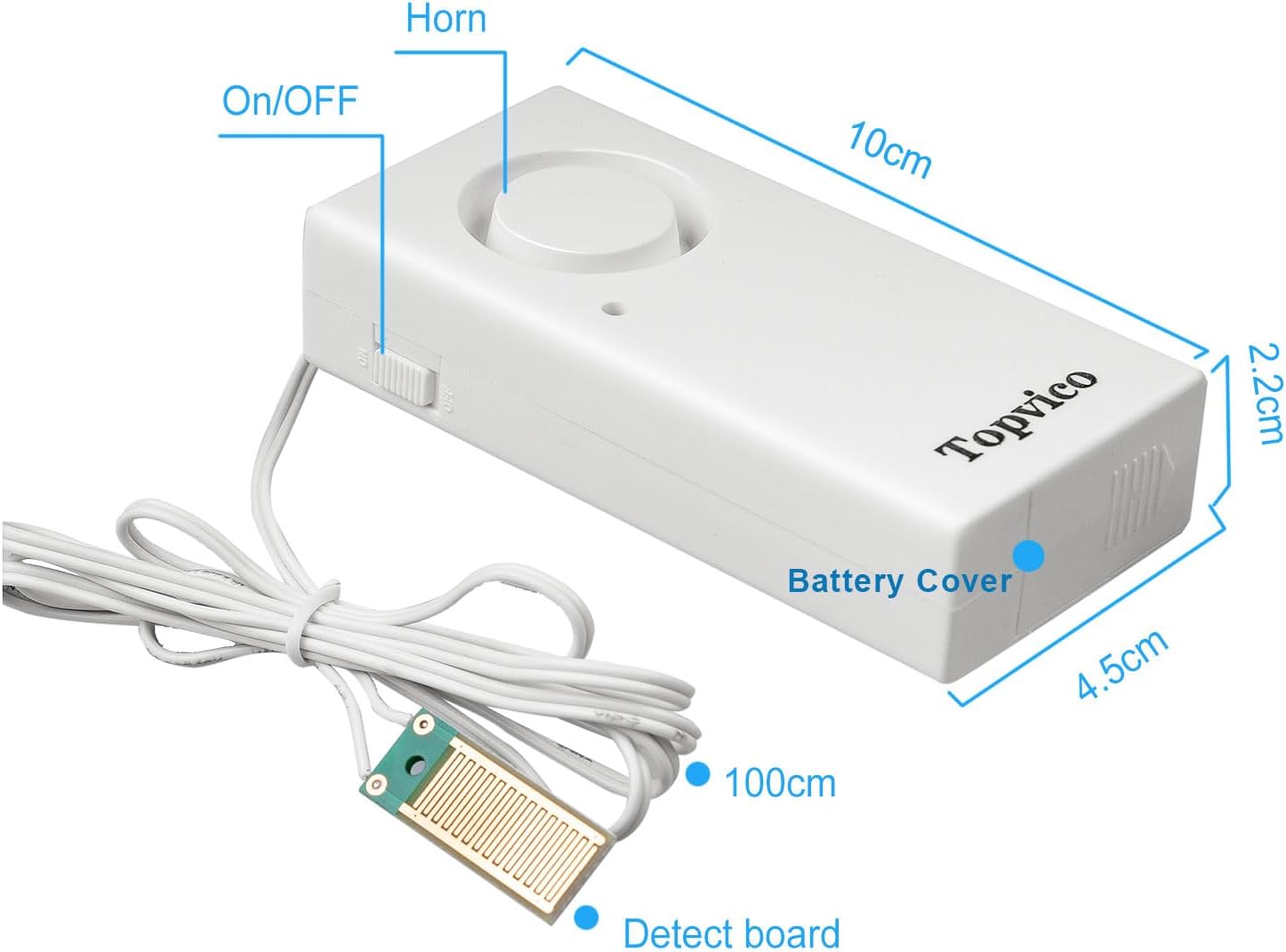 About this itemn120dB loud alarm voice, keep alarm to notice you or neighbors until the water dry or sensor turn off, low cost and effective water leak alarm to prevent water damage at your home and businessnHigh sensitive 24k plating detect board, repeated use after dry the boardnUpgrade to our double-sided paster / sticker for easy installation anywhere. Big part is for the host and the small part is for the water detection board. Good for install in RV, fixed well, not move when driving. There are two fixing styles optional for the detect board, as shown in the description photo. Choose between two fixing styles based on your needsn37.8 inches cable, easy extend more than 150 ft. of wire by user (normal electric wire available, not include), detect water anywhere corner, suit for basement, heater leak, underground, washing machine, kitchen, sump pump overflow, etcnSupply by 9V battery (not include, suggest use brand Alkaline battery), battery life will be about 12 months for normal use (low quality battery about 6 months, very high frequency alarm or testing, battery life will be shorter)n See more product details