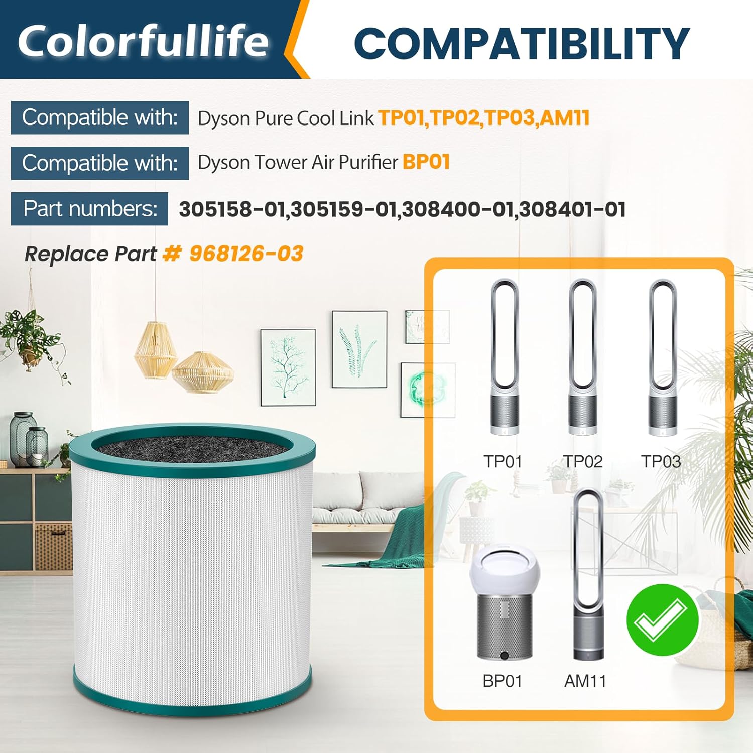 About this itemnDesigned to fit for for dyson air purifier filter replacements Compatible with Dyson Tower Purifier Pure Cool Link TP02, TP03, AM11 and BP01, ( Please verify the height of your filter to ensure that this is the correct filter ).nCompatible with Dyson Tower Purifier filter replacementnReplace Part # 305158-01, 305159-01, 308400-01, 308401-01nPackage include 2 HEPA filters + 1 brushnCompare to Part # 968126-03n See more product details
