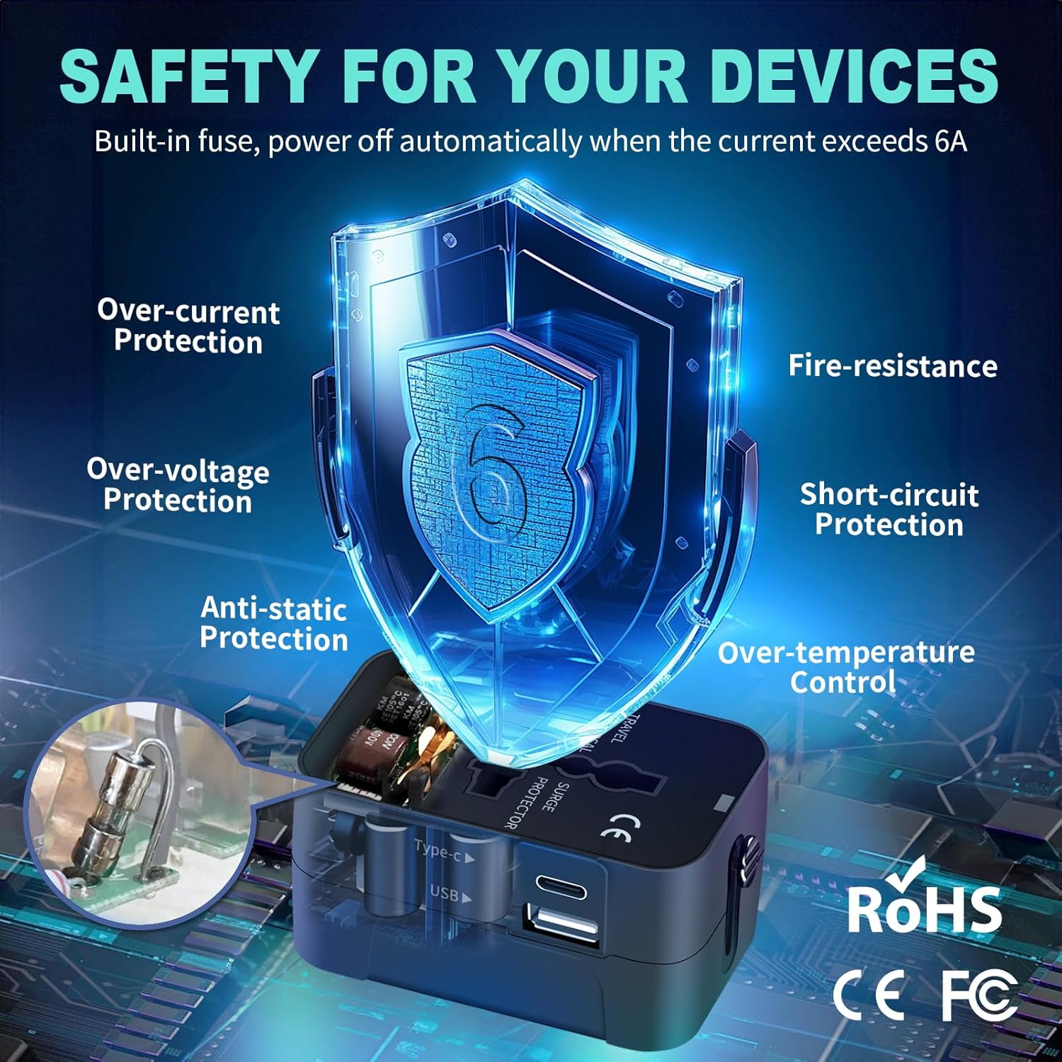 About this itemn?Universal Worldwide Charging?This travel adapter accepts plugs from More than 150 Countries with US/EU/UK/AU European Plugs like Thailand, New Zealand, Israel, Italy, Rome, France, Spain, Canada, China, Australia, India, Hong Kong, Argentina, Peru, Korea, Asia, etc.n?1 USB C and 1 USB A Port?USB type C charging port deliver fast charging speed. World plug adapter compatible with almost all USB Devices such as Apple IPone 14, Huawei, Samsung, Xiaomi and other Android phones, smart watch, ear phones, tablet, power bank, camera, game console and so on.n?Multiple Safety Protection?This global Power Adapter built-In safety shutters protect users from the direct touch of the live parts on the socket outlet. Built-in 6.3A fuse, automatically cuts off power when current exceeds rated load. Provide over-current, over-voltage, Short-circuit Protection, surge protection.n?All in One International AC Outlet?Detachable plug converter includes 5 Different input plugs and power sockets tightly to connect into 1 Adaptor. Easily charge several devices at once.n?Compact, Lightweight, Versatile?This small and light travel charger only weights 3.2oz, with small size 3.0*1.9*1.5 inches, easily fit into your luggage and suitcases or be taken aboard cruise ship. Travel essentials for globetrotters, overseas business, work, and students.n?Not a Voltage Converter?Power Rating 6A maximum. 100-240Vac (650W max. at 110Vac. 1300W max. at 220Vac). This charger adapter plug convert power outlet only, DOES NOT CONVERT electrical output current and VOLTAGE. Please check that the devices plugged into the adaptor are rated for the local voltage. The adaptor works for low power appliances that accept 110 or 220 DUAL VOLTAGE.