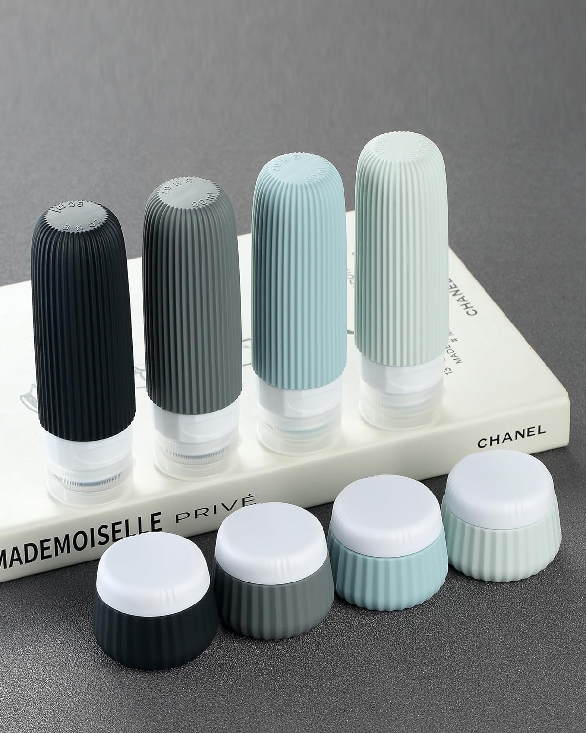 About this itemnTravel Size Toiletries: The set contains 4 pack silicone squeeze bottles and 4 pack silicone cream jars with Clear Makeup Bag.nTSA carry on approval: A set of travel containers in the same color palette, with capacities of 3oz and 1oz travel containers for toiletries, suitable for various skin care products, shampoo, conditioner, facial cream, body lotion, choose the container to fill according to your needs!nLeak proof travel bottle: It adopts three-layer leak proof design, which can prevent liquid leakage or overflow, and is firmly sealed to provide protection for your luggage and clothing without causing confusion. And help you squeeze to the last drop easily.nWide opening design: our refillable travel containers has a large opening, which can be easily filled with shampoo, conditioner or lotion and used, also it easily fits a brush to clean the inside of the tubes.nLightweight and Portable: All travel accessories are packed in a handy Clear Makeup bag, fits in any small space, easy to take on the go and save your toiletry space. Perfect for travel, vacation, plane trip and camp.