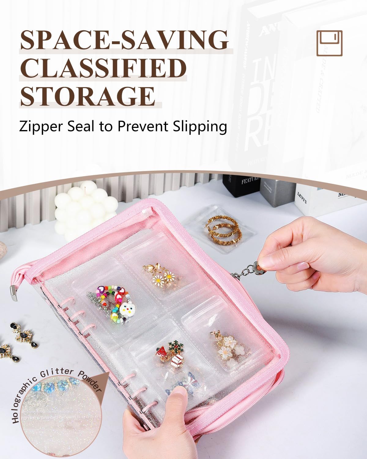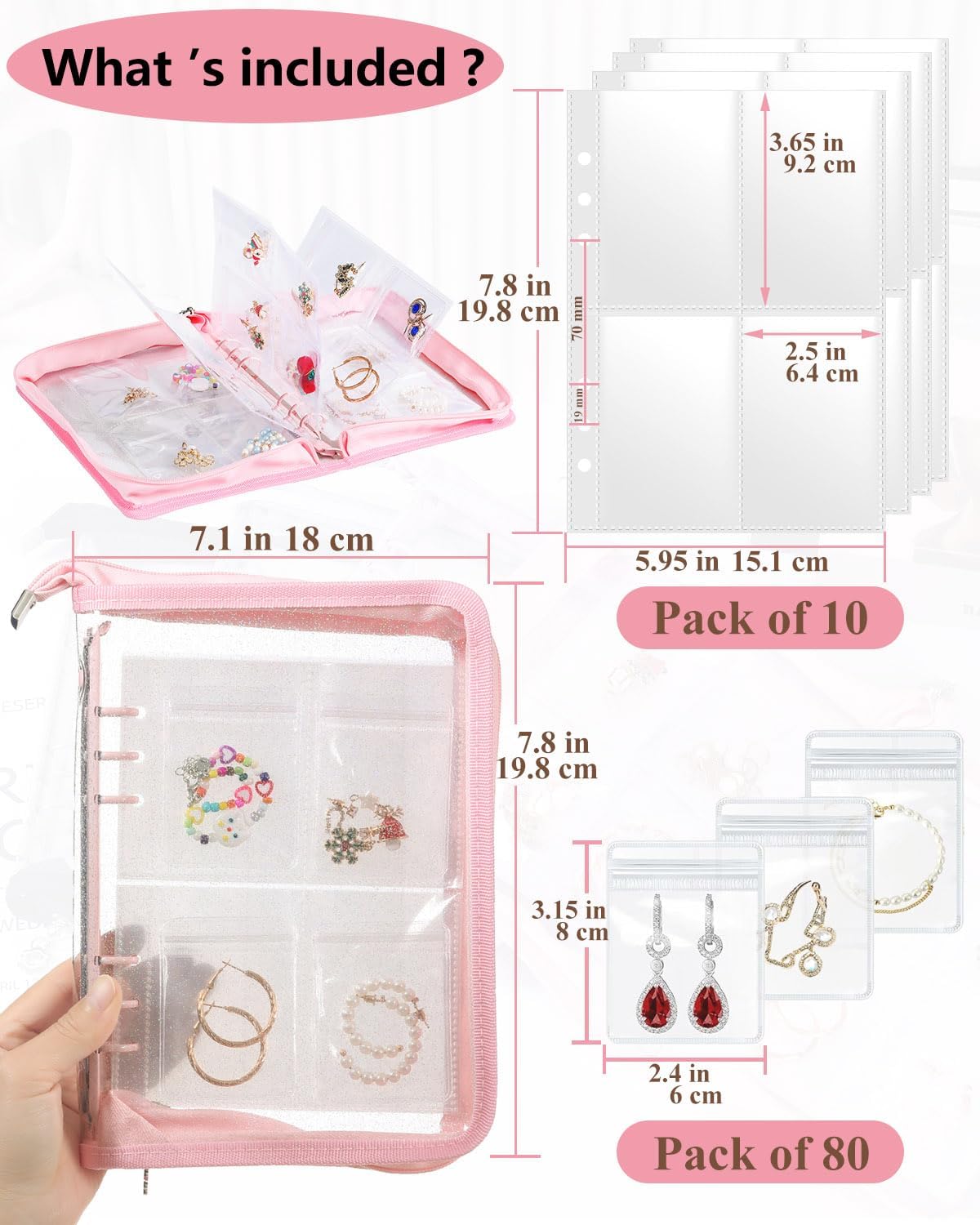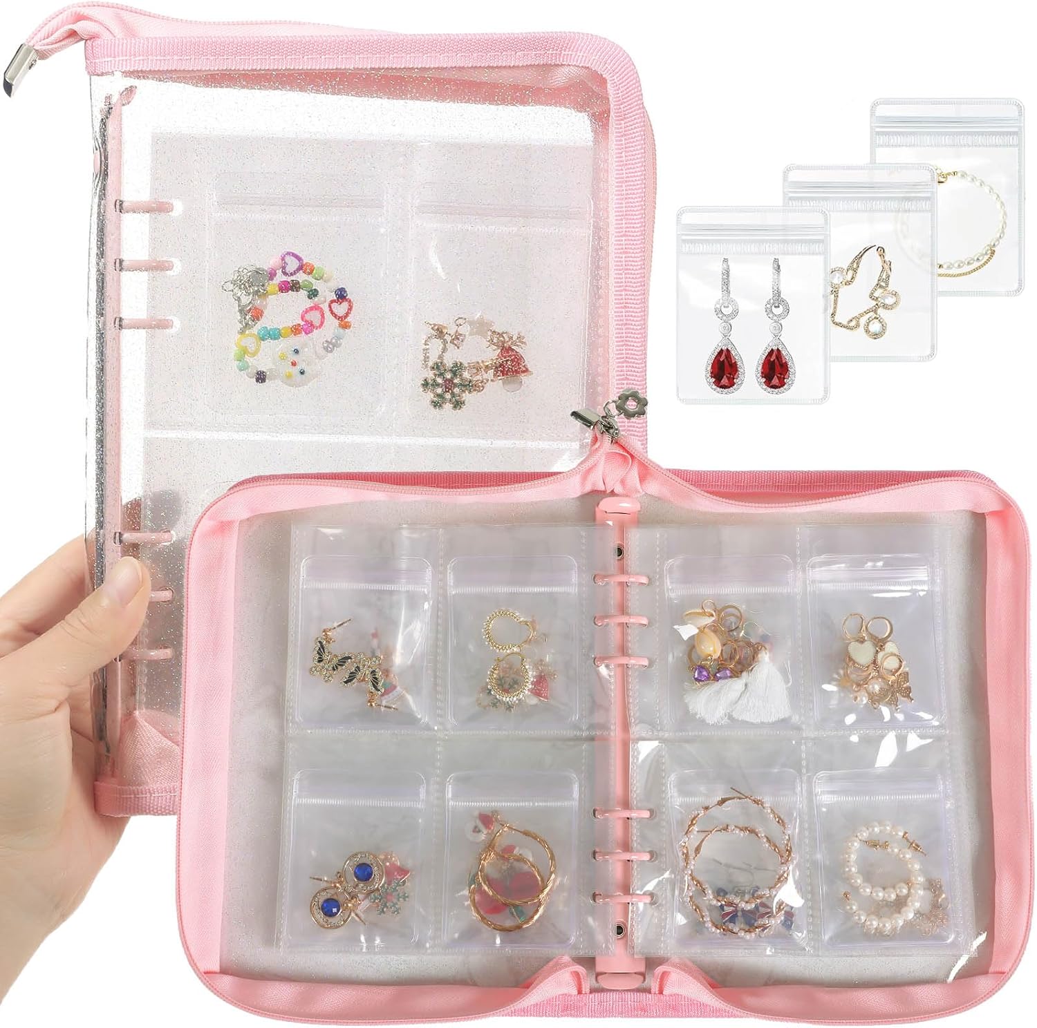 About this itemnSPACE-SAVING CLASSIFIED STORAGE: This travel jewelry organizer keeps your jewelry tidy and easy to access. With transparent pages, you can view each item without opening the jewelry pouch—perfect for organizing earrings, rings, necklaces, and more in one compact travel jewelry casenHIGH-CAPACITY, PROTECTIVE STORAGE: Featuring 10 inner pages with 80 grid slots and 80 jewelry separate pouches, this jewelry storage book offers ample space for all types of jewelry. Made from thick, scratch-resistant PVC, it provides waterproof and anti-tarnish protection to keep your jewelry in pristine conditionnFLEXIBLE, DETACHABLE DESIGN: The loose-leaf structure allows you to add or remove pages based on your needs, making it ideal for both small items and larger pieces. This flexibility ensures you have a tailored jewelry travel case that fits everything from delicate pieces to chunky accessoriesnTRAVEL-FRIENDLY AND SECURE: With a durable zipper and compact design, this travel jewelry bag is made to prevent jewelry from slipping or getting tangled. Its lightweight profile makes it easy to pack in your suitcase or carry-on, perfect for any journeynGIFT-READY FOR ALL OCCASIONS: This jewelry storage organizer case makes an excellent gift for women and teens, ideal for birthdays, holidays, or anniversaries. The travel jewelry case is a thoughtful choice for anyone who loves to keep their jewelry organized and travel-readyn› See more product details