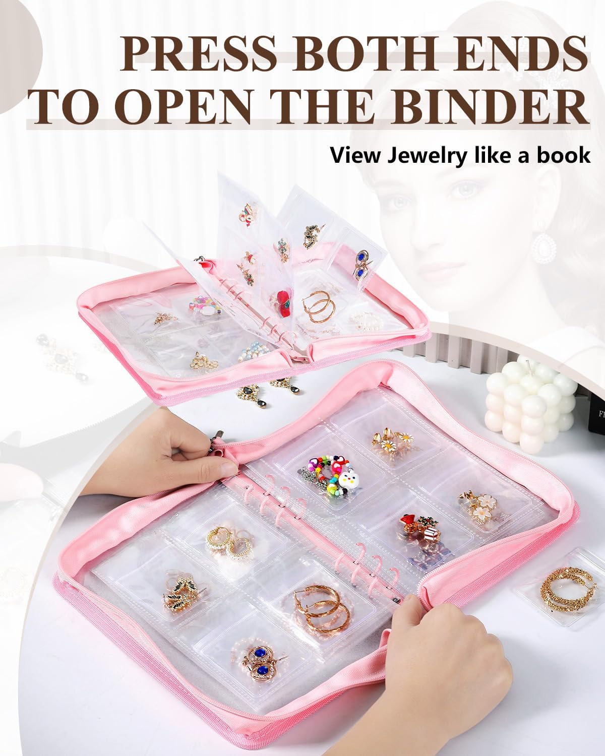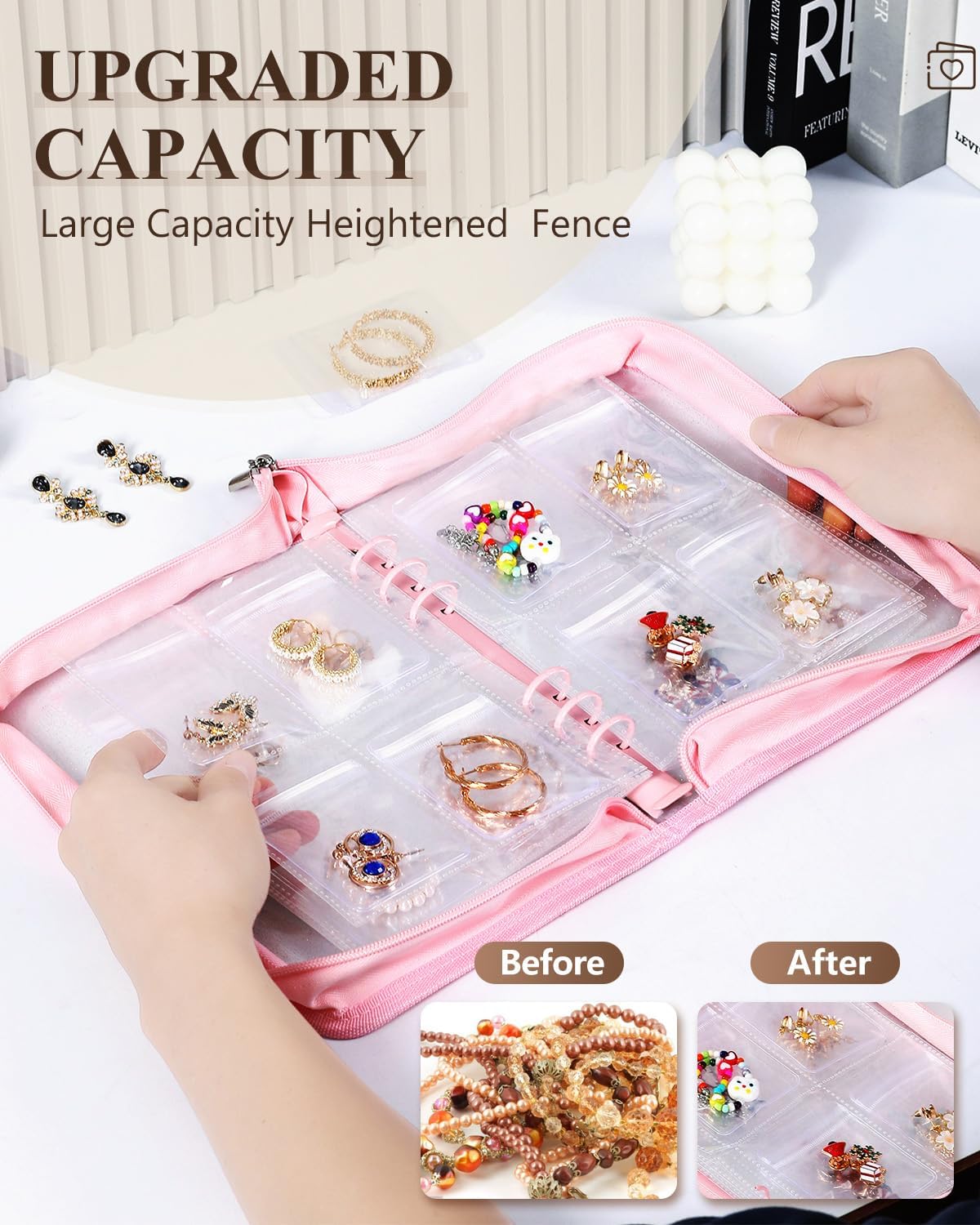 About this itemnSPACE-SAVING CLASSIFIED STORAGE: This travel jewelry organizer keeps your jewelry tidy and easy to access. With transparent pages, you can view each item without opening the jewelry pouchperfect for organizing earrings, rings, necklaces, and more in one compact travel jewelry casenHIGH-CAPACITY, PROTECTIVE STORAGE: Featuring 10 inner pages with 80 grid slots and 80 jewelry separate pouches, this jewelry storage book offers ample space for all types of jewelry. Made from thick, scratch-resistant PVC, it provides waterproof and anti-tarnish protection to keep your jewelry in pristine conditionnFLEXIBLE, DETACHABLE DESIGN: The loose-leaf structure allows you to add or remove pages based on your needs, making it ideal for both small items and larger pieces. This flexibility ensures you have a tailored jewelry travel case that fits everything from delicate pieces to chunky accessoriesnTRAVEL-FRIENDLY AND SECURE: With a durable zipper and compact design, this travel jewelry bag is made to prevent jewelry from slipping or getting tangled. Its lightweight profile makes it easy to pack in your suitcase or carry-on, perfect for any journeynGIFT-READY FOR ALL OCCASIONS: This jewelry storage organizer case makes an excellent gift for women and teens, ideal for birthdays, holidays, or anniversaries. The travel jewelry case is a thoughtful choice for anyone who loves to keep their jewelry organized and travel-readyn See more product details